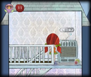 Her er er utsnitt fra nivå 1 etter at spilleren har fått satt igang fyrovnen. Før huset kan smelte helt må spilleren finne nøkkelen til neste nivå. Den har jeg tenkt skal ligge i en av rammene på veggen i 2.etage. Jeg er ikke kommet fullt så langt enda, men det kommer.