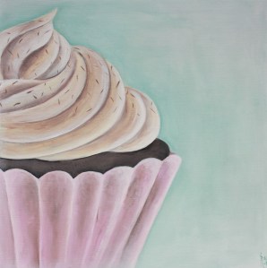Nå har omsider cupcakes dilla begynt å slå rot nede i kjelleren hos Panduro Hobby på Xhibition.  Mange nyheter er i disse dager på vei inn i hyllene på jobb og blant dem har får vi en del cupcakes og bake tilbehør. Med ny katalog i anmarsj og nyheter på vei ut i butikken er det også på tide med nye utstillinger rundt om i butikken. Noe jeg har ansvar for å sette opp. Men vi kan jo ikke bake muffins og cupcakes for så og stille dem ut. Derfor fikk jeg en idé om at jeg kunne male noen bilder av cupcakes som jeg kunne sette opp i en utstilling med noen sammen med noe av vårt cupcakes sortiment. Min supre sjef Liv Berit syntes det hørtes ut som en flott idé – og da var det jo bare å sette i gang med malearbeidet. Og resultatet ser du nedenfor.