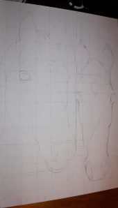 ‘Skisse’ til maleriet. På skissen til venstre har jeg laget et rutenett som følger forskjellige detaljer i bildet. Dette gjør jeg for kunne overføre motivet fra A4 størrelse over på et 70x100cm stort lerret på en mest mulig nøyaktig måte. Dette rutenettet hjelper meg med se hvor lange linjene er og hvor store avstandene er og så videre. Noe jeg synes er noe vanskeligere på frihånd, men selfølgelig ikke umulig – bare noe mer tidkrevende. Jeg overfører det samme rutenettet over på lerretet i en utregnet målestokk som passer til lerretets størrelse.