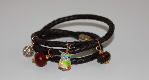 Etter å ha laget smykker og armbånd etter ferdig design fant jeg ut at jeg skulle prøve meg litt på egenhånd. Inspirert av armbåndene Auspicious Year gikk jeg til innkjøp av perler av halvedelsten og metall og lavastein i ulike farger, smykkestrikk, wireklemmer og et lite ugle anheng. Auspicious Year armbåndene er laget på nylonstråd og låsen knyttes i makramé-stil. Jeg tenkte at jeg heller ville prøve meg på å lage elastiske armbånd for å slippe ‘dinglende tråder’ fra ‘makramé låsen’. Noe jeg syntes fungerte ganske bra: veldig lett og ta på, og like lett og ta av. Neste smykkeprosjekt tror jeg blir et armbånd inspirert av Charms of charms, med skinnsnor og et par charms av halvedelsten perler og sølvfarget lås og staver. Men før det tror jeg kanskje jeg må få malt litt mer. Inntil da: her er bildet av mine armbånd: