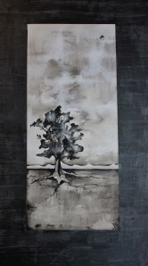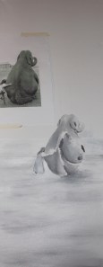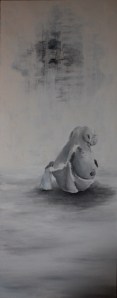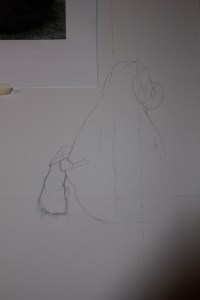 På dette bildet har jeg jobbet med en mixed media teknikk hvor jeg lager flere lag i tradisjonelle teknikker, som tegning og akvarell, for så og sette det sammen i photoshop. Jeg tegner først et bilde med blyant og jobber meg frem med skygger og detaljer til jeg har et resultat jeg liker. Deretter skanner jeg dette inn med en a3 skanner og lagrer det på dataen (smart å huske ettersom denne tegningen kan bli skadet i neste trinn). Det neste jeg gjør er å legge tegningen på et lysbord og legge et bra kvalitets akvarellark oppå tegningen. Lysbordet hjelper meg til å se tegningen gjennom arket. På akvarellarket maler jeg litt skygger og konturer med akvarellmaling – med nokså løse og ledige strøk. Jeg ønsker ikke å få frem perfeksjon i skyggeleggingen eller perfekte former, men ønsker å skape litt farge og liv i bildet. Deretter (når det er tørt) skanner jeg det inn på dataen.