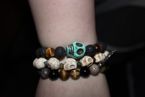 I det siste har det blomstret opp en ny trend med hodeskaller i smykker. Panduro Hobby fikk i forrige uke inn flere flotte fargesprakende og spennende perler og hodeskaller; og da måtte jeg nesten lage meg noen nye armbånd. Jeg har latt meg inspirere av bilder fra nettet hvor det er utrolig mye spennende, men jeg har laget min vri med perler som jeg synes er spennende og stilige: