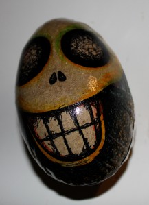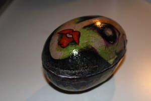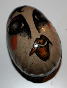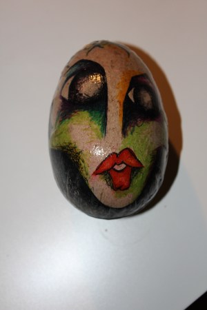 I dag har jeg brukt denne nye malingen til å male nok et påskeegg. Jeg valgte først å male egget i et abstrakt uttrykk i gule og rosa toner – veldig likt ‘gomp-fargene’. Deretter begynte jeg å male to øyne på toppen som etterhvert fikk et klovneansikt rundt seg inspirert av Marianne Aulies klovner. Min stil når det kommer til akryl er i grunnen veldig glatt og bearbeidet. Jeg er veldig pirkete og jobber vanligvis fargene inn i hverandre og ‘visker’ bort eventuelle kanter og linjer og jobber med myke overganger. Jeg klarer liksom ikke helt å løsrive meg og la en strek være slik den er i det penselen treffer lerretet. Nokså stor kontrast til hvordan jeg opplvere Aulies bilder. Og det er nok derfor jeg blir så fasinert over hennes bilder – fordi de er så annerledes fra det jeg gjør.