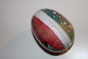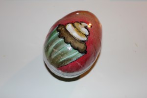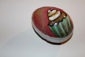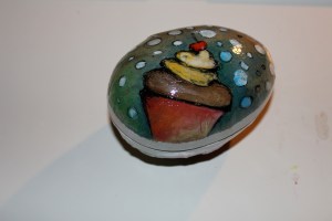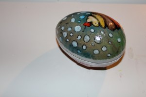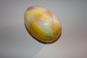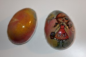 For at egget skal holde seg fint og få en blank overflate har jeg først sprayet det med en varnish for akvarell og deretter lakket 2-4 lag med blank lakk: så holder det seg fint lenge!