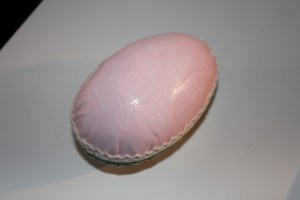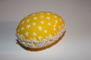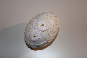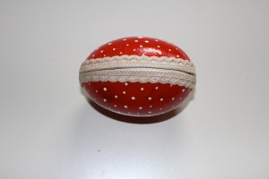 Endel av de eggene jeg har dekorert kommer i trepakninger hvor eggene da kommer i tre forskjelllige størrelser. Det minste egget er veldig søtt (men kanskje ikke det kjekkeste påskeegget å få ettersom det kun kan romme 1-3 smågodt ting) – og jeg måtte bare lage et lite polkadott egg med blonder: