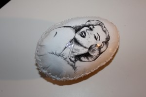 Med tåke som dekket for solen i morgentimene fant jeg frem til noen bilder av Marilyn Monroe på google. I dag var det blyanten som skulle få jobbe litt. Med egg grunnet med gesso hadde jeg laget meg det perfekte hvite lerret for litt tegning. Som jeg sa i går fikk jeg det for meg at jeg skulle lage egg med Marilyn Monroe portrett – hvorfor vet jeg enda ikke, men hun gjør seg bra i kunst og har jo blitt et ikon vi alle kjenner igjen. Jeg endret på størrlesen til bildene i photoshop slik at de ville komme ut i en størrelse som ville passe til eggene. For å lage meg en kontur å følge fylte jeg baksiden av bildene med en veldig myk blyant (6B) for å lage en slags ‘blåpapir-teknikk. En svært ok teknikk om man skal tegne portrettet i 1:1 størrelse med det bildet man har og man ikke kan benytte lysbord (eller rett og slett ikke har det). Jeg la bildet opp på egget og tegnet konturer med en nokså hard trykkblyant. Ettersom egget ikke har en rett flate å tegne på valgte jeg ikke å tape fast bildet, men hodt det fast med to fingre som jeg forflyttet med blyanten og håpet på at jeg klarte å holde det noelunde på samme plass.