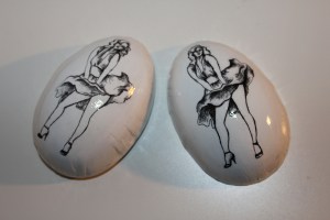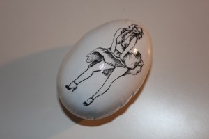 Når jeg var ferdig med selve tegningen gikk jeg over hele egget med knettgummien for å prøve å få bort overflødig granitt som var kommet litt rundt om på egget. Gessoen gir en litt grov overflate og det ble litt blyantstøv som kom utenfor selve tegningen. Da jeg følte jeg hadde fått bort det meste fant jeg frem ‘varnish’ for vannfarger og sprayet over egget i håp om at det som fungerte på akvarellen også ville fungere på blyanten – og det fungerte veldig fint. Etter å ha sprayet dem og latt dem tørke gikk jeg over med noen lag med blank lakk for å gi dem en tykk og glansfull overflate (som også beskytter selve tegningen).