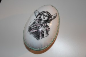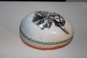 For min del så tenkte jeg at akvarellens uttrykk hadde vært perfekt for det egget jeg ønsket å lage nå og at det ikke kunne skade å prøve. Så da gikk jeg igang. Jeg tegnet først motivet opp med kalligrafipenn og permanent blekk, for så og starte med akvarellen. De første lagene med akvarell ble sugd inn i pappen og kom ikke spesielt godt frem. Men ettersom jeg ville jobbe med denne teknikken fortsatte jeg å legge på flere lag – og det funket! Det viste seg å bli veldig fint på egget og gav det myke uttrykket jeg ville ha. Så om noen skulle spør meg en annen gang kan jeg si at det går om man kan jobbe i flere lag. Slik ble egget mitt: