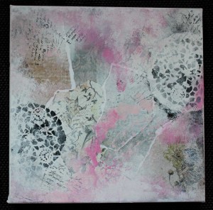 Videre har jeg brukt doolies (små kakeservietter) som sjablonger og laget svarte blondemønstre rundt omrking lerretet: