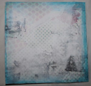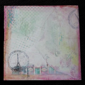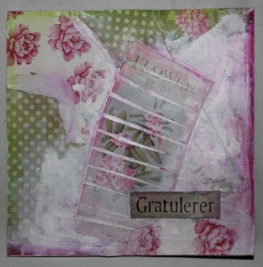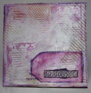 Jeg begynte med å rive opp biter av designark på 15x15cm og limte dem på kortet som en collage bakgrunn. Deretter brukte jeg en malekniv og la på litt gesso på deler av formatet, jeg smurte også noe av gessoen ut ved å bruke fingeren. Etter dette stemplet jeg litt vilkårlig rundt på formatet og laget til farget kant på kortet ved å bruke neocolor vannløslige fargestifter. Tilslutt laget jeg til en ‘tag’ med ordet gratulerer montert på en papirbit med rub on stickers.