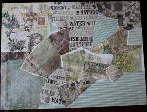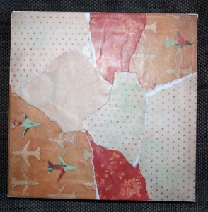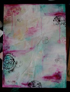1. Først finner jeg frem ulike designark med farger og mønstre som skaper en spennende og fin helhet sammen. Disse river jeg opp i biter og limer på lerretet ved å bruke matt medium gel (medium for akrylmeling som jeg har lært man kan bruke til flere ting ved å se på youtube…).
