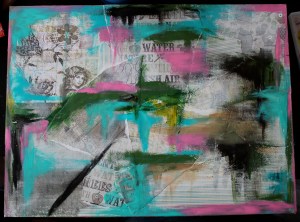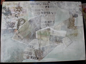 2. I neste omgang smører jeg på med litt gesso og maling over papirene. Her er det bare klasket på litt tilfeldig både ved bruk av pensel og ved bruk av fingrene. Jeg prøver å la noen felter av papiret stå igjen urørt, men har også lært at man faktisk kan bruke babyservietter til å ‘vaske’ seg ned gjennom lagene om man skulle føle at en har dekket for mye av bakgrunnen. Når det er sagt er det også viktig å huske på at mye av det en lager til i begynnelsen og bakgrunnen vil forsvinne etterhvert, men det er en del av prosessen og er med på å skape teksturen og dynamikken i bildet.