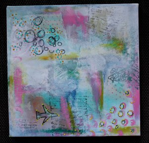 3. Her har jeg lagt enda mer mailng på lerretet og skapt ‘renninger’ ved å la våt maling (blandet ut med mye vann) renne nedover lerretet. Jeg har videre laget små ‘skribliser’ på lerretet ved bruk av neocolor fargestifter. For å sette fargen på lerretet og unngå at de skal flyte ut ved senere påføring av maling (disse er vannløslige som akvarellblyanter) har jeg forseglet dem med litt matt medium gel. Deretter har jeg dabbet litt hvit gesso over for å dempe dem litt: