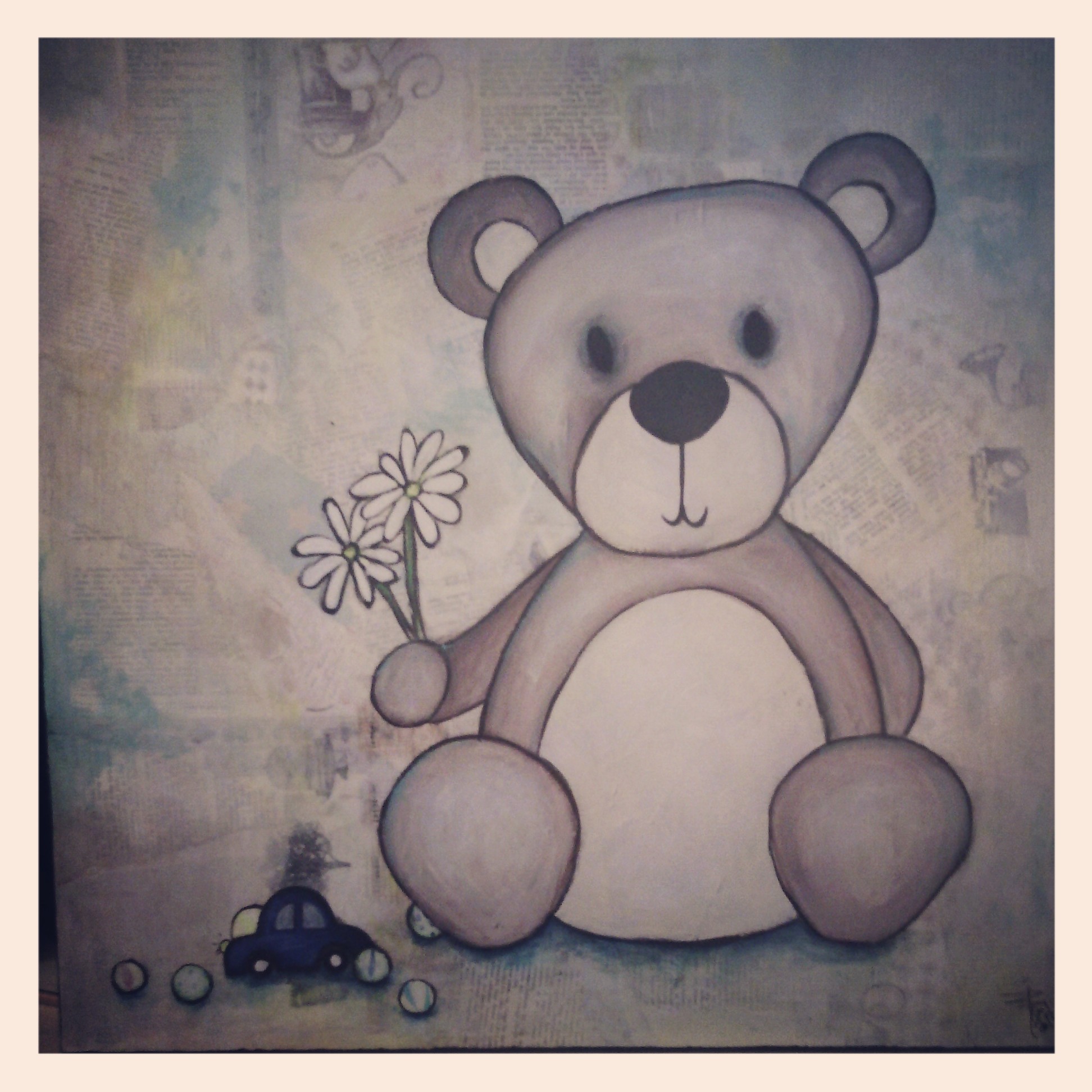 I våres fikk jeg flere gode nyheter, begge mine søstre er gravide og mine gode venninne er gravid. Snart omringes vi av mange søte små babier!  Jeg gleder meg veldig mye. Inspirert av omgivelsene har jeg laget endel kunst for barn, bilder til barnerommet eller lignende. Min herlige nevø, Benjamin, falt for bilde med bamsemotiv.