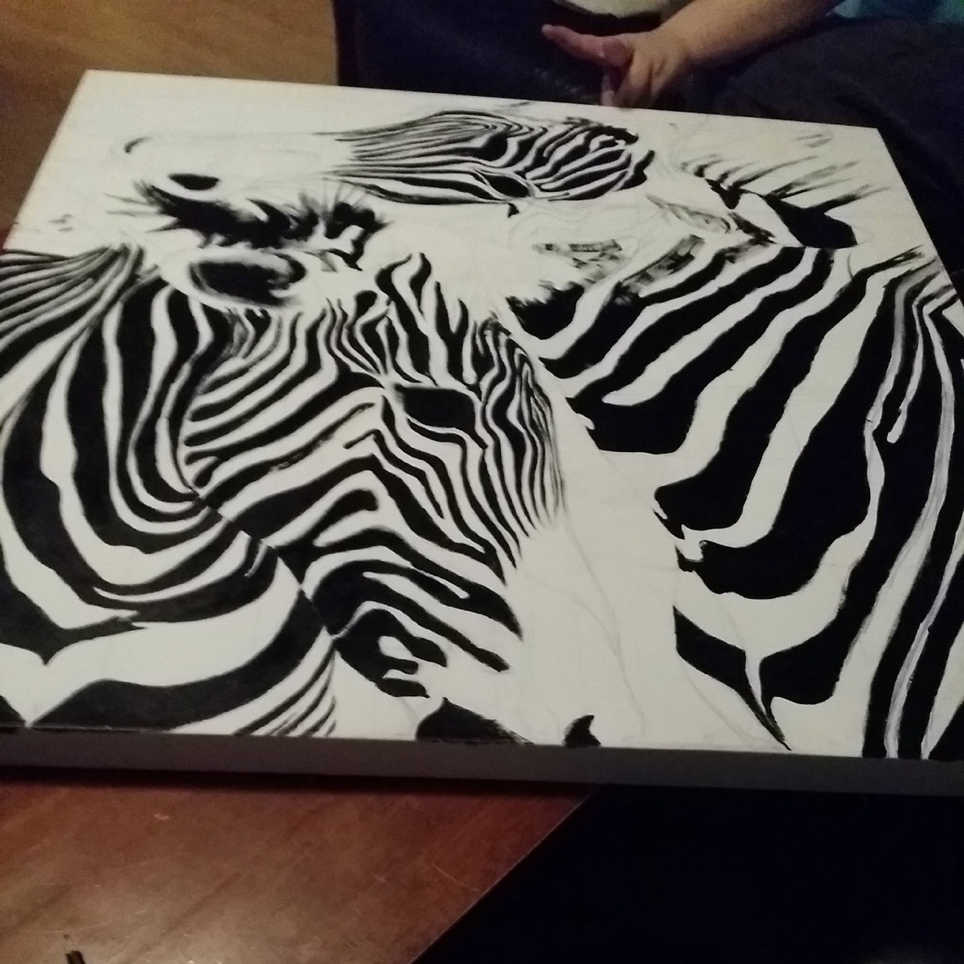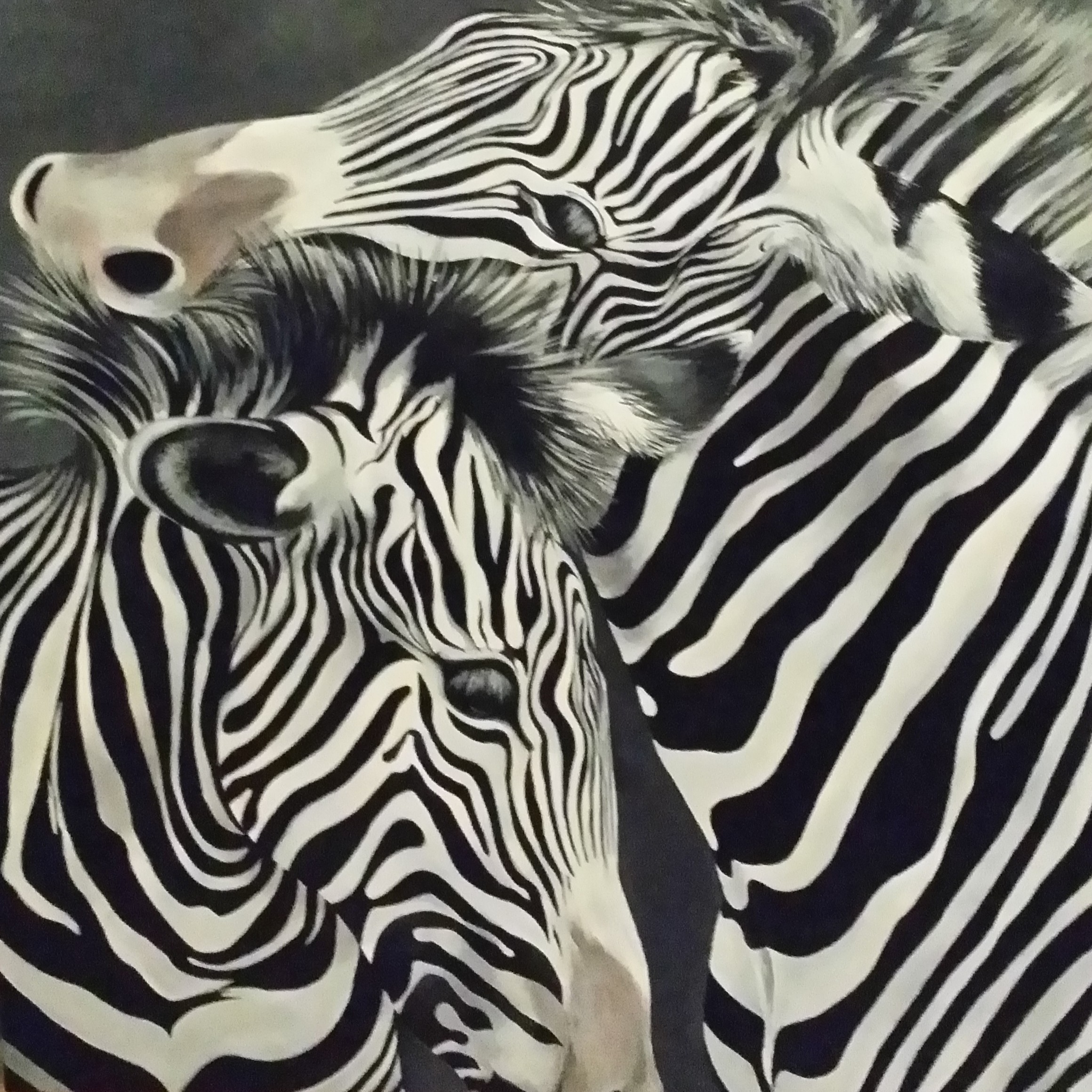 For flere år siden laget jeg et bilde på bestilling til min beste venninne. Hun hadde sett et sebra bilde på ikea som hun likte veldig godt, men tenkte det var kjekkere med et bilde malt av noen hun kjente fremfor et ferdig bilde som blir saolgt i tusenvis av eksemplarer. Det var et morsomt oppdrag og jeg ble nesten litt overrasket av resultatet. Jeg lette på internett etter bilder av sebraer og fant et hvor jeg valgte å ta utgangspunkt i et utsnitt av bildet som passet lerretets format (kvadratisk). Formatet var ca 90*90 eller 100*100 (husker ikke helt). Når jeg arbeider med formater i den størrelsen fokuserer jeg på detaljene mens jeg jobber med bildet – heltheten ser jeg først når jeg tar noen steg tilbake og ser bildet fra en viss avstand. Dermed blir resultatet ofte overraskende – selv for meg som har jobbet med det hele veien. Da sebra bildet var ferdig ble jeg nesten litt overveldet av hvor skremmende realistisk og levende det ble. Jeg må innrømme at jeg ble veldig fornøyd med resultatet:
