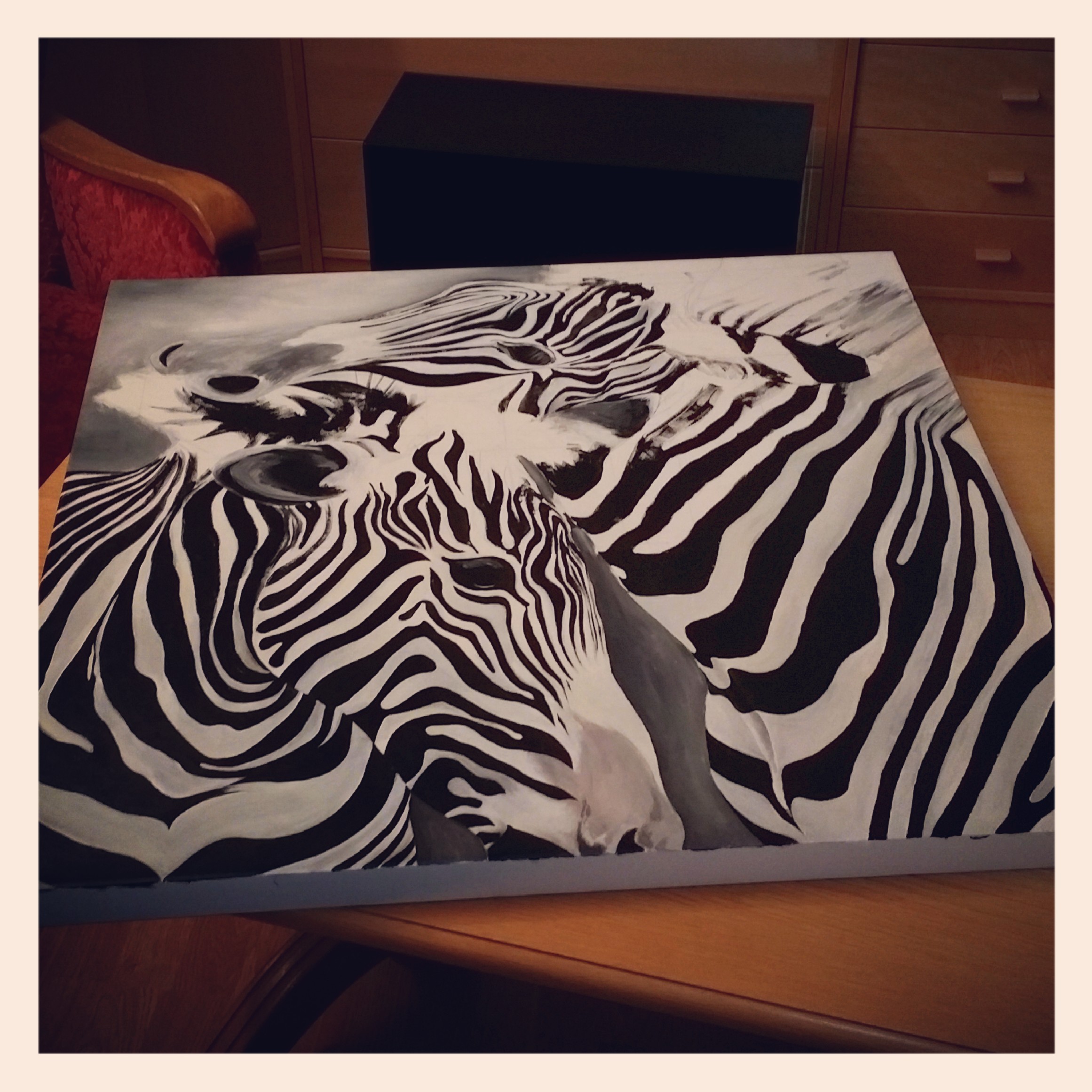 Når man er fornøyd med eget arbeid er det selvfølgelig ekstra kjekt når andre mener det samme. Min venninne ble veldig fornøyd med bildet og det har nærmest hatt en hedersplass i stuen siden hun fikk det. Noe jeg naturligvis synes er veldig kjekt. I høst valgte min venninne og hennes kjæreste å selge huset sitt og flytte til en annen by. Og her er det som er ekstra gøy for meg: Kjøperen av huset ønsket gjerne å kjøpe bildet av min venninne, men hun ville ikke selge det. Hun gav derimot kjøperen mitt nummer og ikke lang tid etter fikk jeg en forespørsel om å lage et sebrabilde for henne. Så GØY!! Jeg hadde litt prosjekter på gang før jul, samt en betennelse i armen som ikke alltid er helt heldig for malerarbeid, så jeg takket ja til oppdraget dersom det gikk fint at det kunne vente til nyåret – og det kunne det. Jeg ønsket ikke å lage det samme bildet om igjen, så jeg tok en ny runde på internettet og fant et nytt utgangspunkt for bildet (jeg sa naturligvis ifra når jeg fikk bestillingen om at det ikke kunne bli det samme motivet – og det gikk fint så lenge motivet ble en eller flere sebraer).
