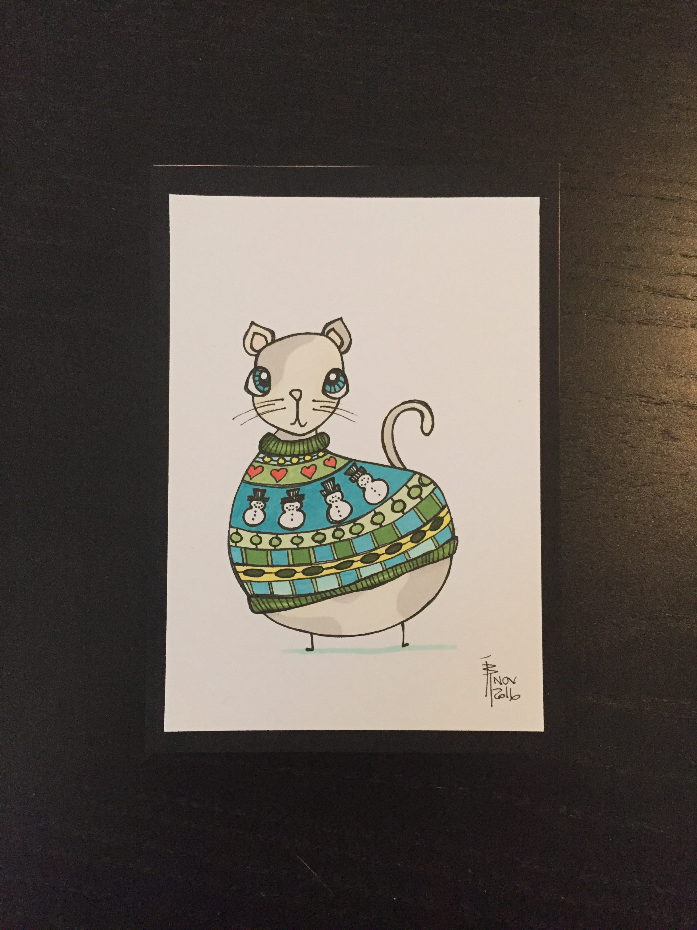 Bilder under er av meg og mine søstre og min yngste niese. Vi tok bilder på navnefesten hennes og på et av bildene kikket alle 4 ned i gulvet. Jeg fikk en ide om å tegne noe inn på bildet slik at det ser ut som vi ser på noe spesielt-men endte imidlertid opp med å male et akvarellbilde av det hvor jeg også malte inn en hund med nisselue som en julehilsen til en vi er veldig glad i.