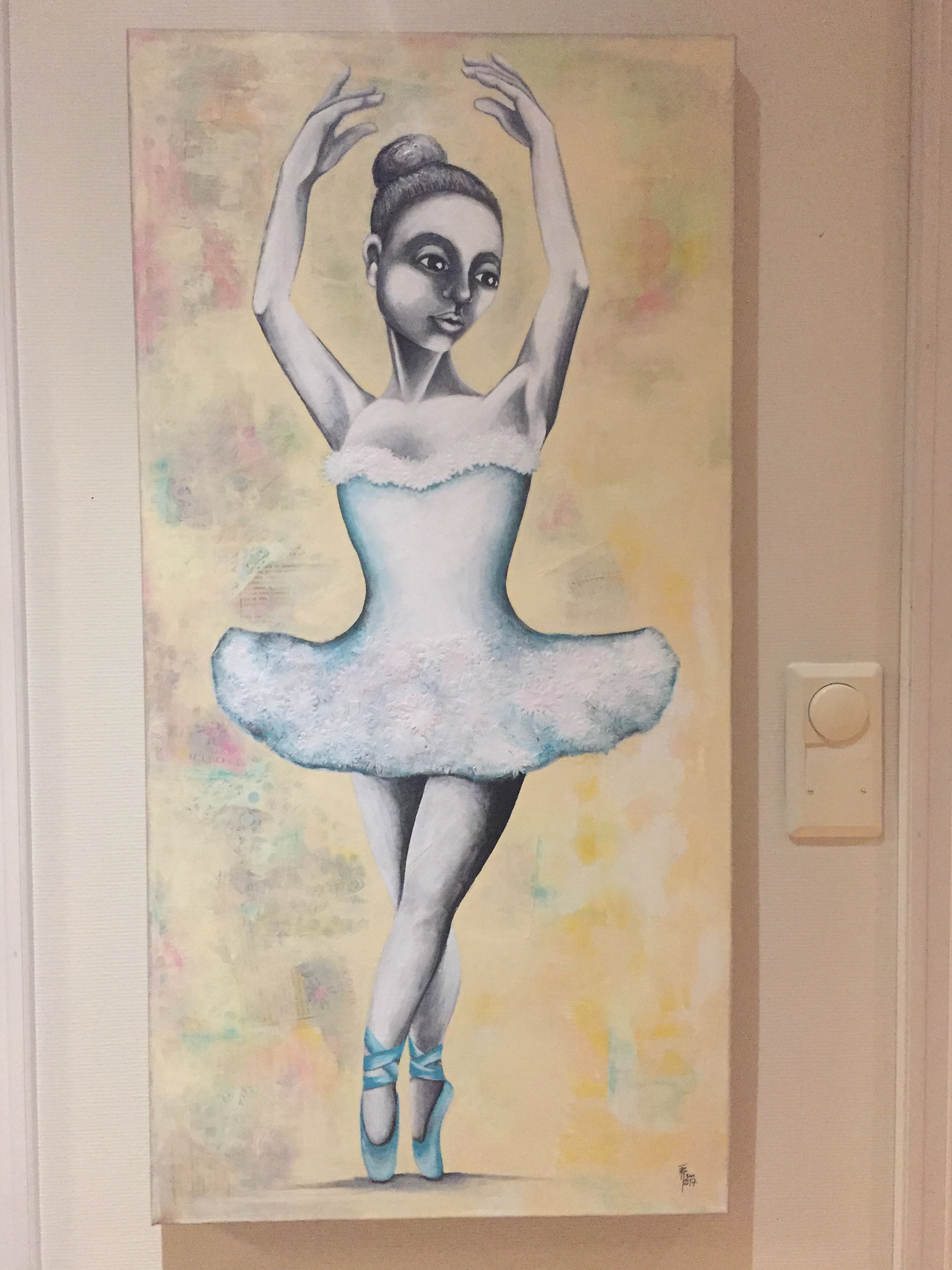 To ballerinaer. Vet ikke hvorfor, men fikk en ide om at jeg ville male ballerinaer. Jeg malte hun i grått først. Syns bildet ble mer finslig enn jeg hadde tenkt, så jeg malte et nytt mindre bilde. Der valgte jeg farger og stil som er litt mer i min gate☺️