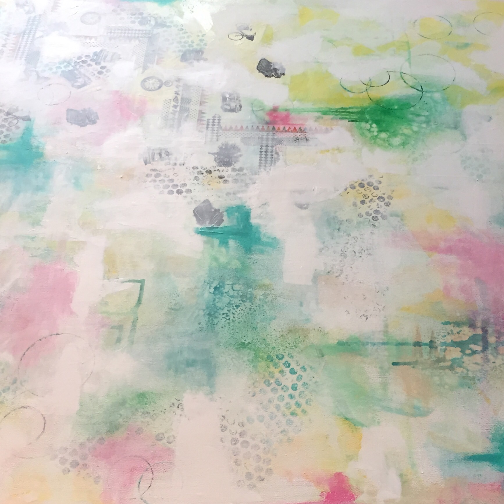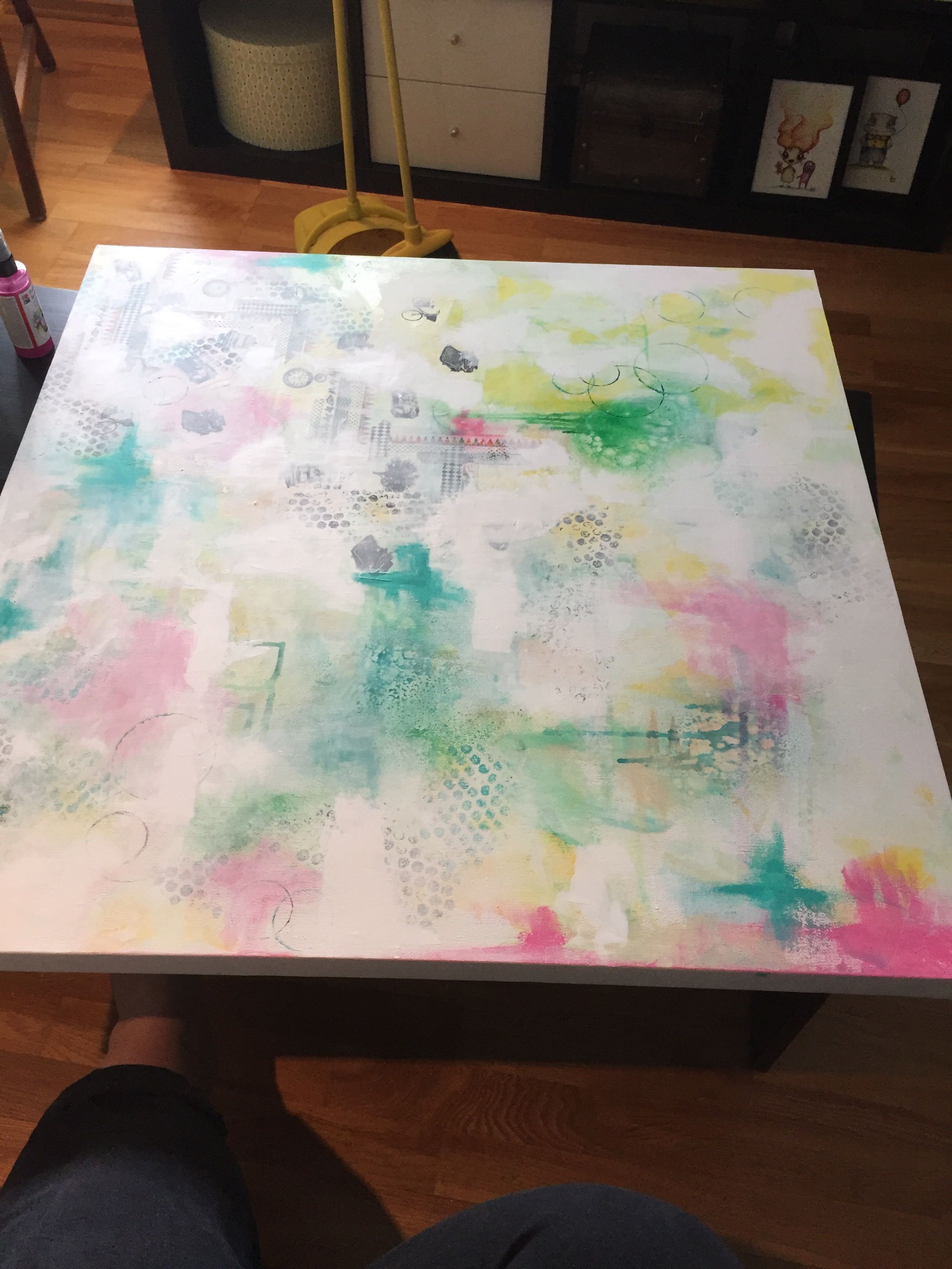 Bildet er malt med akrylmaling, og i bakgrunnen har jeg brukt tekstil-spray og dekortape i tillegg.