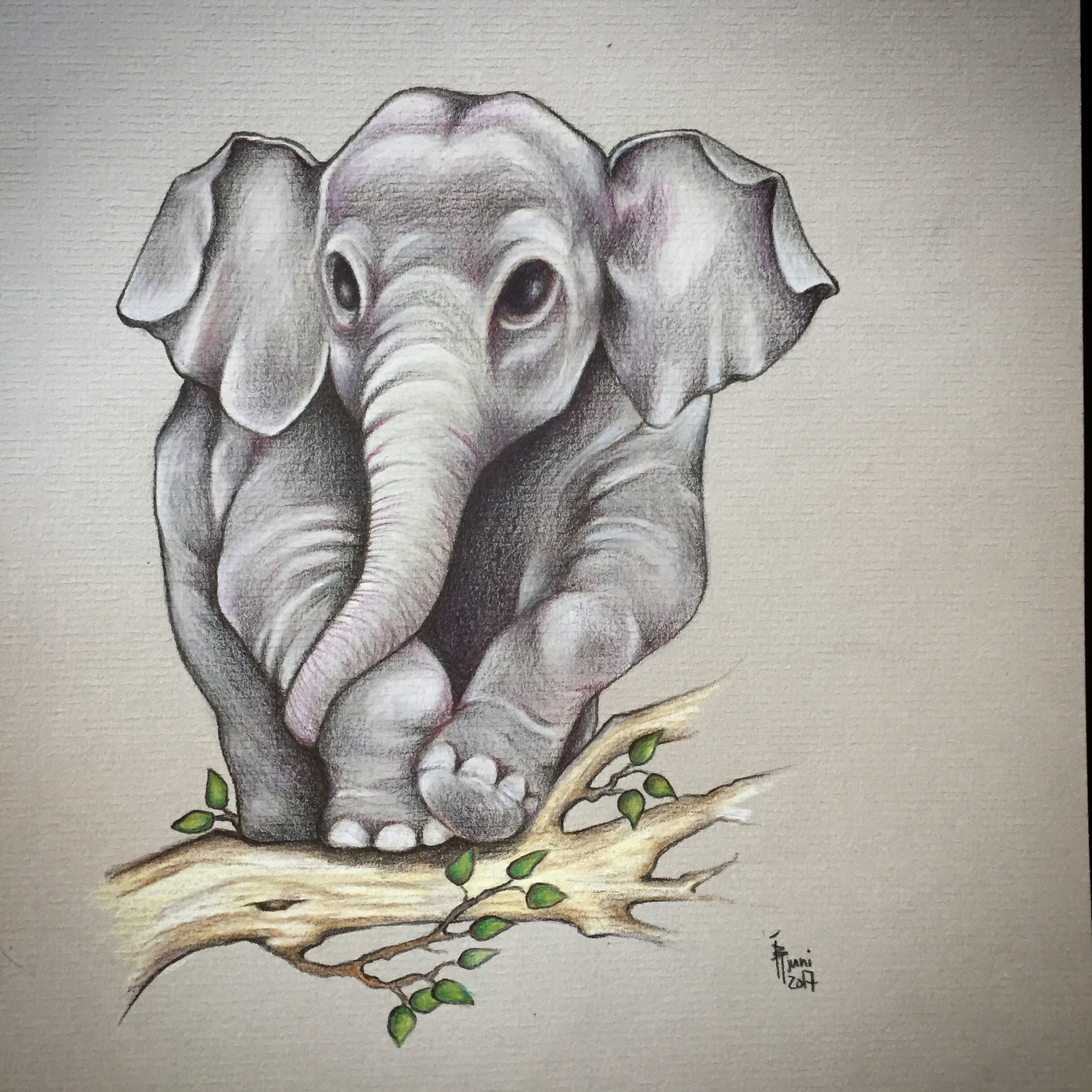 Så grublet jeg litt på hva jeg skulle tegne neste gang. Gjerne et dyr. Etter å ha tenkt litt fant jeg ut at jeg skulle prøve meg på en elefant. Jeg lette etter inspirasjonsbilder på nett (da jeg ikke har gode bilder av elefant liggende klar i hodet), og fant flere søte babyelefanter. Den første elefanten ble slik: