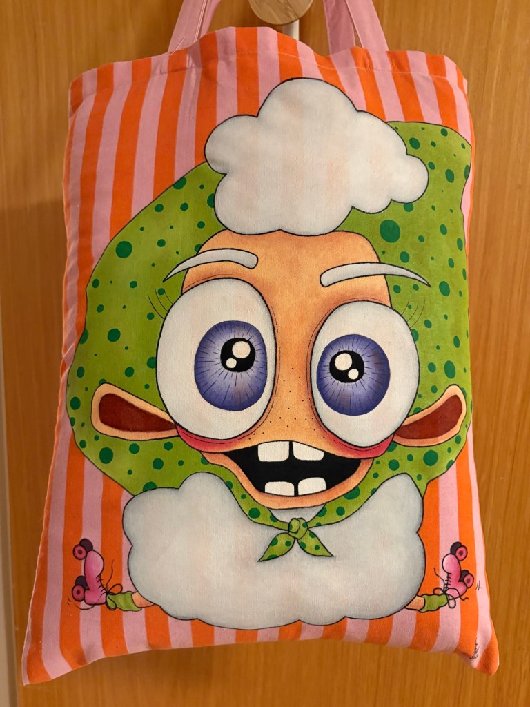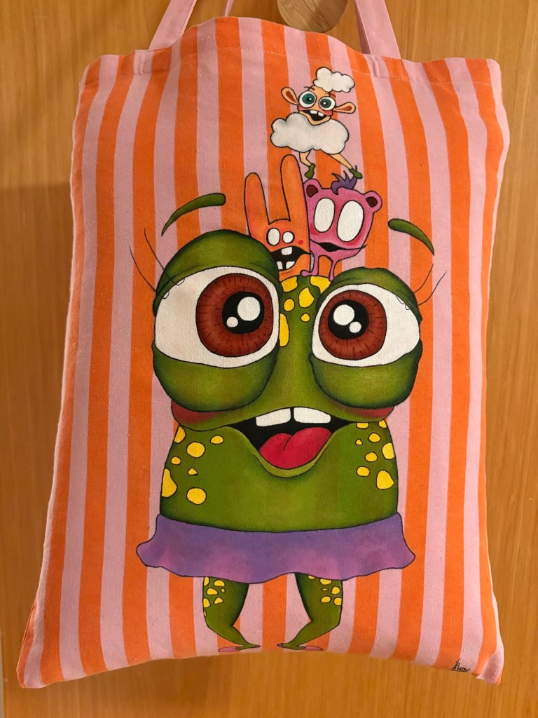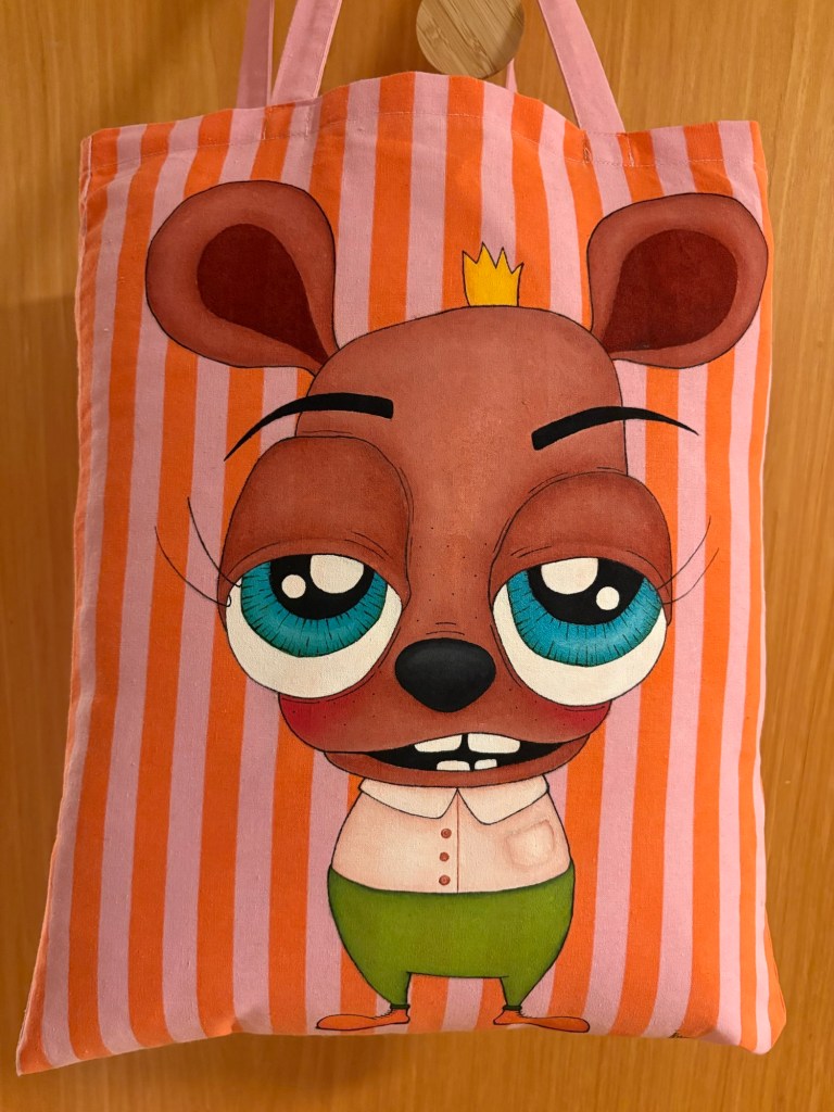 Jeg tar med meg tegninger og malerier i ulike formater. Både motiver tegnet og malt for hånd på kort, papir i ulik str, lerret og på handlenett i tøy. Jeg tar også med meg noen trykkede bilder i form av kort, klistermerker og et begrenset antall kalendere.