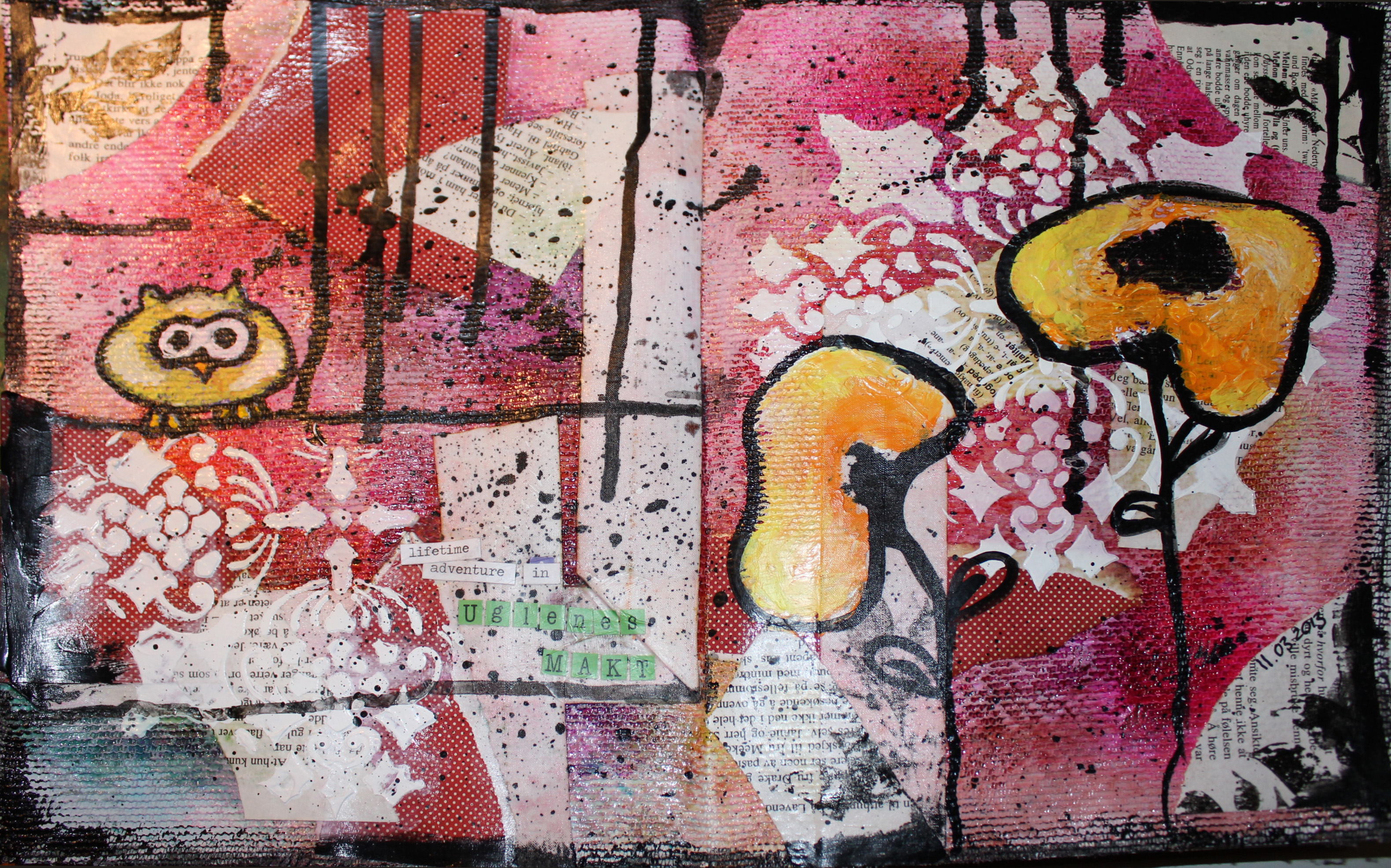 Da fant jeg ut at det kanskje var på tide å tømme esken med ting som jeg hadde bestilt på panduro-salg på nettet. her hadde jeg blant annet en mønstersjablon som kanskje kunne være spennende å bruke. Jeg pakket opp sjablonen og la et lag med hvit panduro akryl på den. Elsket efekten og teksturen det gav sidene! Etter å ha gjort dette følte jeg at bakgrunnen var klar, men at det burde være noe motiv på siden og. Og siden jeg har blitt litt fasinert av Donna Downey og hennes blomster, ble det DDinspirerte blomster og en ugle så klart.