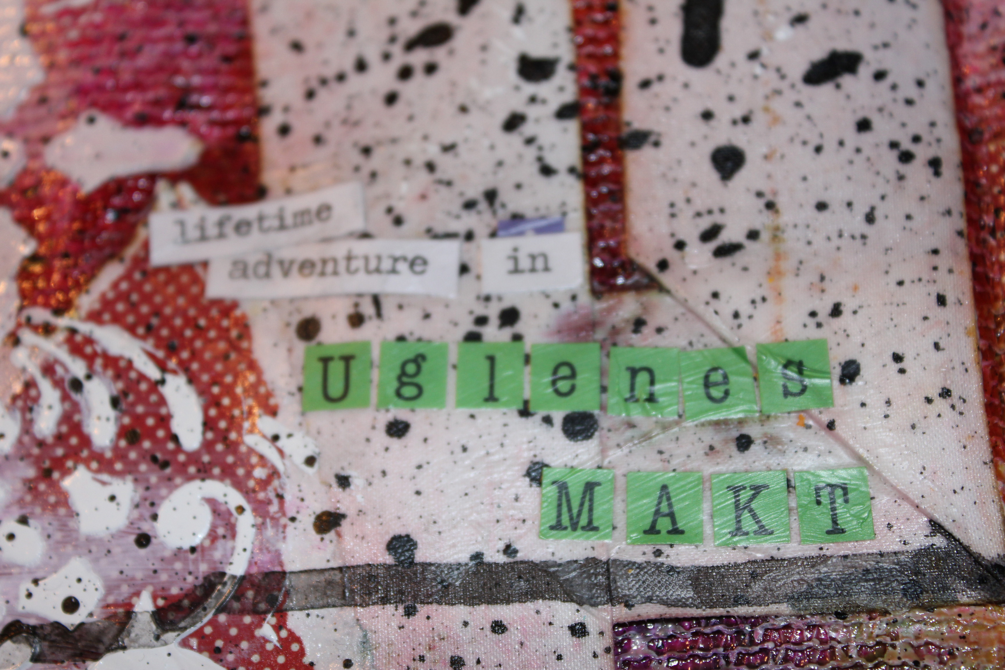 Materialer: stempler, gesso, gel medium, rub-on bokstaver, akryl, posca penner, dylusion sjablon