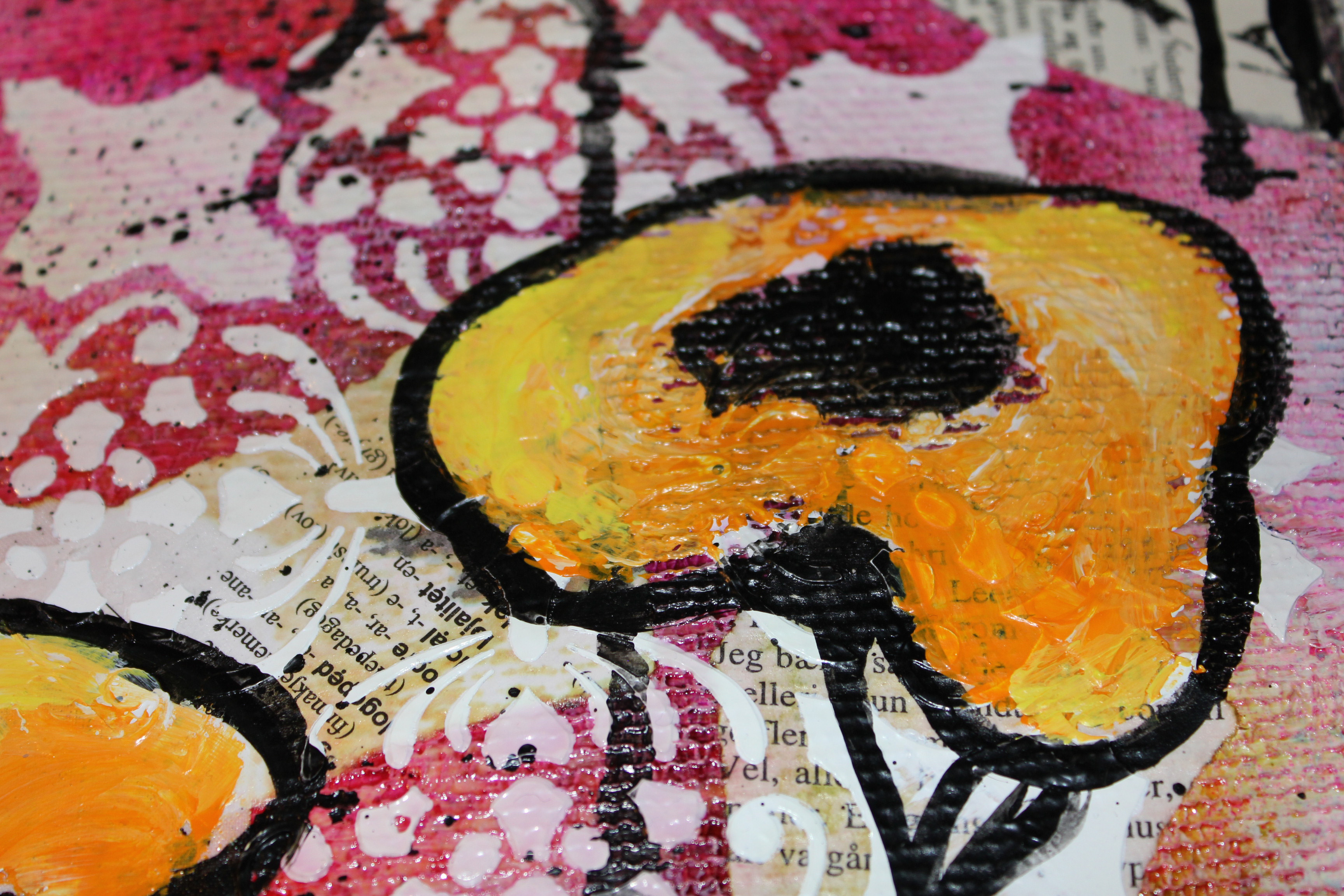akryl, papirblomster, mynt, gesso, sjabloner, mixed media, neon maling fra søstrene grene, glitterlim ++