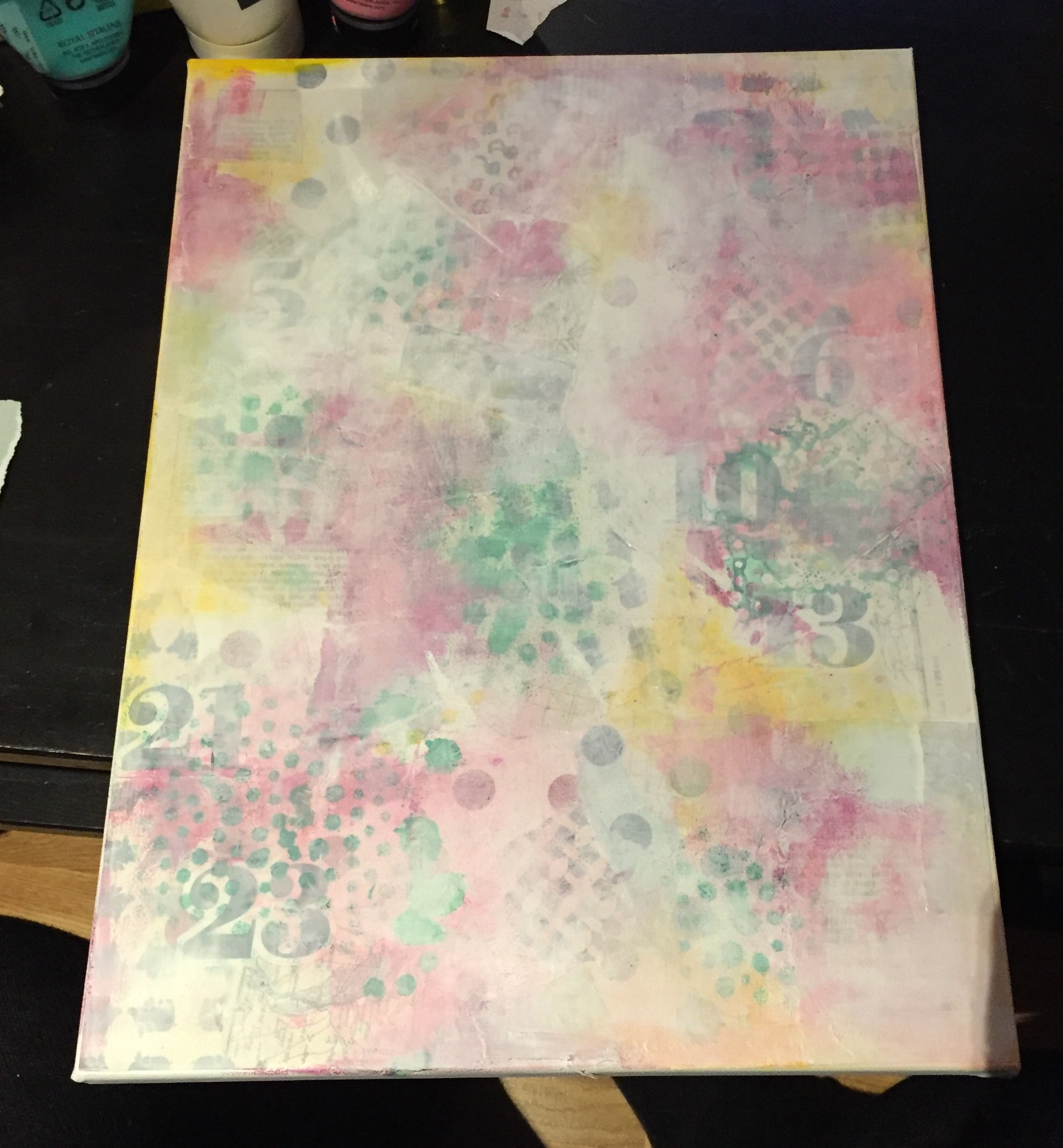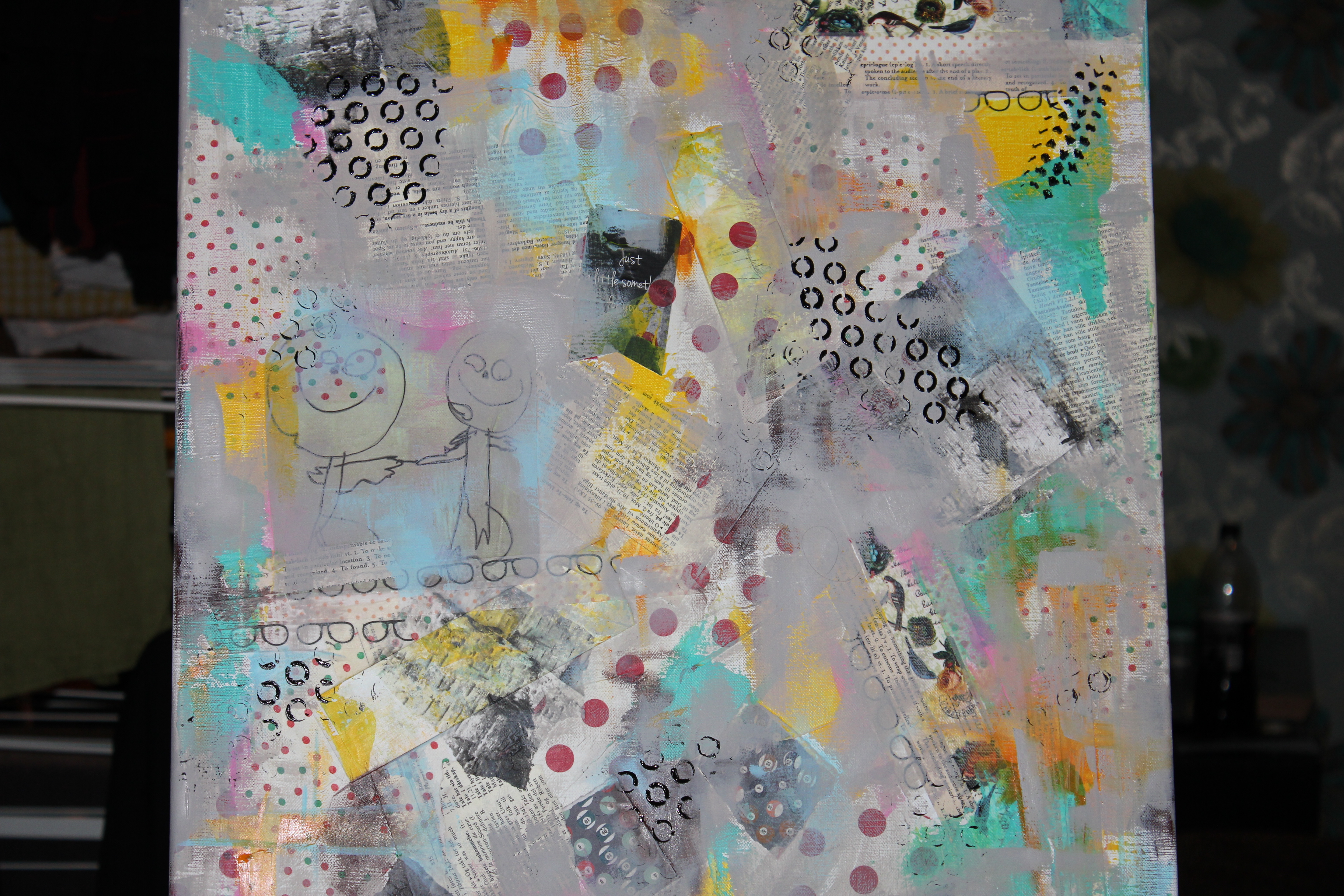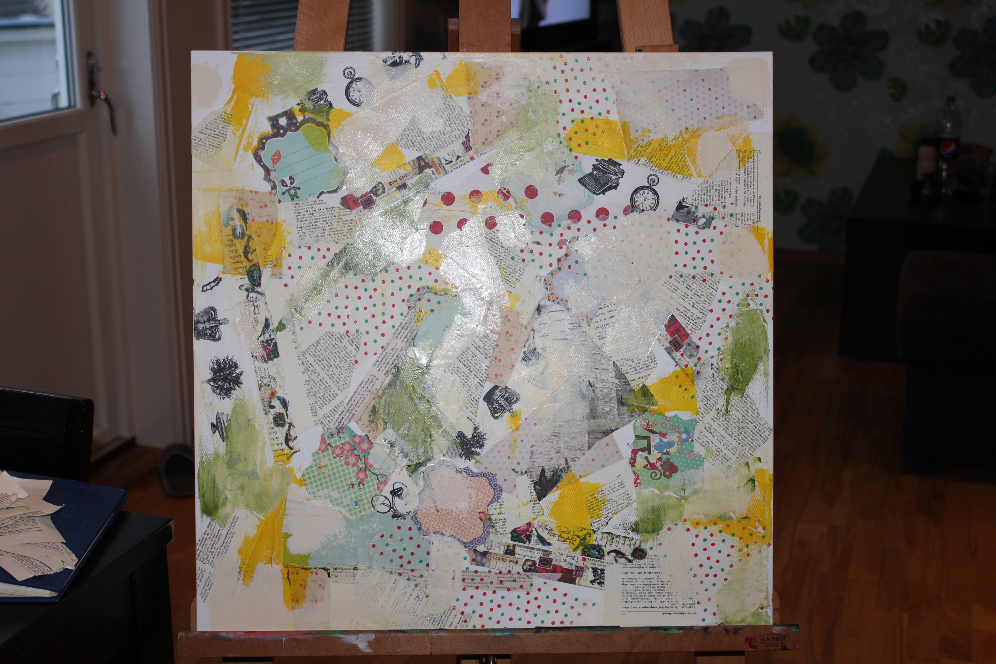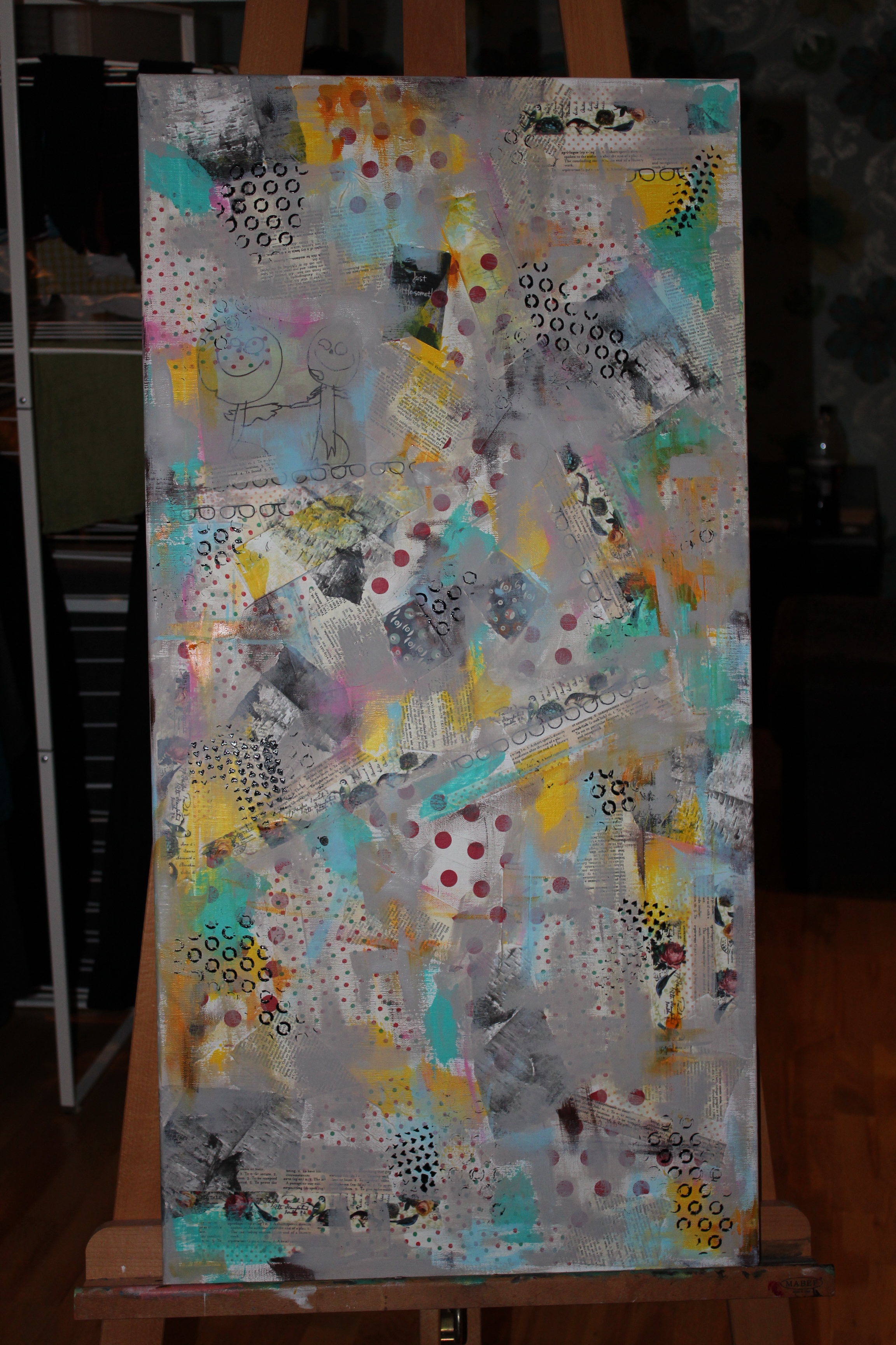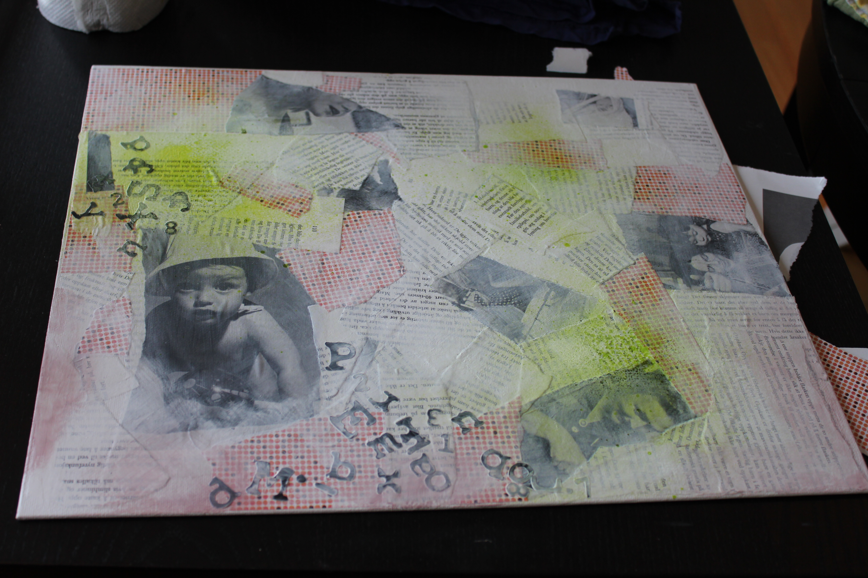 Bakgrunn under prosessen. Lag på lag med dekorark, boktekst, spraymaling, klistremerker, stempel, gesso og akrylmaling. Dette for å skape en spennende bakgrunn til doodletegningene mine.