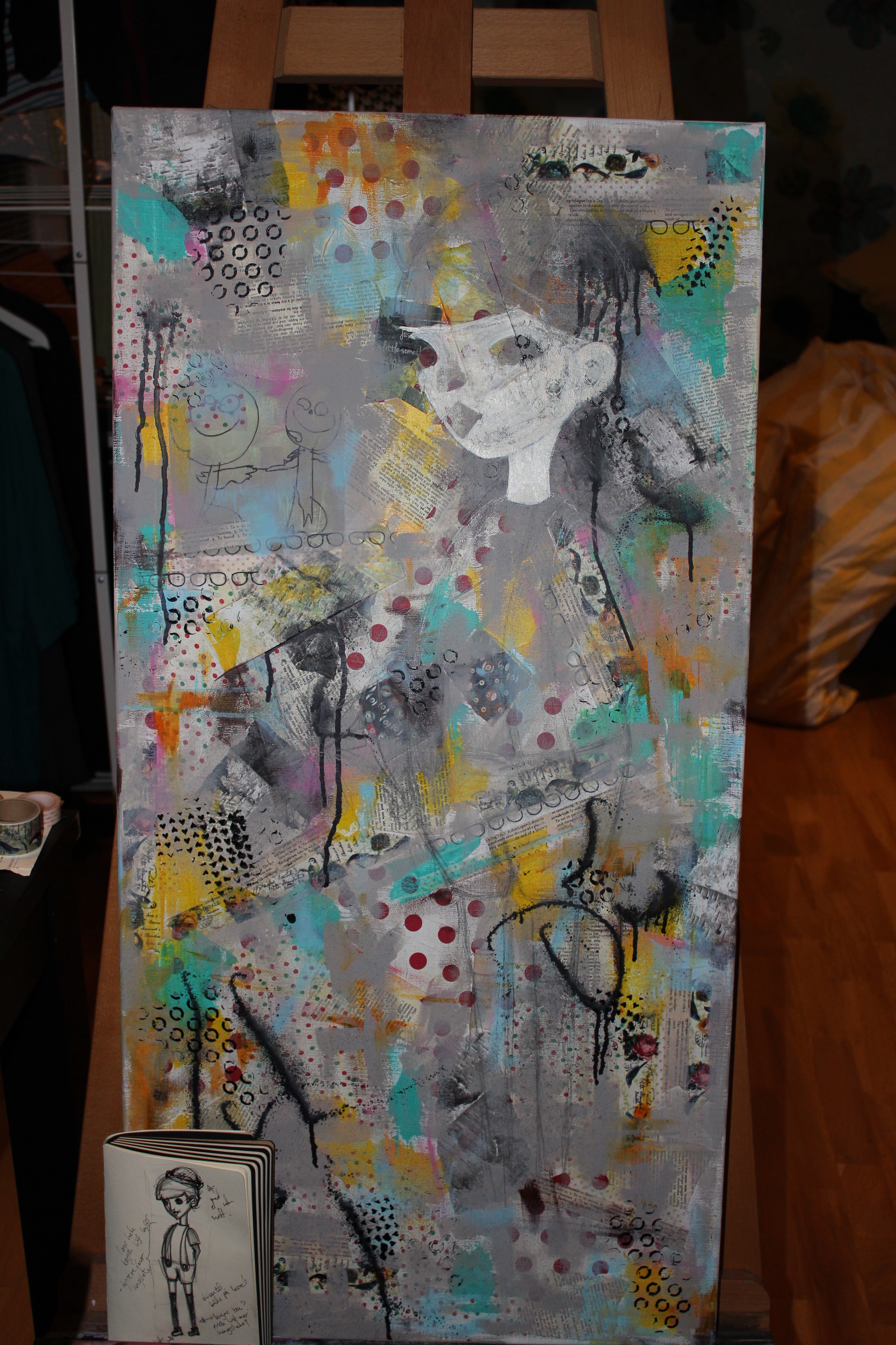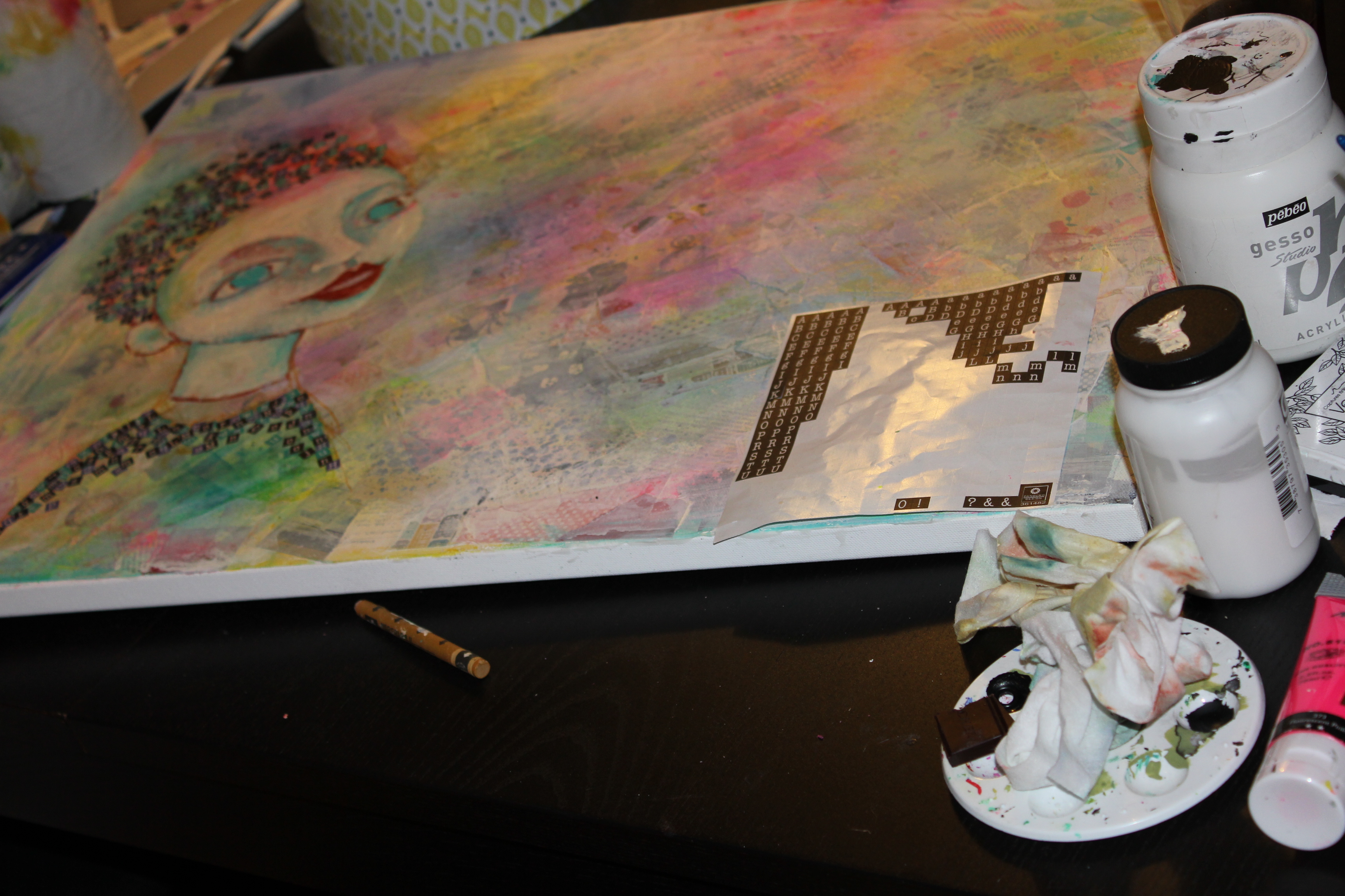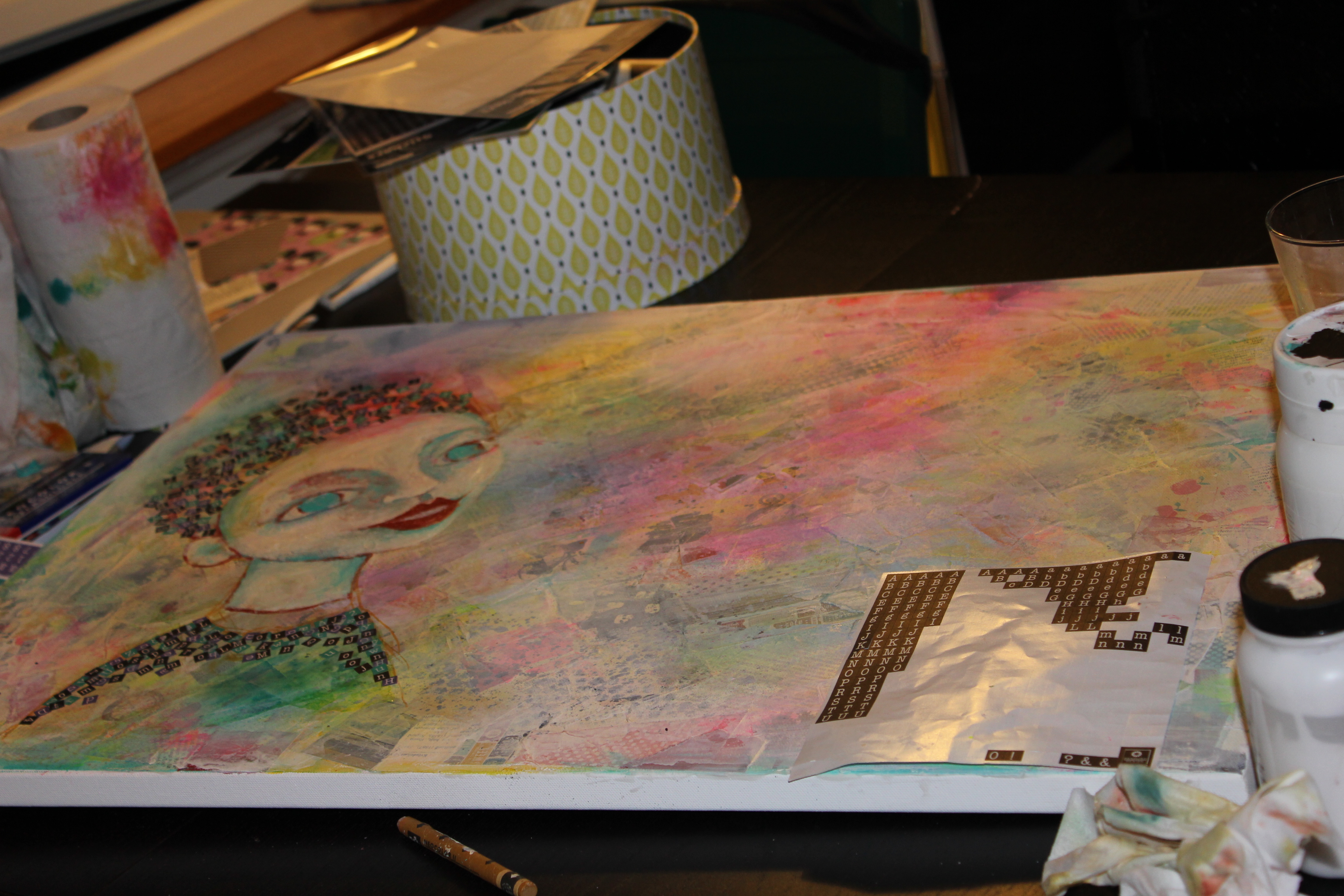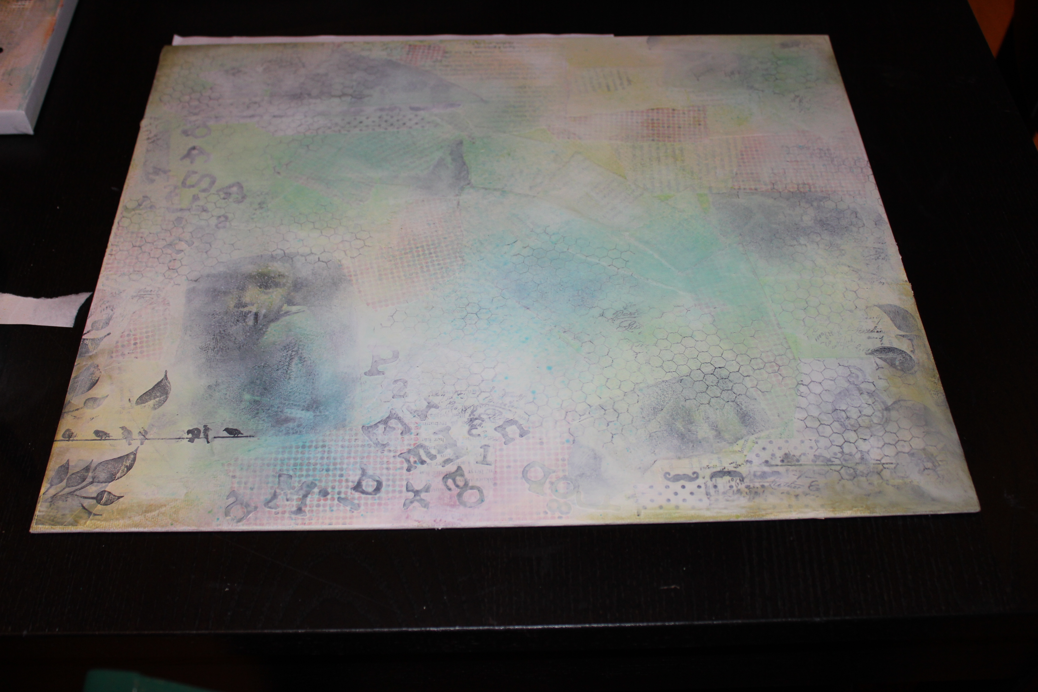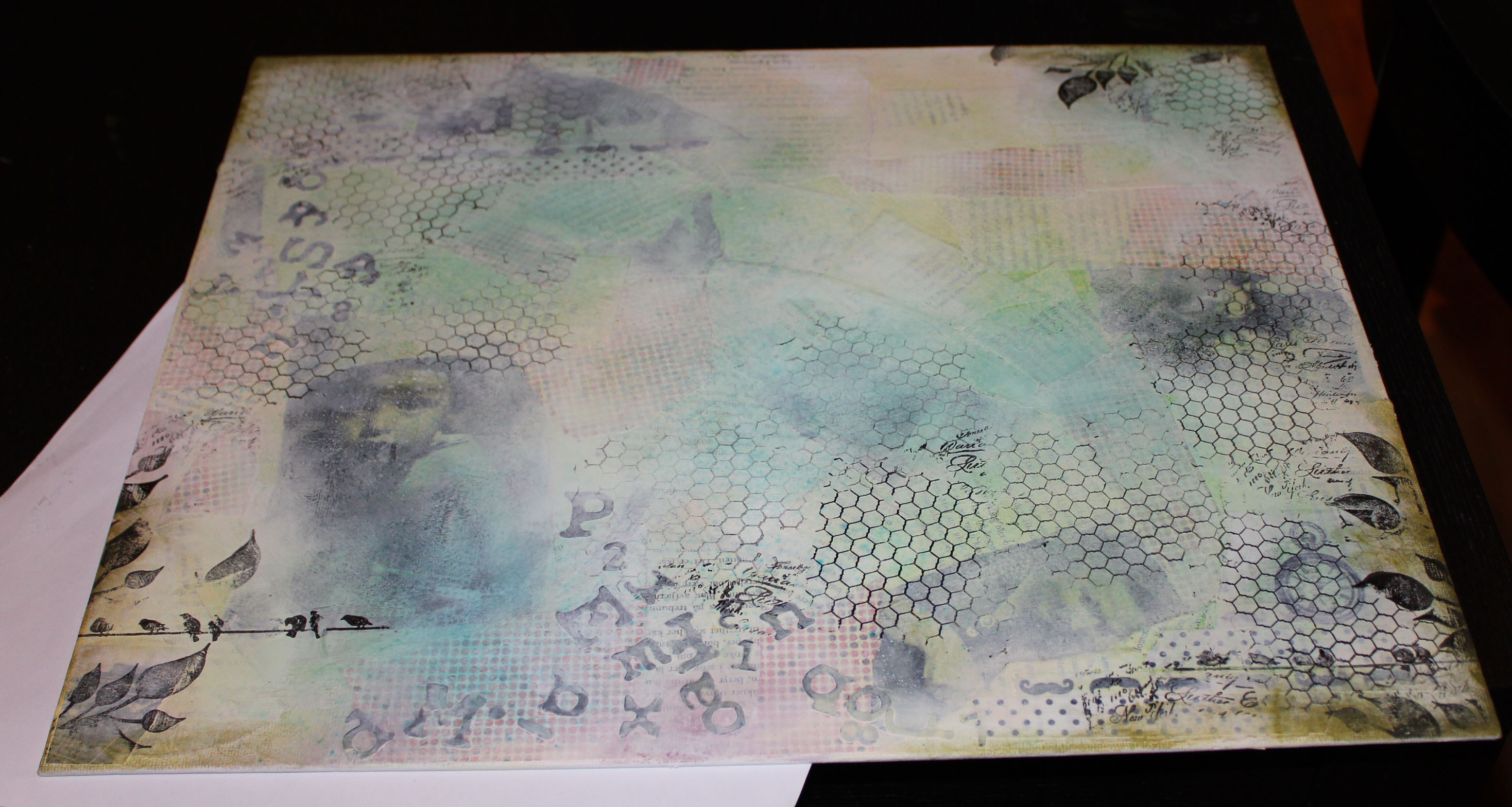 Bakgrunn under prosessen. Lag på lag med dekorark, boktekst, spraymaling, klistremerker, stempel, gesso og akrylmaling. Dette for å skape en spennende bakgrunn til doodletegningene mine.