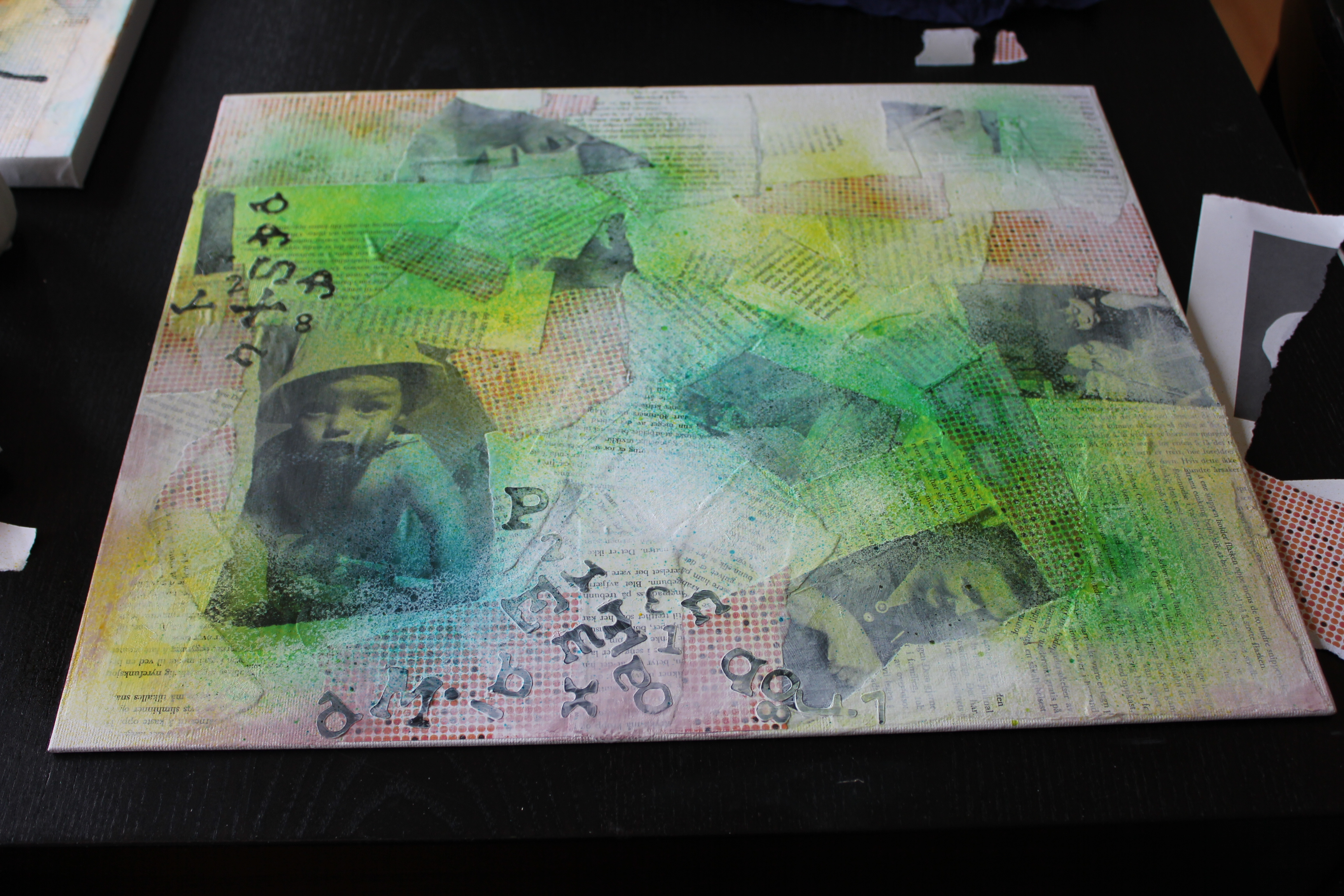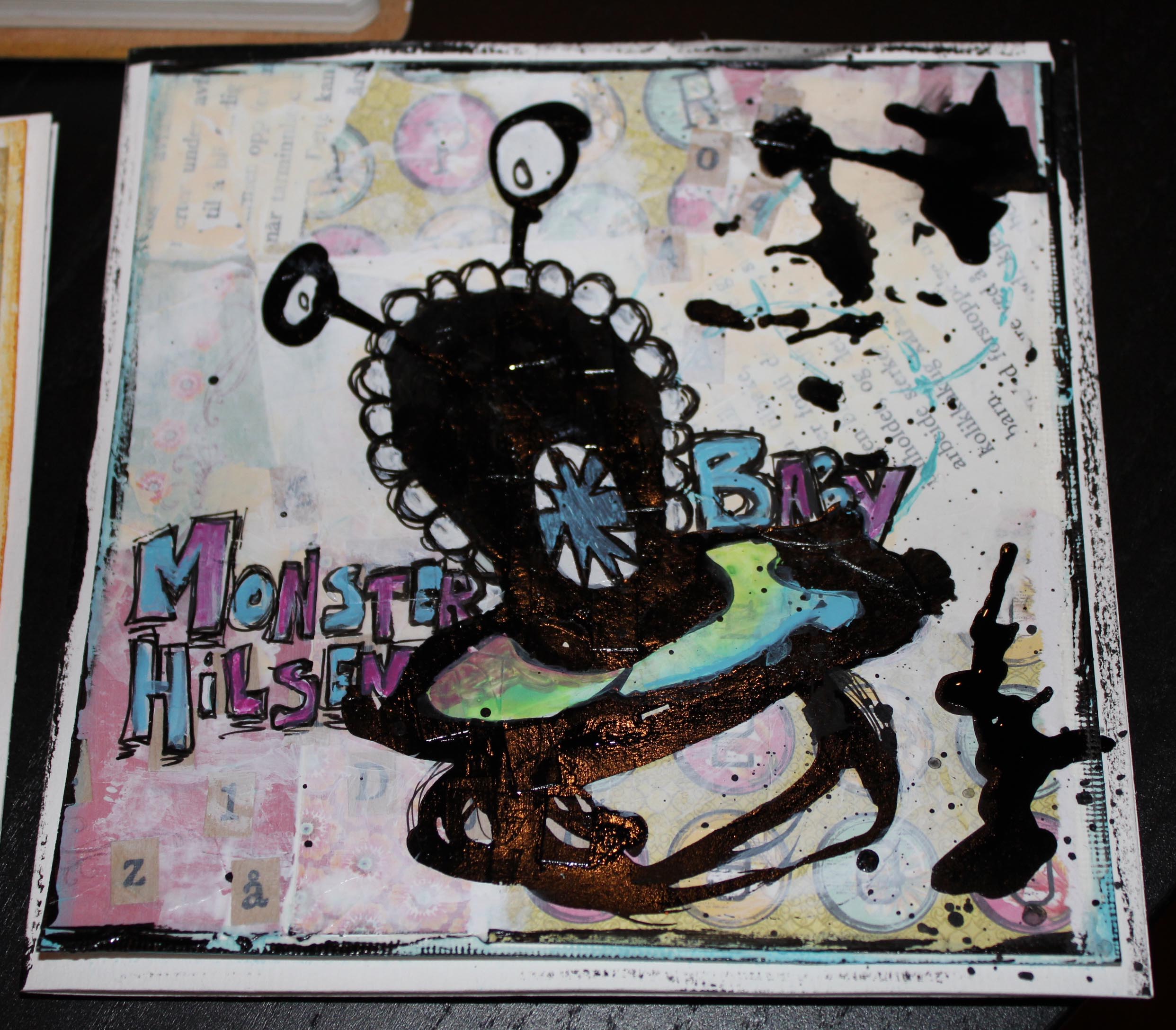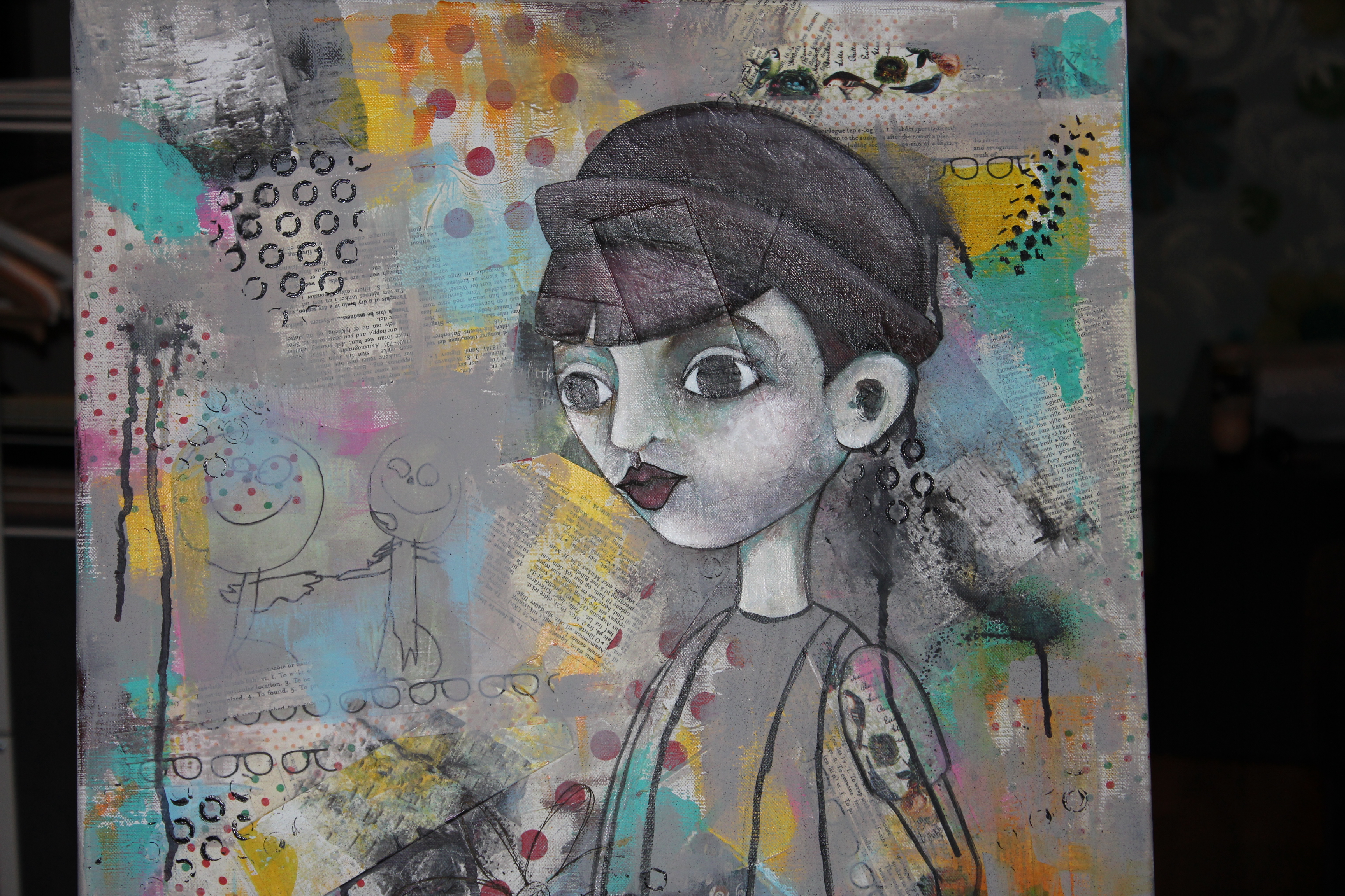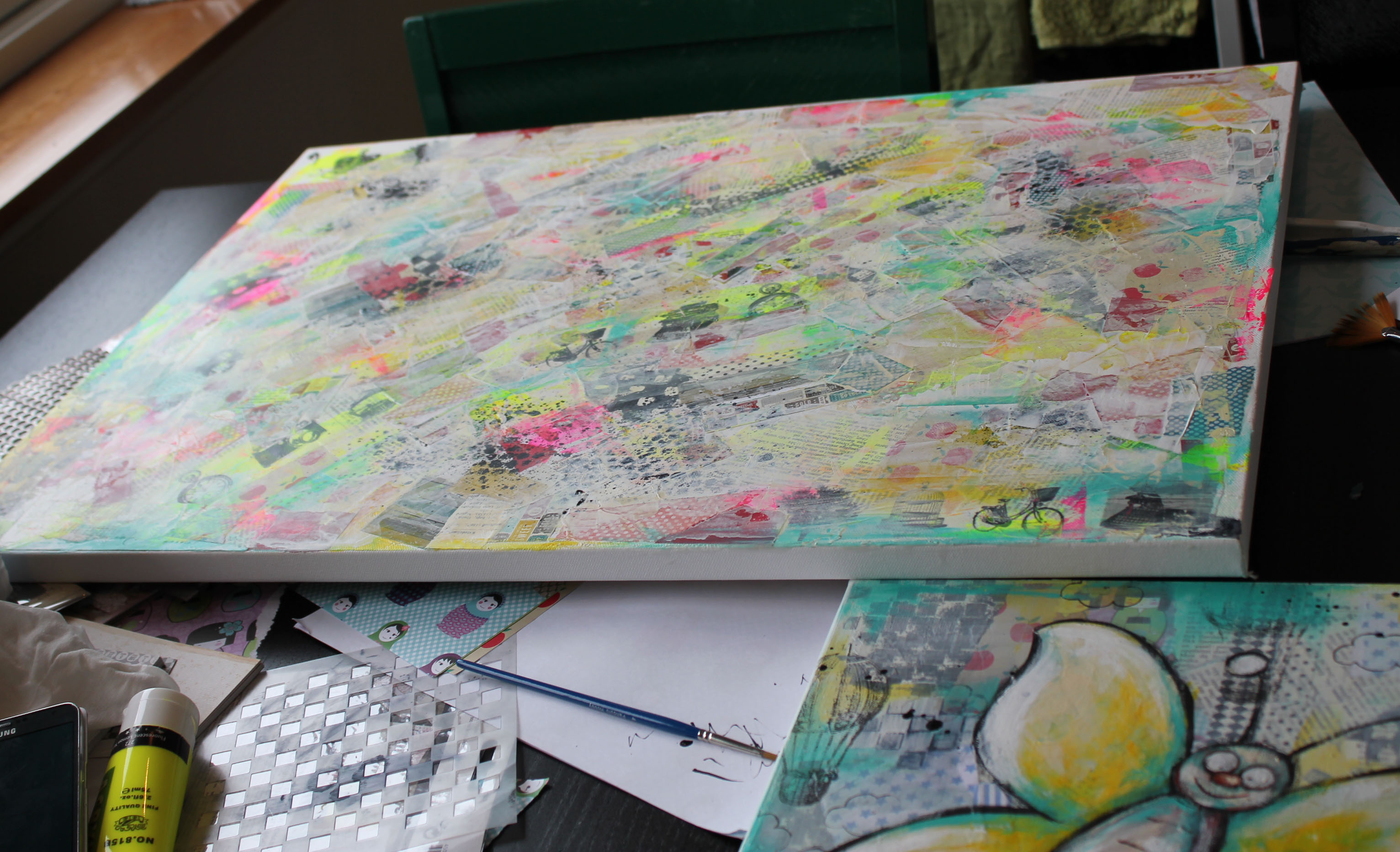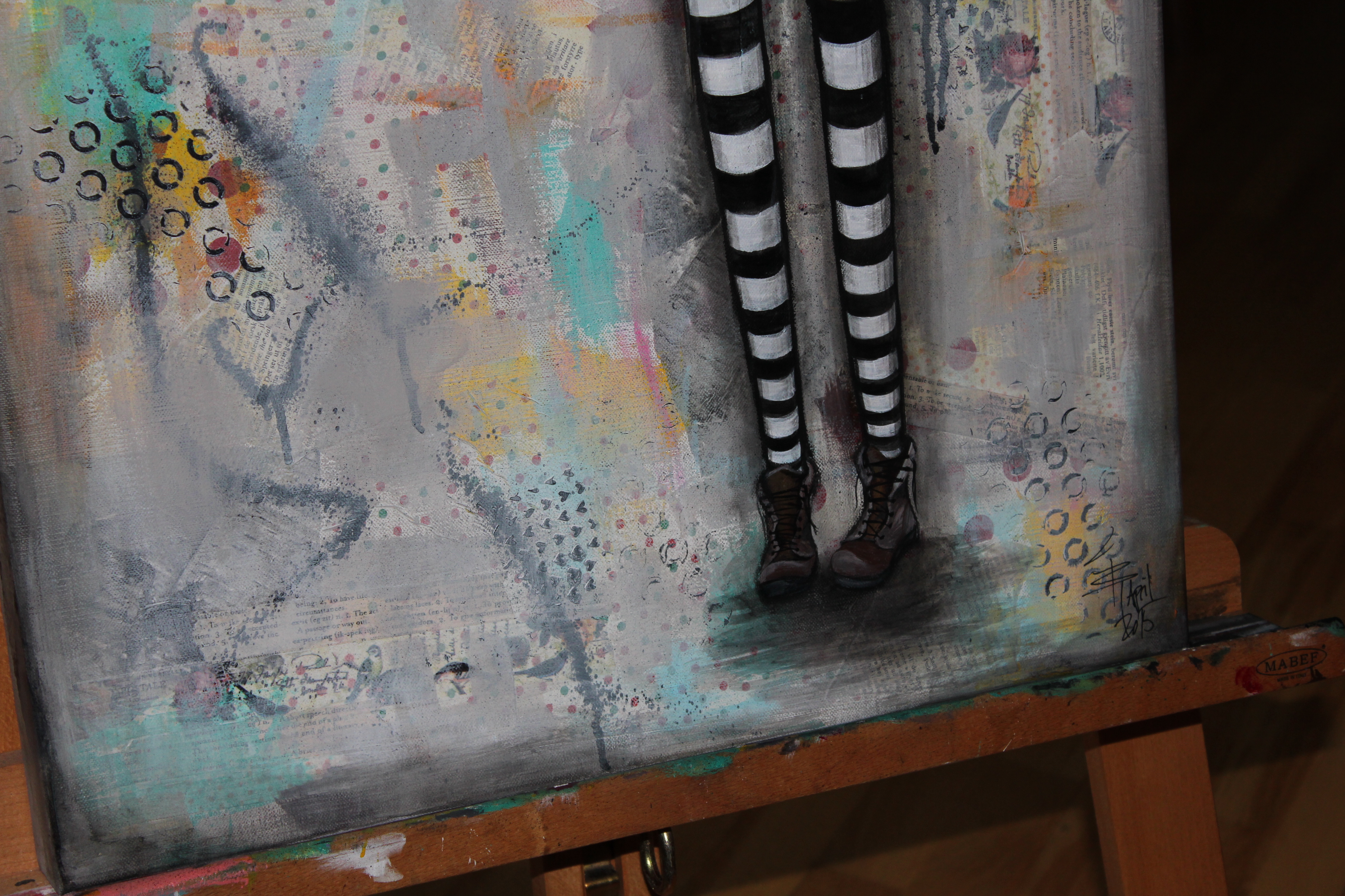 Bakgrunn under prosessen. Lag på lag med dekorark, boktekst, spraymaling, klistremerker, stempel, gesso og akrylmaling. Dette for å skape en spennende bakgrunn til doodletegningene mine.