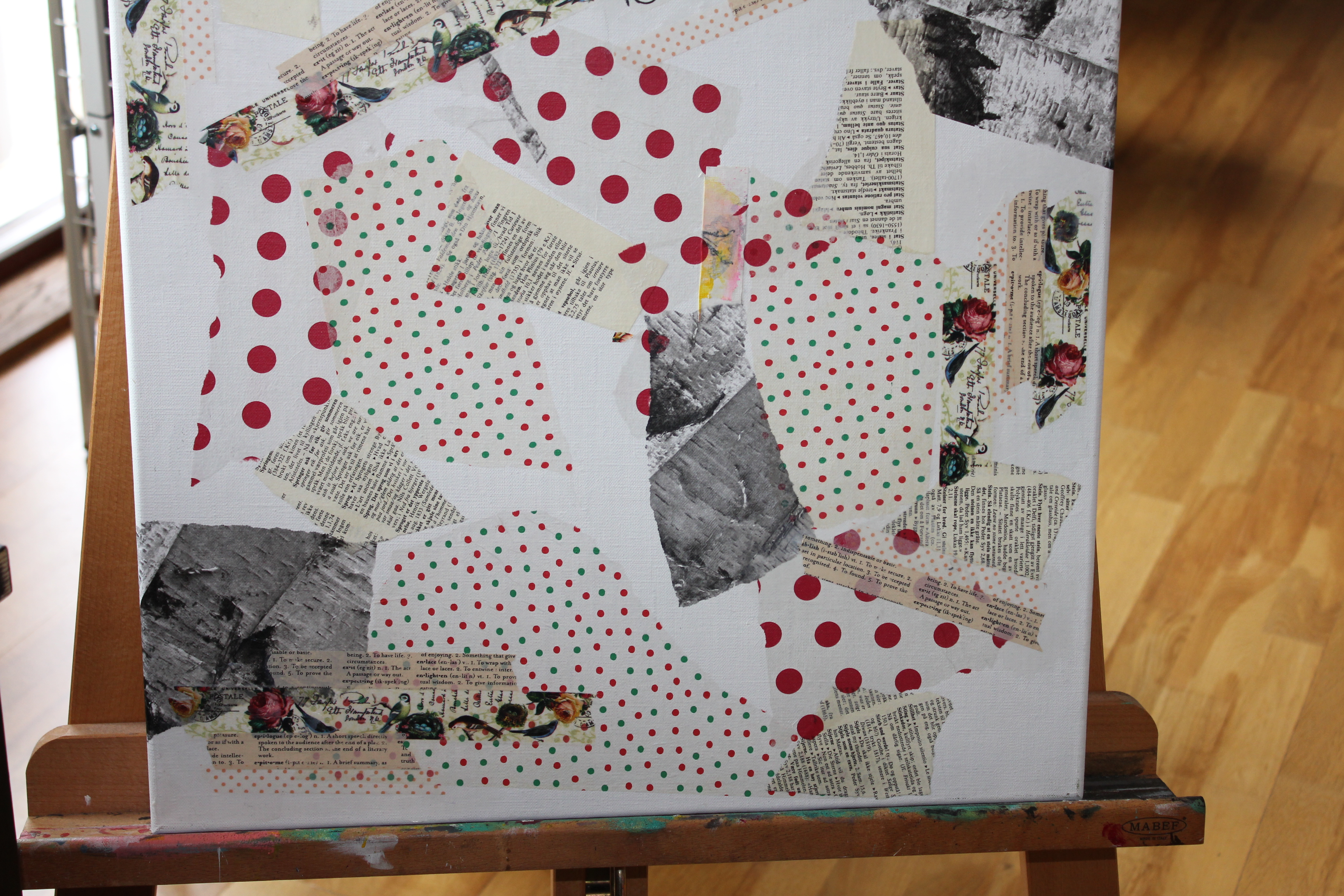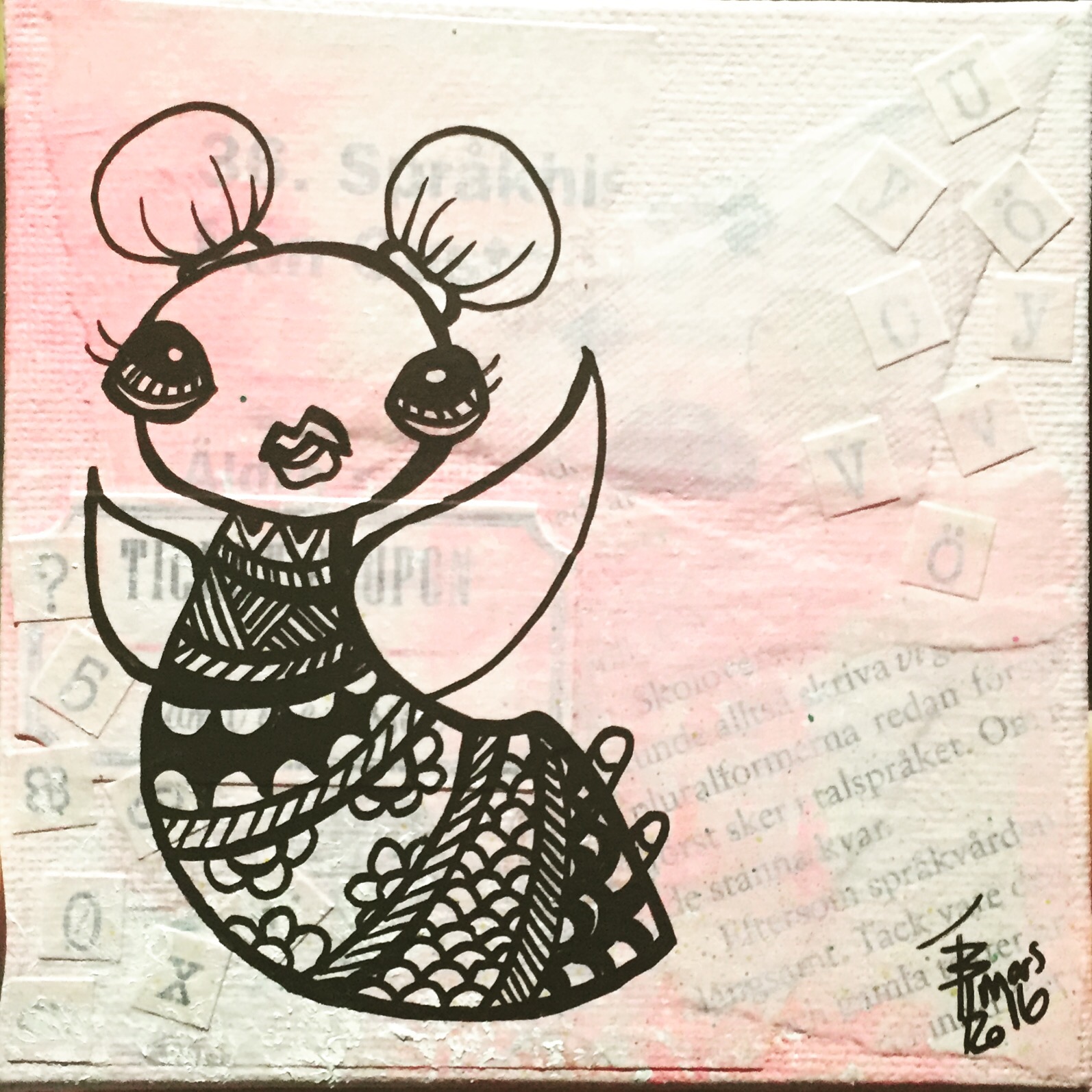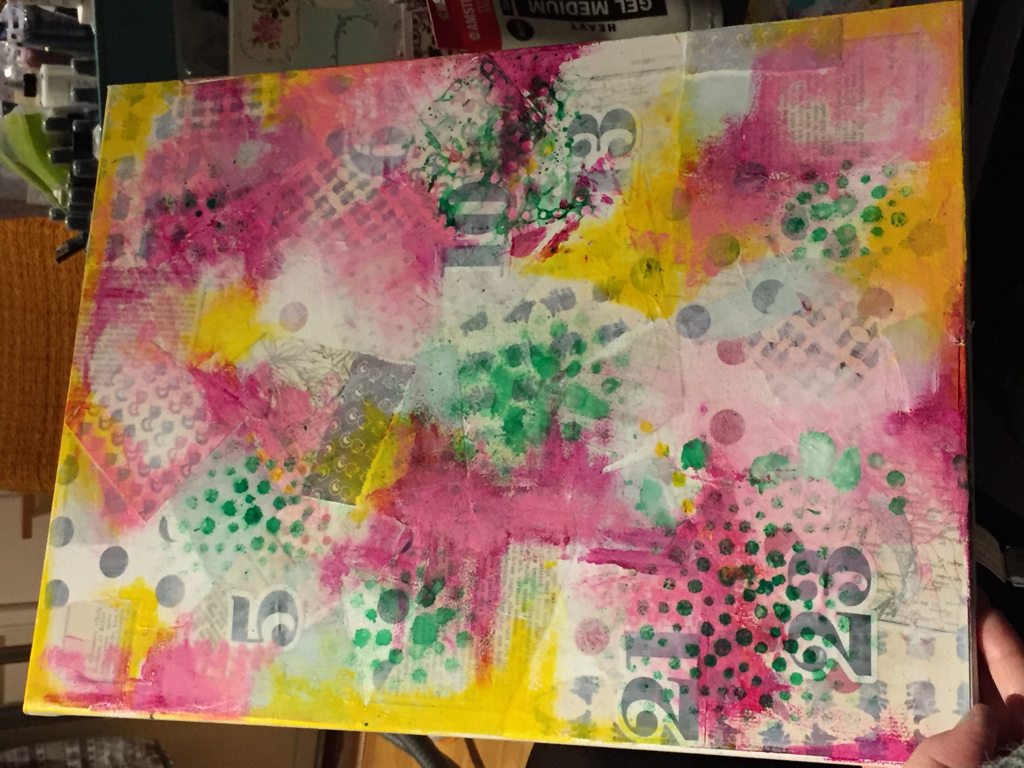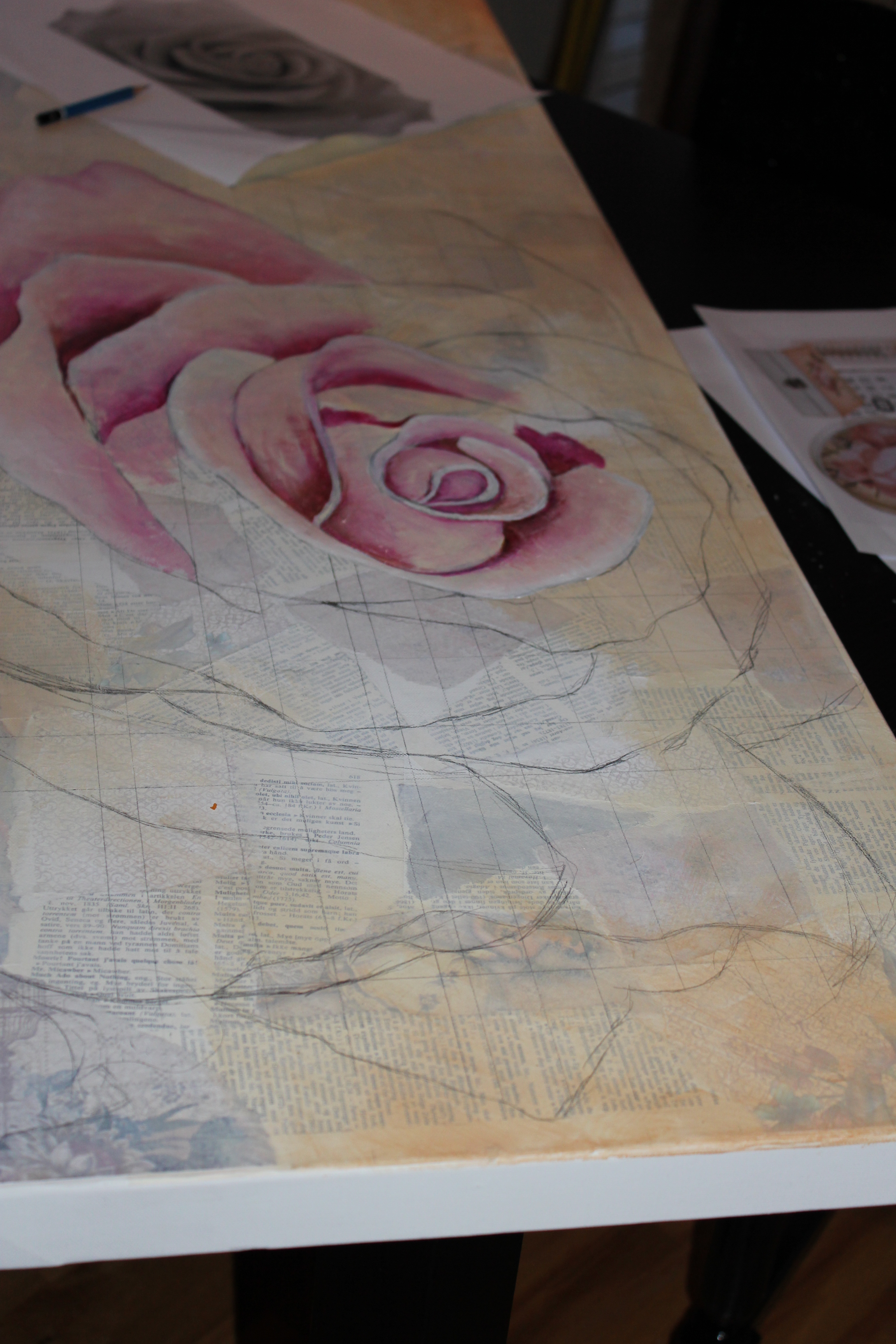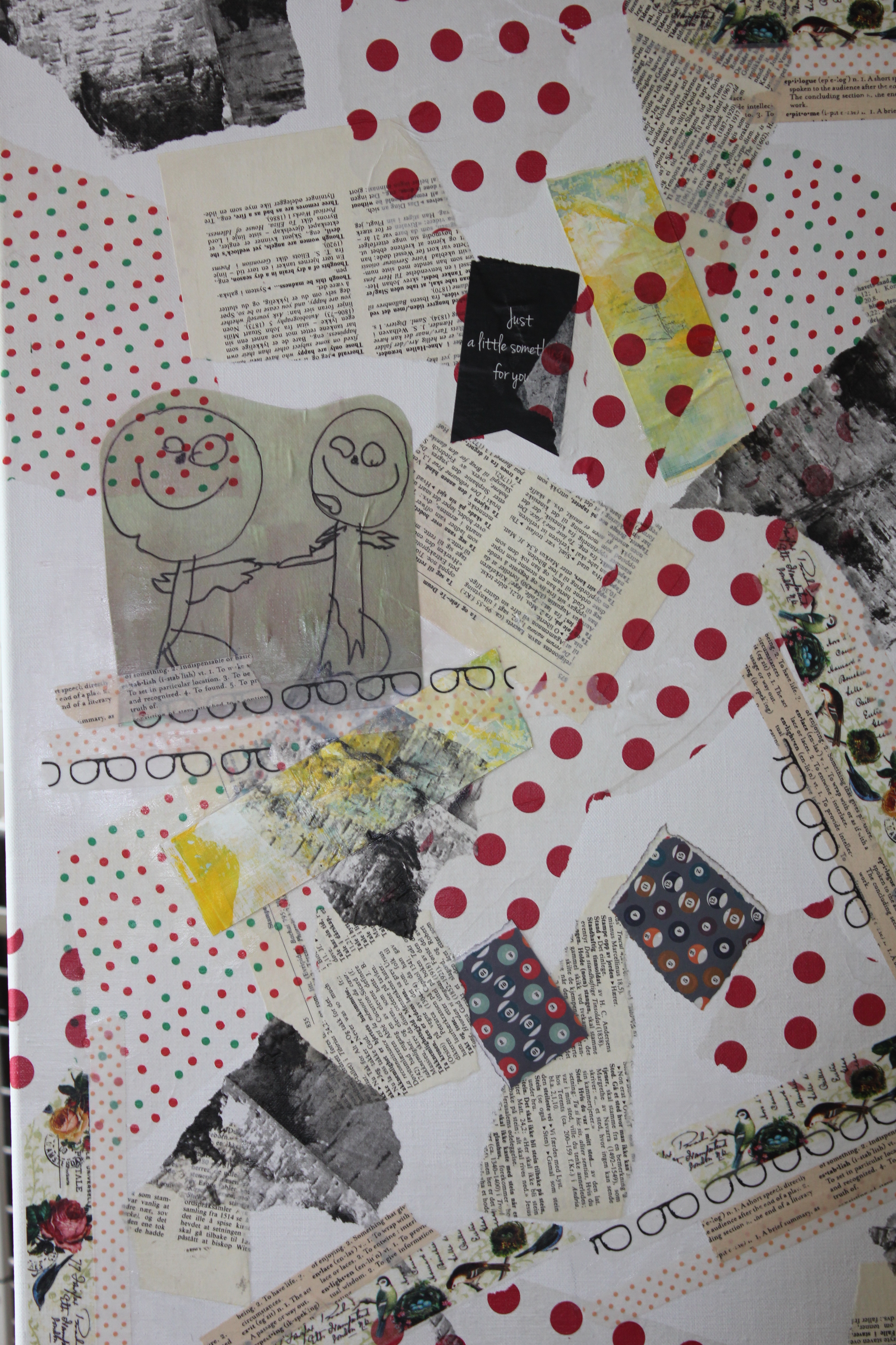 Bakgrunn under prosessen. Lag på lag med dekorark, boktekst, spraymaling, klistremerker, stempel, gesso og akrylmaling. Dette for å skape en spennende bakgrunn til doodletegningene mine.