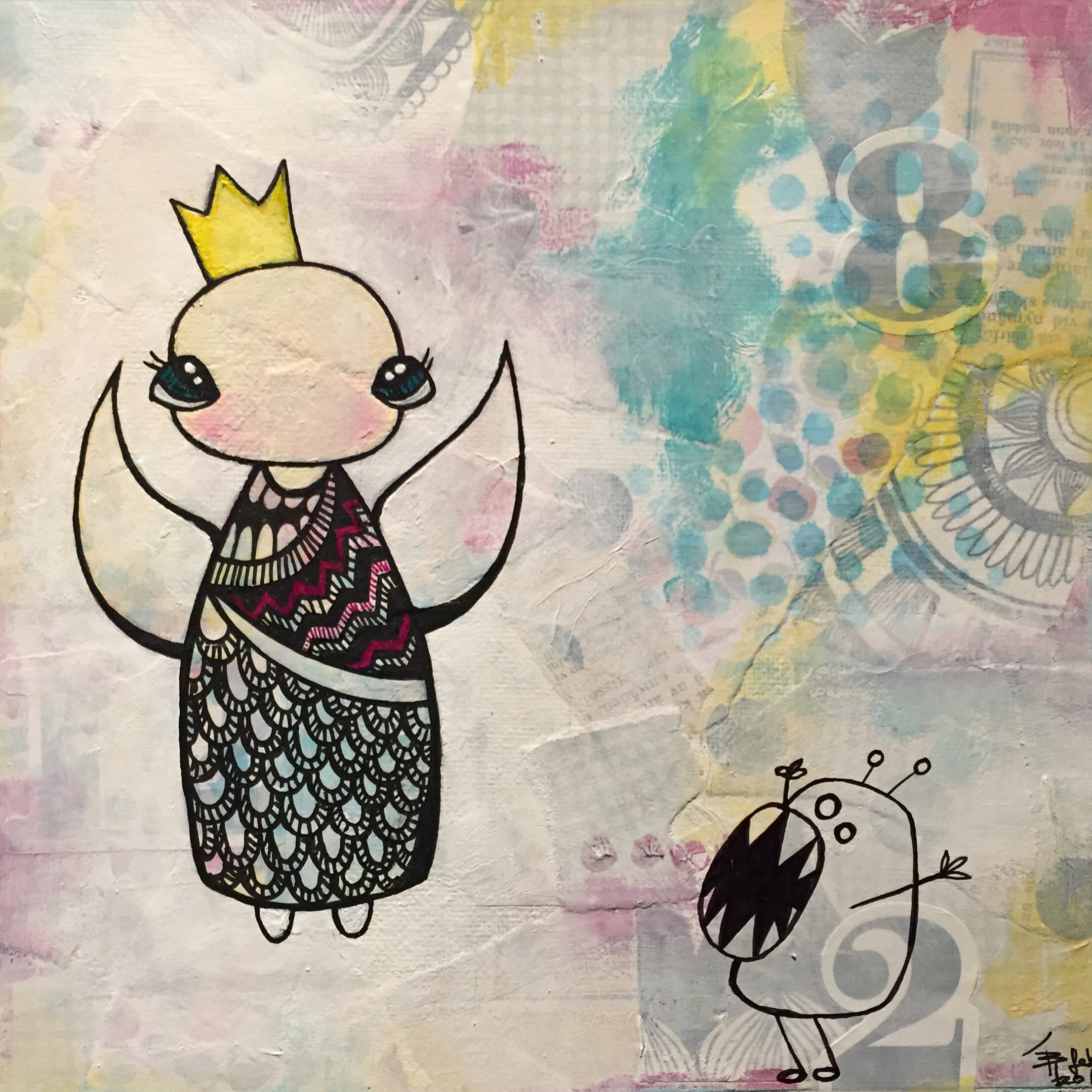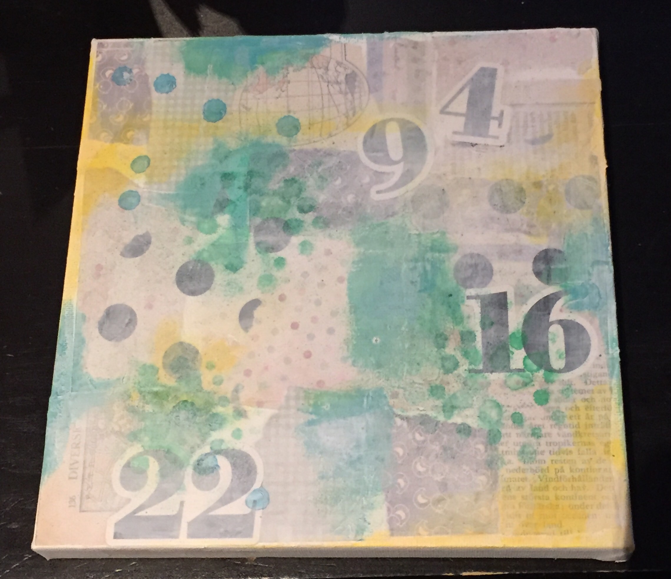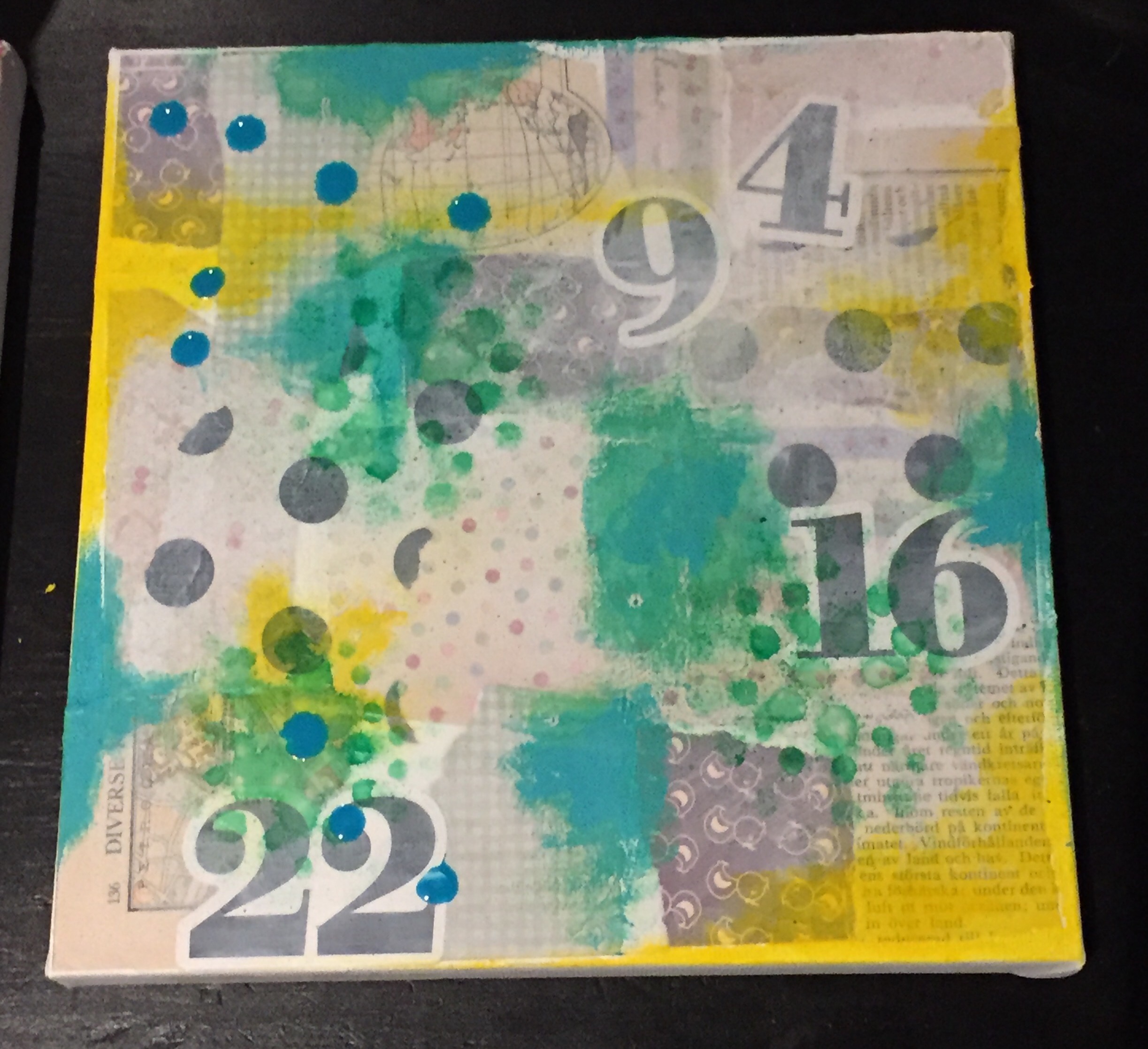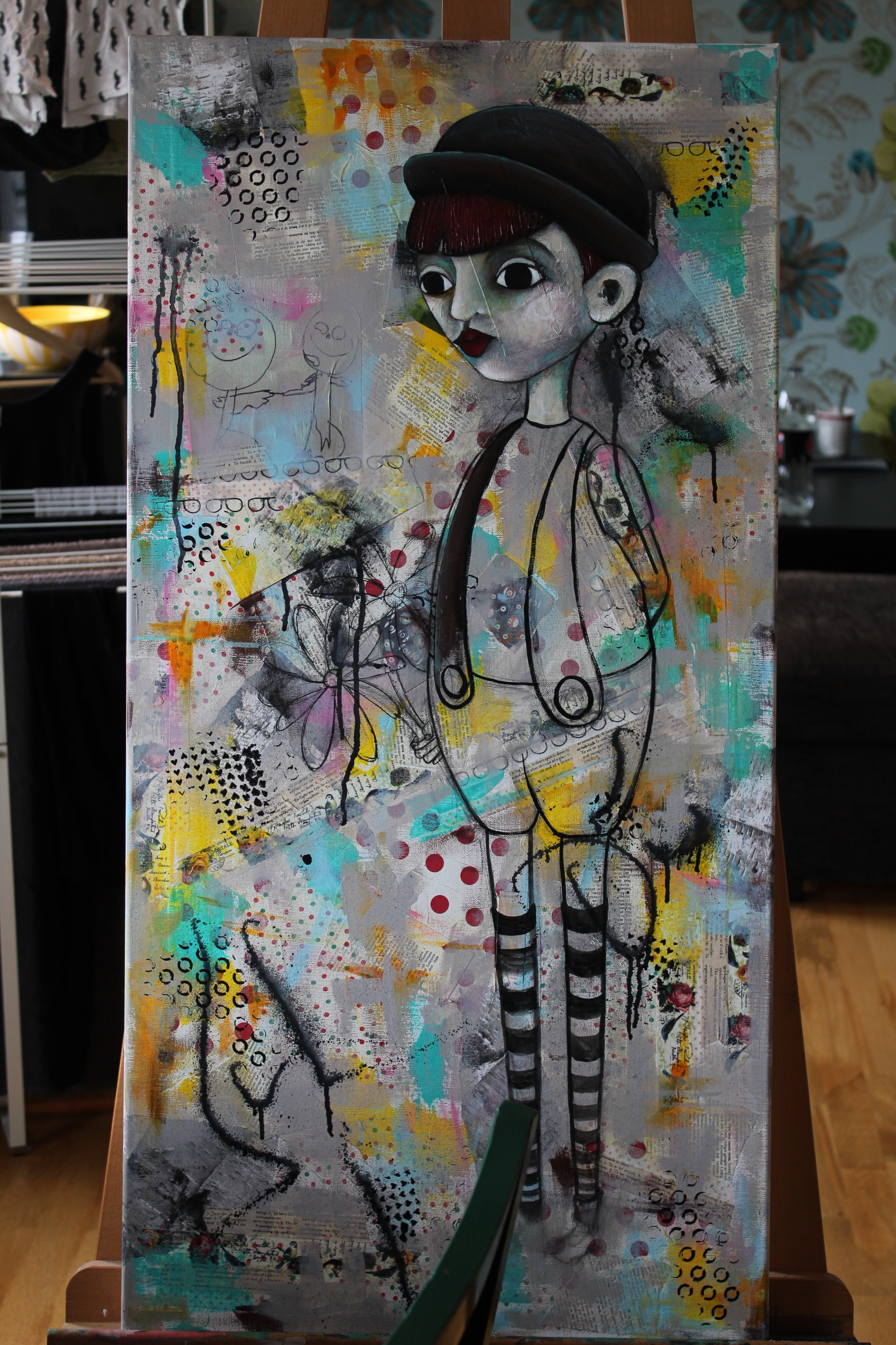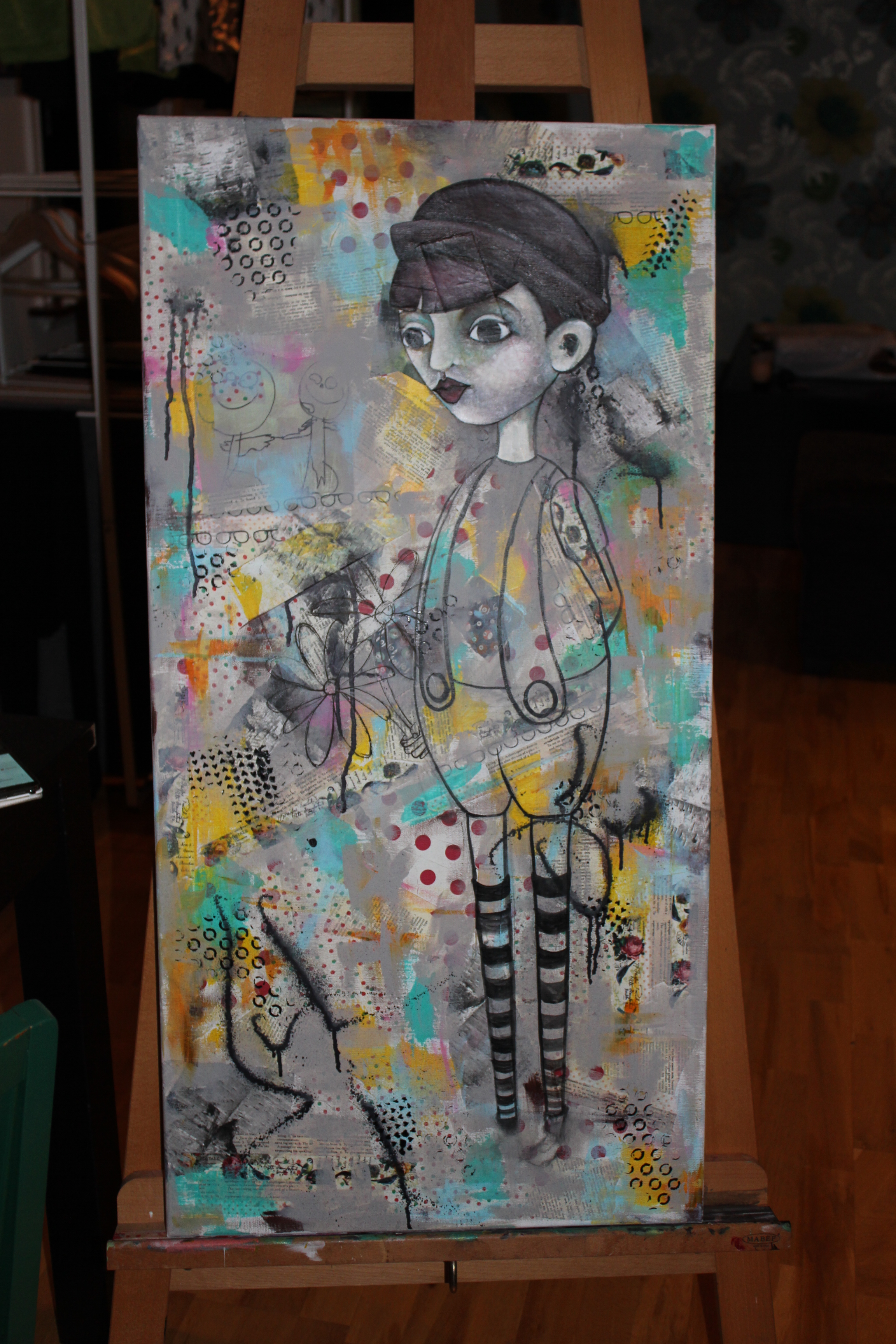 Bakgrunn under prosessen. Lag på lag med dekorark, boktekst, spraymaling, klistremerker, stempel, gesso og akrylmaling. Dette for å skape en spennende bakgrunn til doodletegningene mine.
