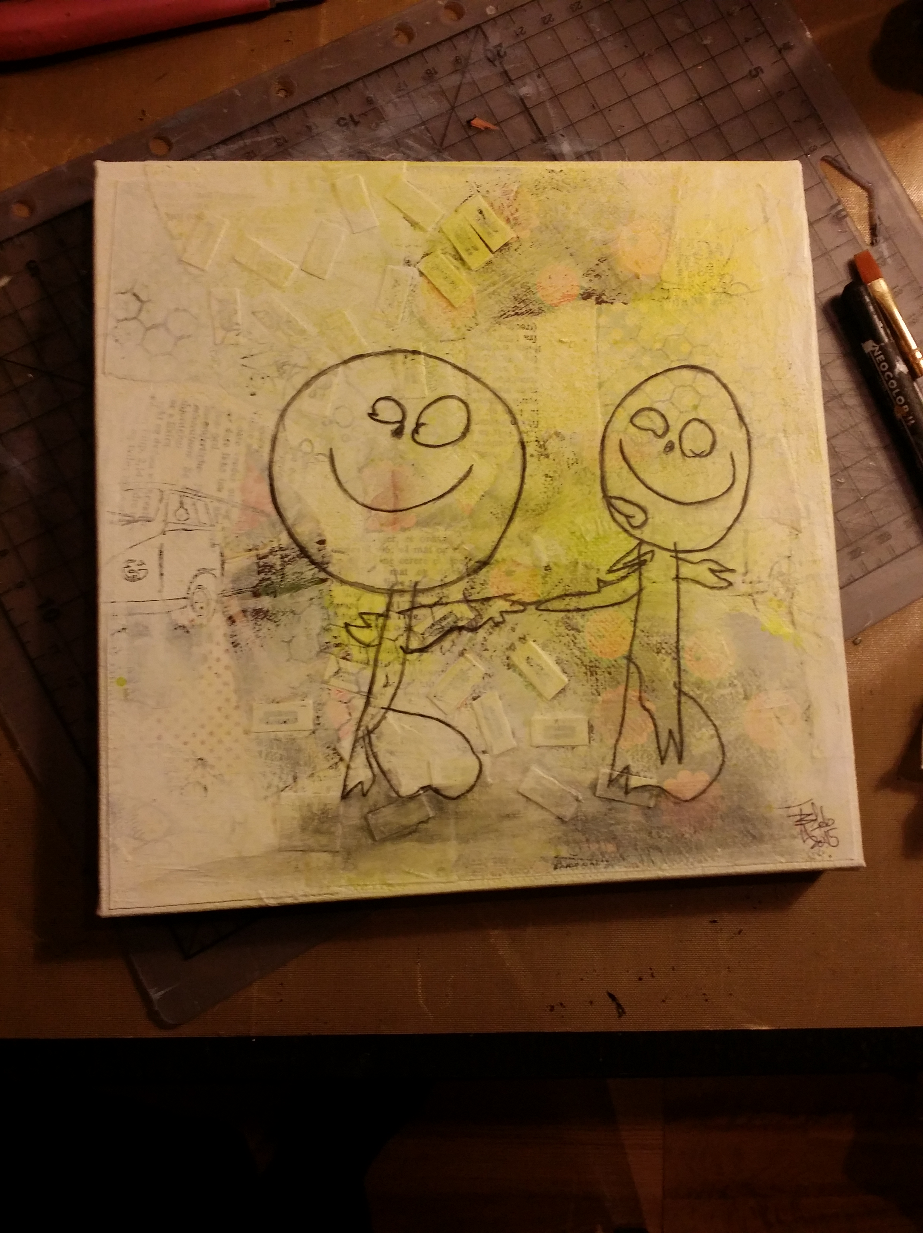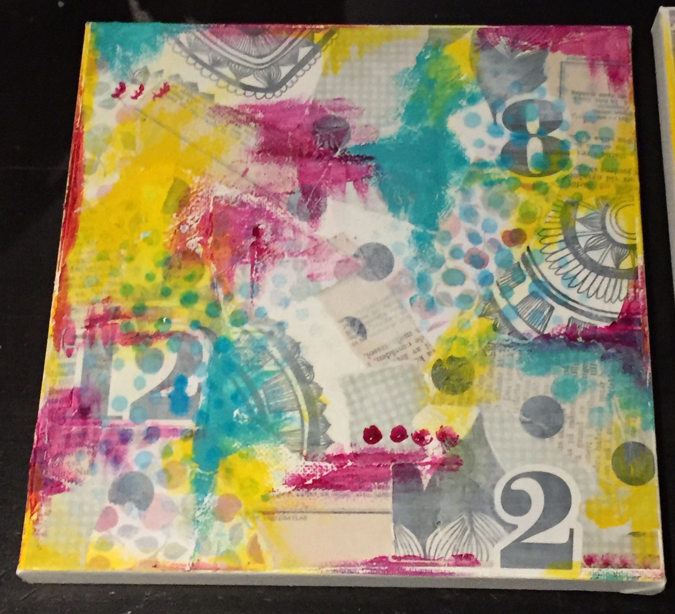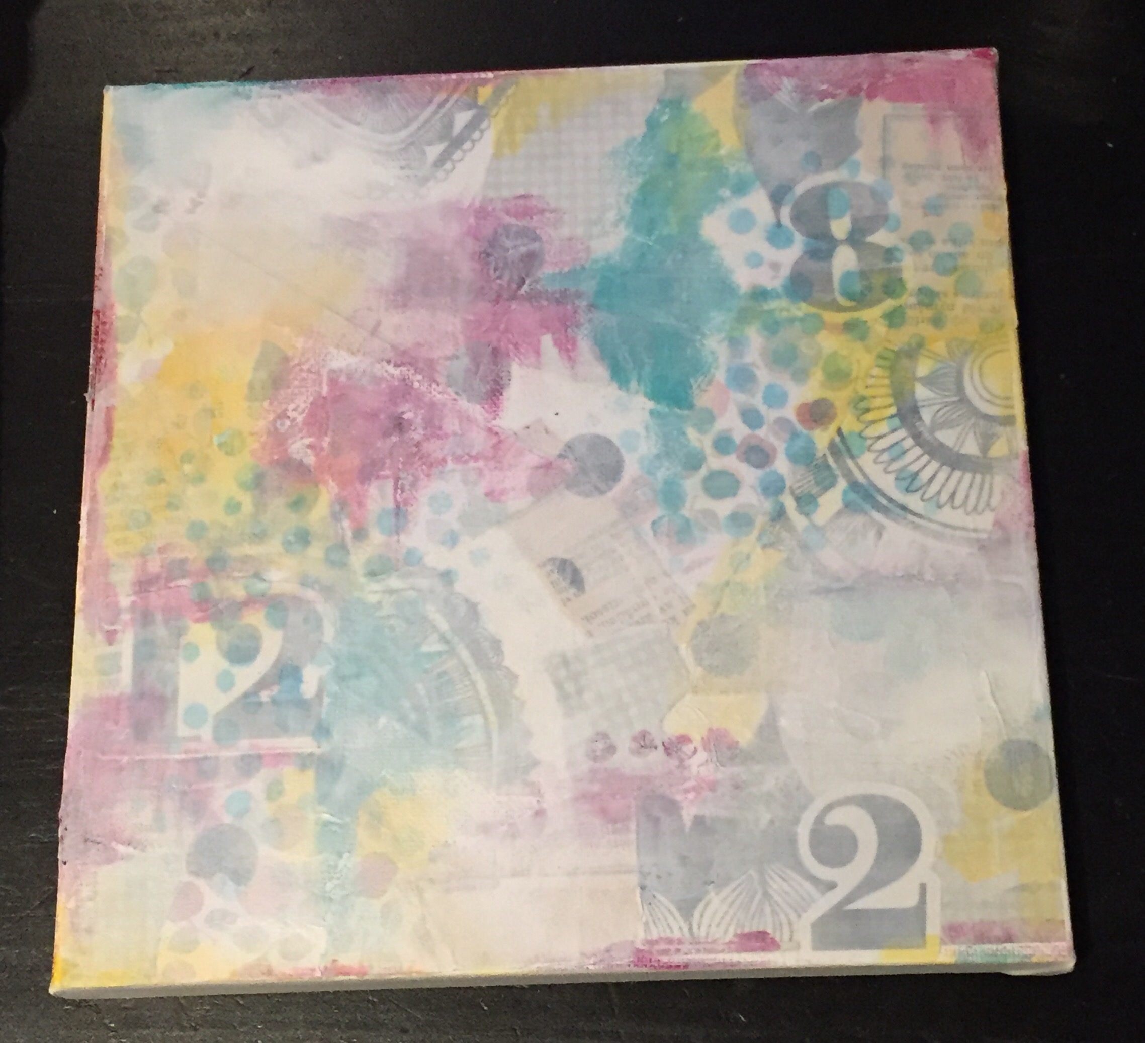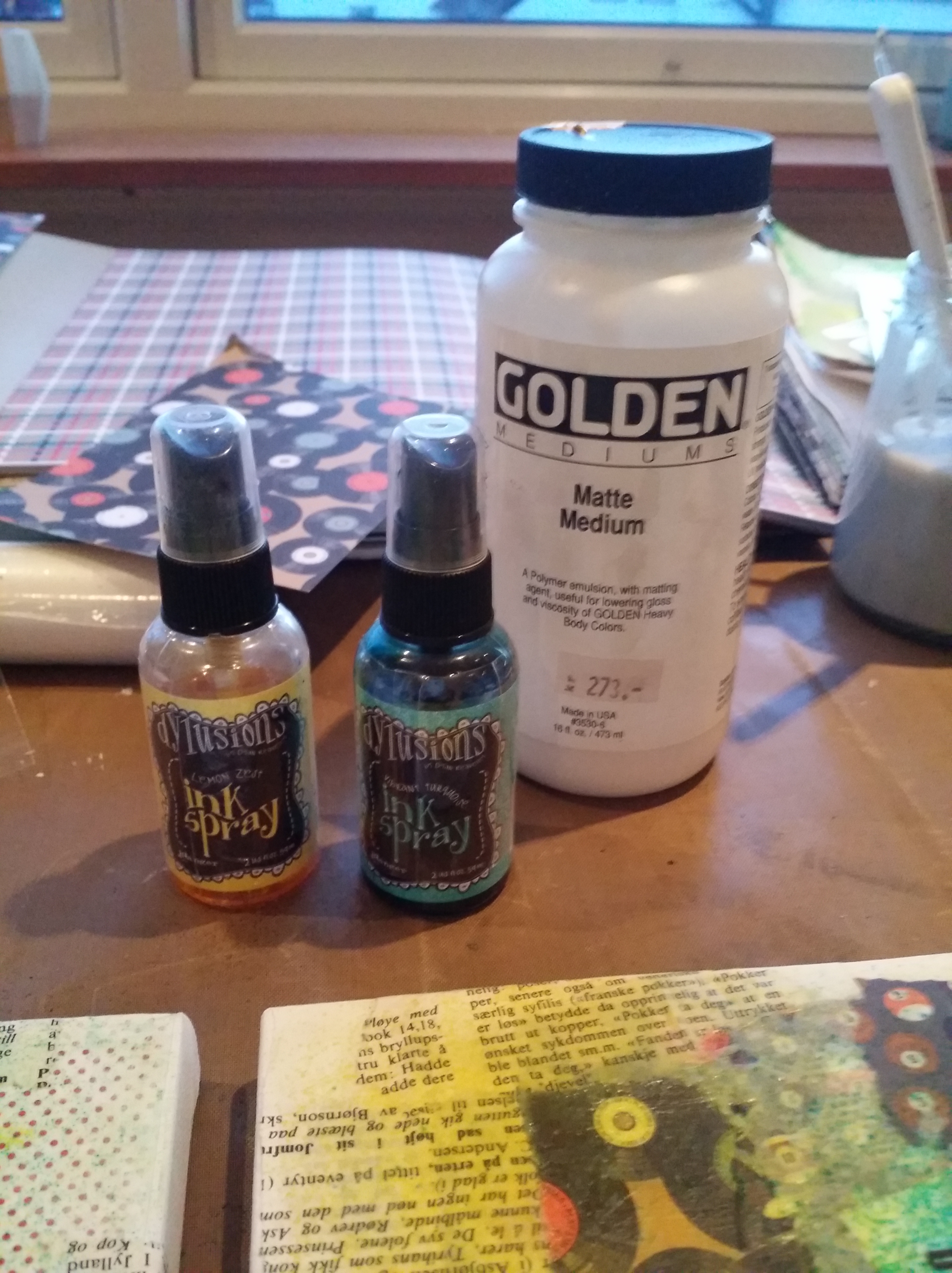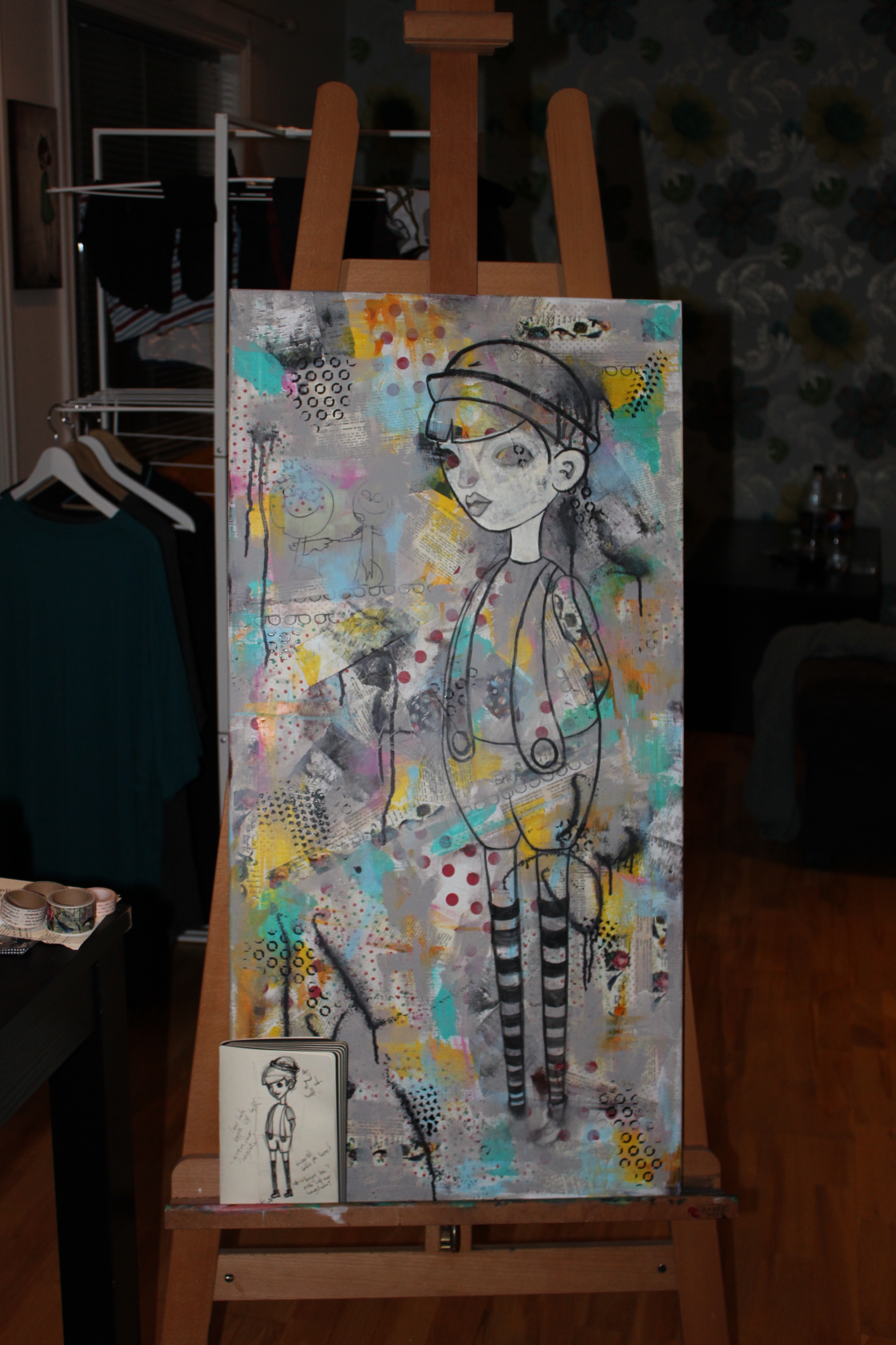 Bakgrunn under prosessen. Lag på lag med dekorark, boktekst, spraymaling, klistremerker, stempel, gesso og akrylmaling. Dette for å skape en spennende bakgrunn til doodletegningene mine.