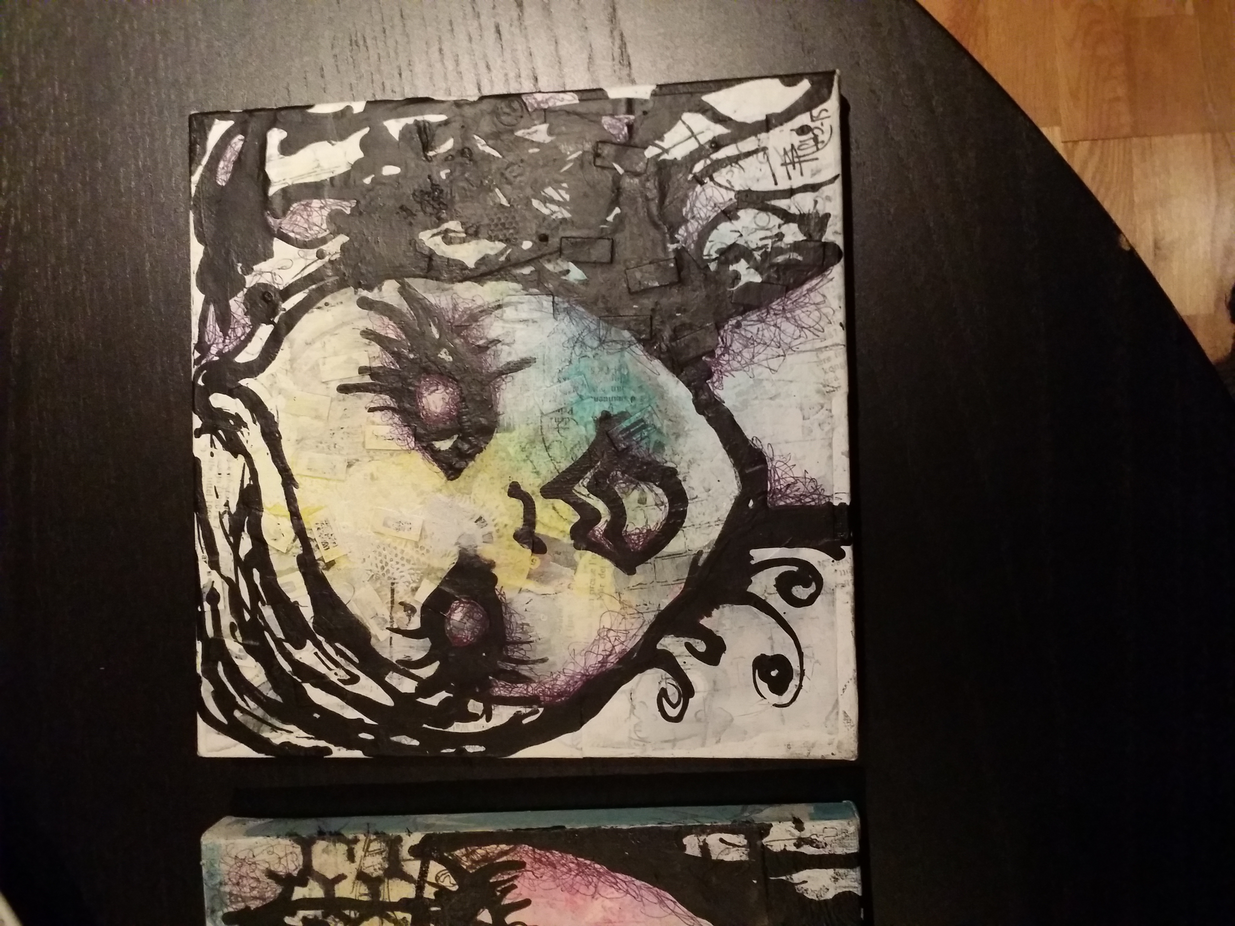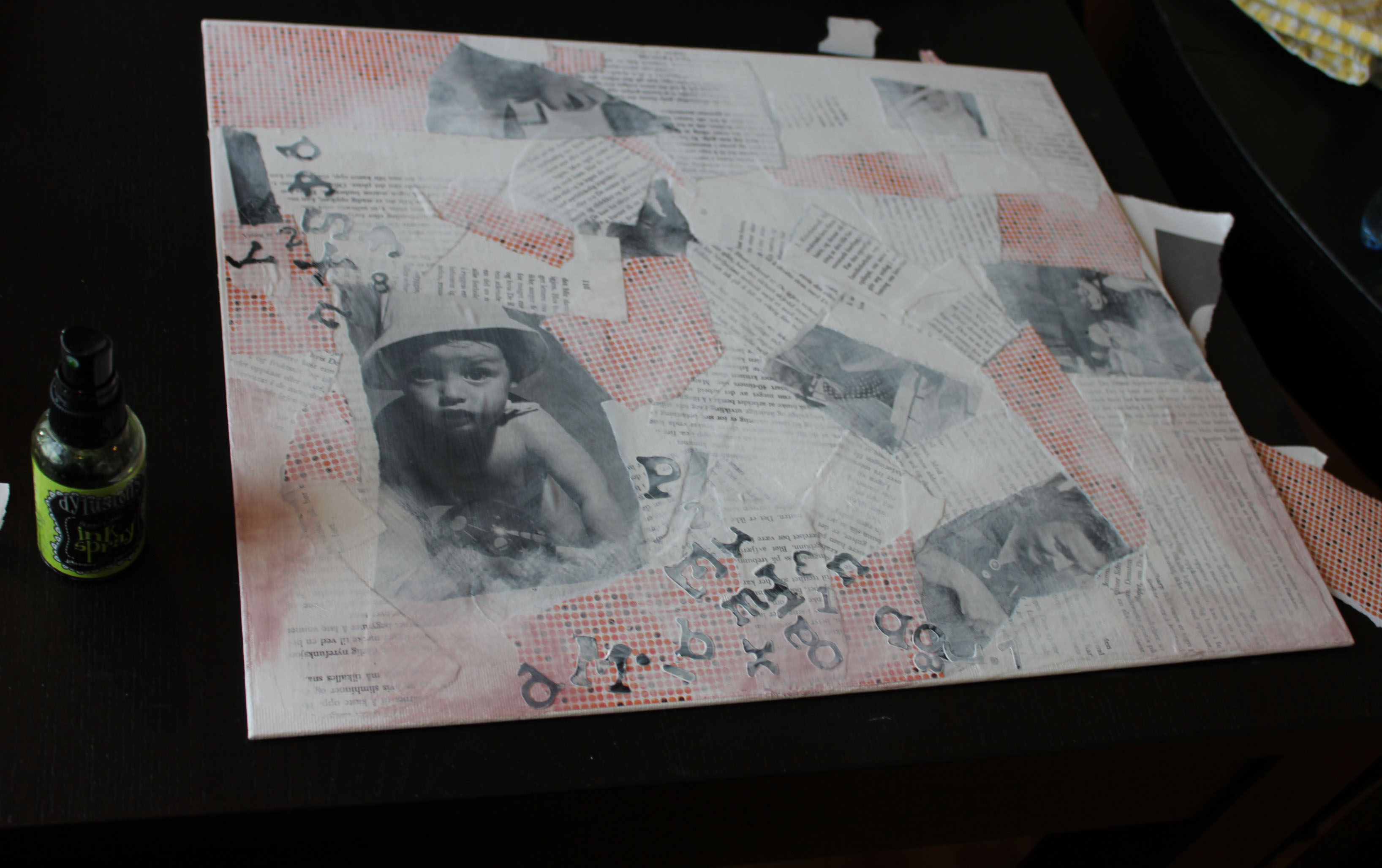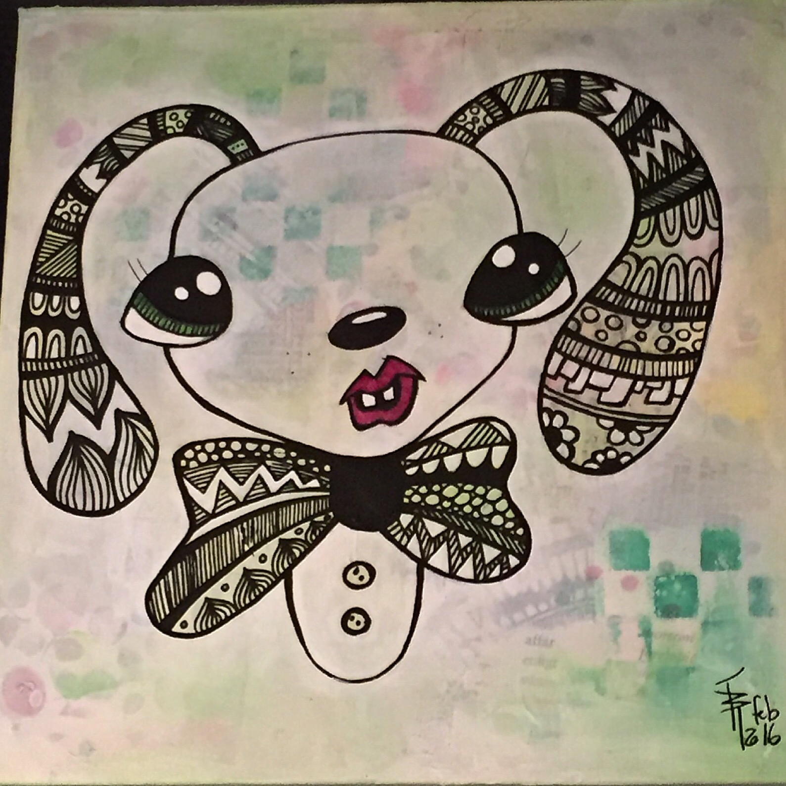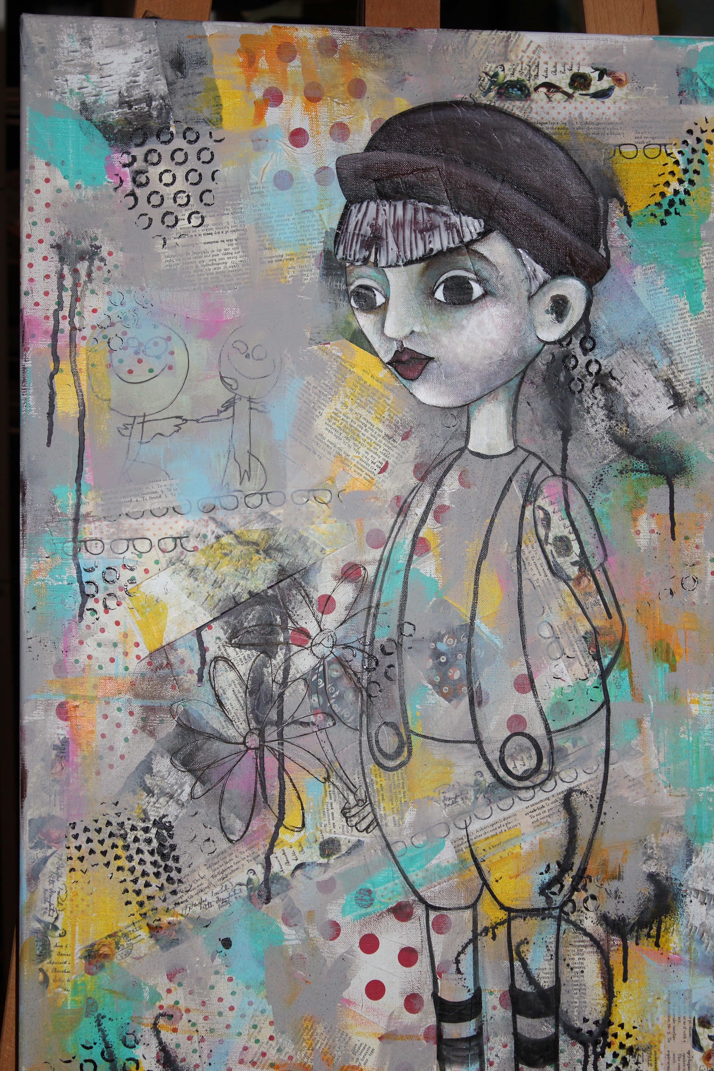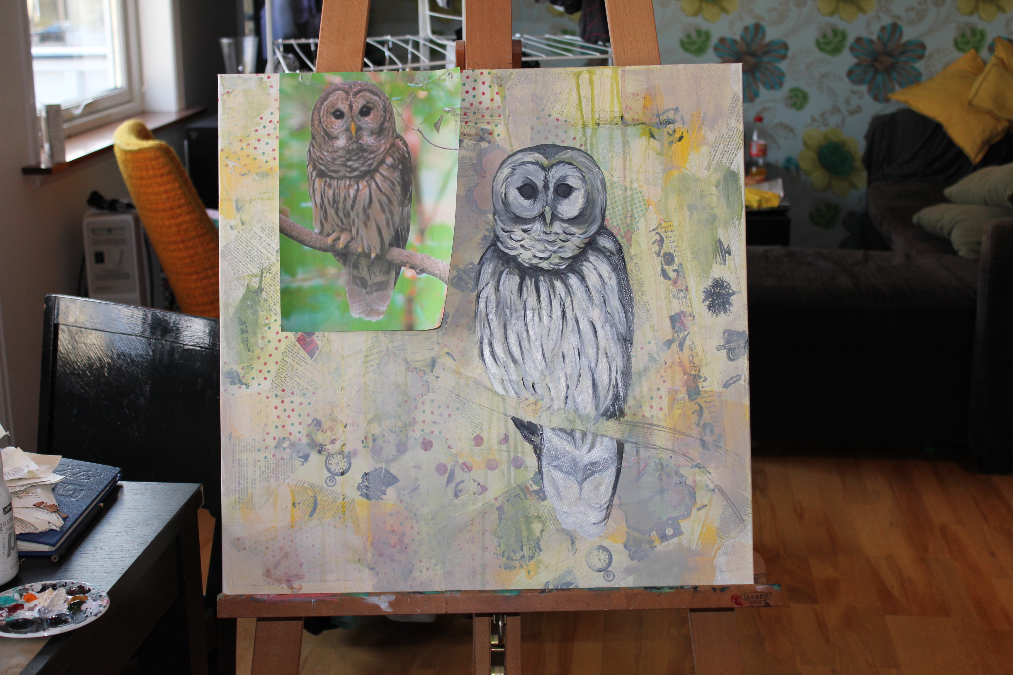 Bakgrunn under prosessen. Lag på lag med dekorark, boktekst, spraymaling, klistremerker, stempel, gesso og akrylmaling. Dette for å skape en spennende bakgrunn til doodletegningene mine.