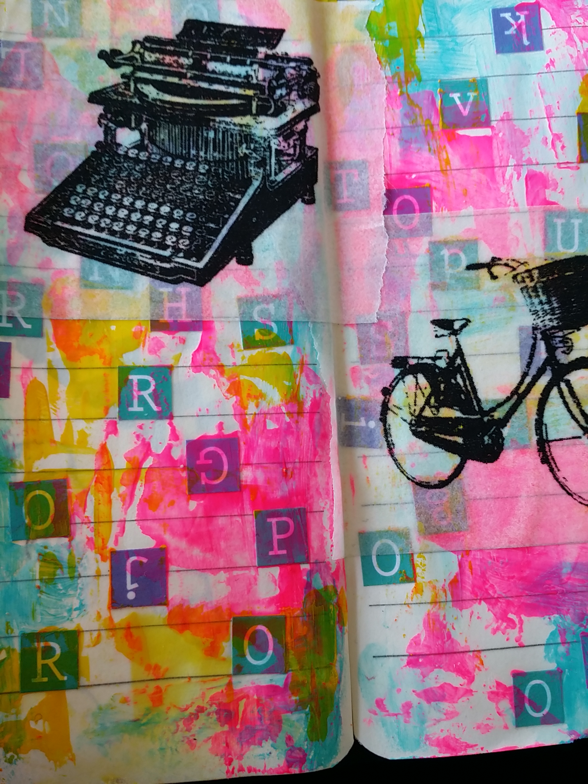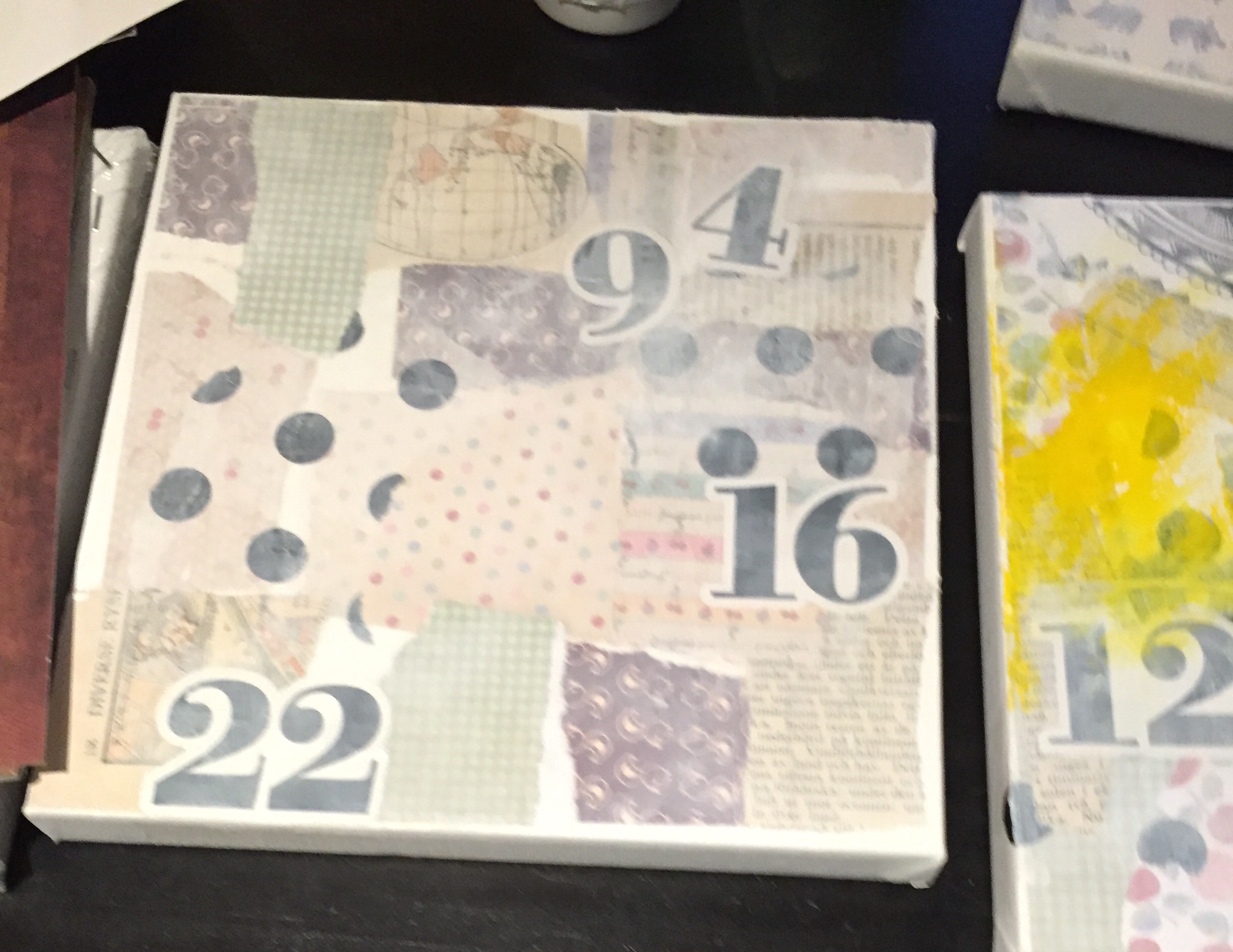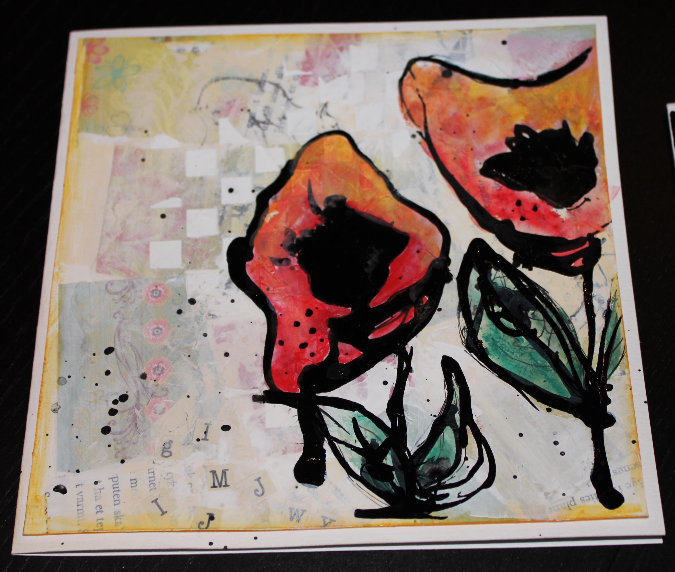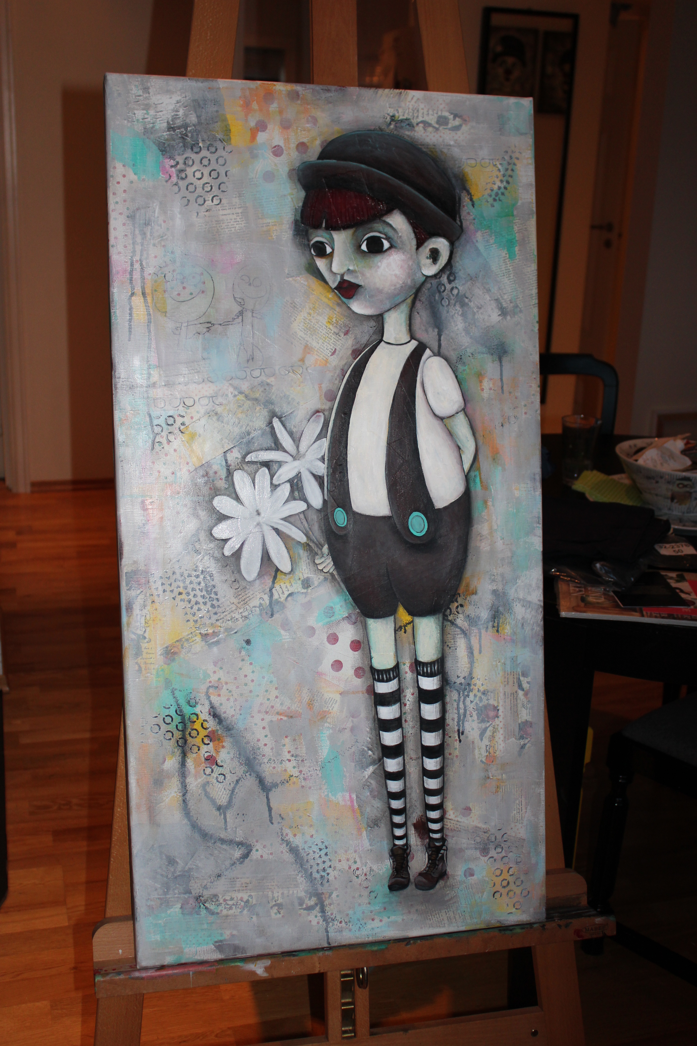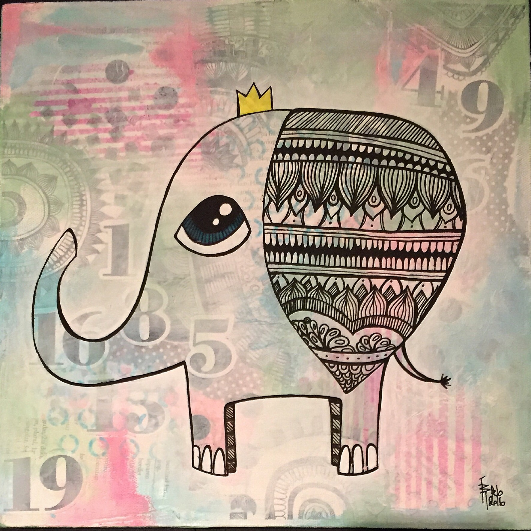 Bakgrunn under prosessen. Lag på lag med dekorark, boktekst, spraymaling, klistremerker, stempel, gesso og akrylmaling. Dette for å skape en spennende bakgrunn til doodletegningene mine.
