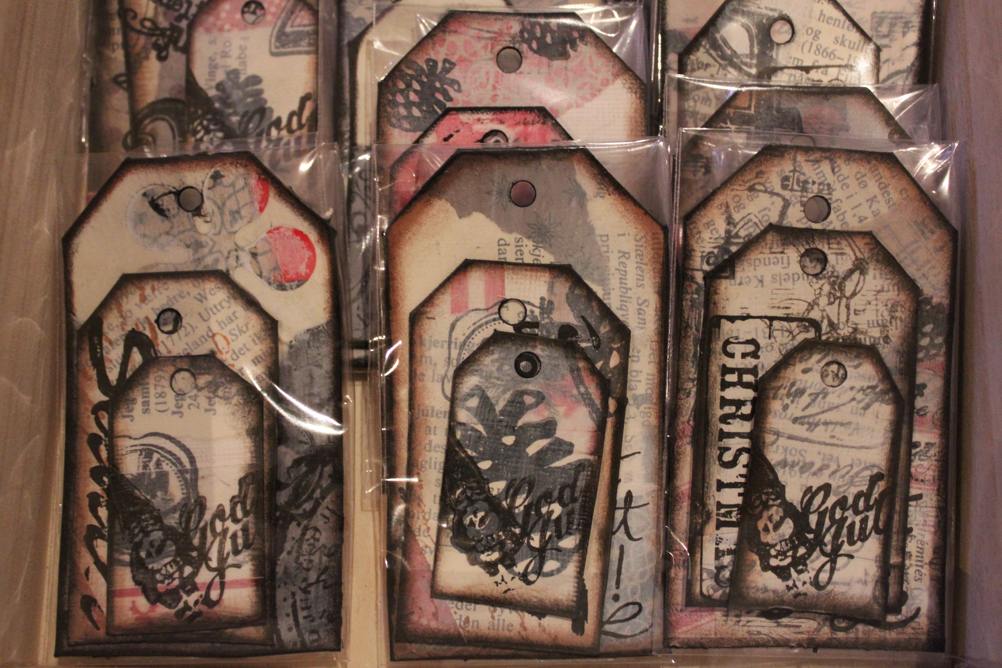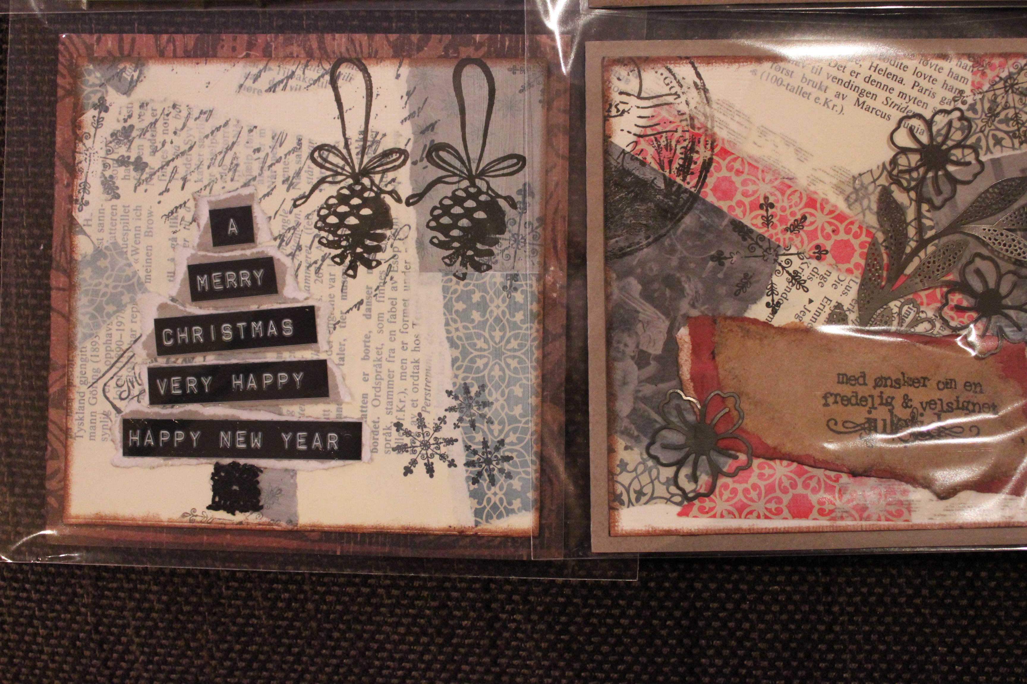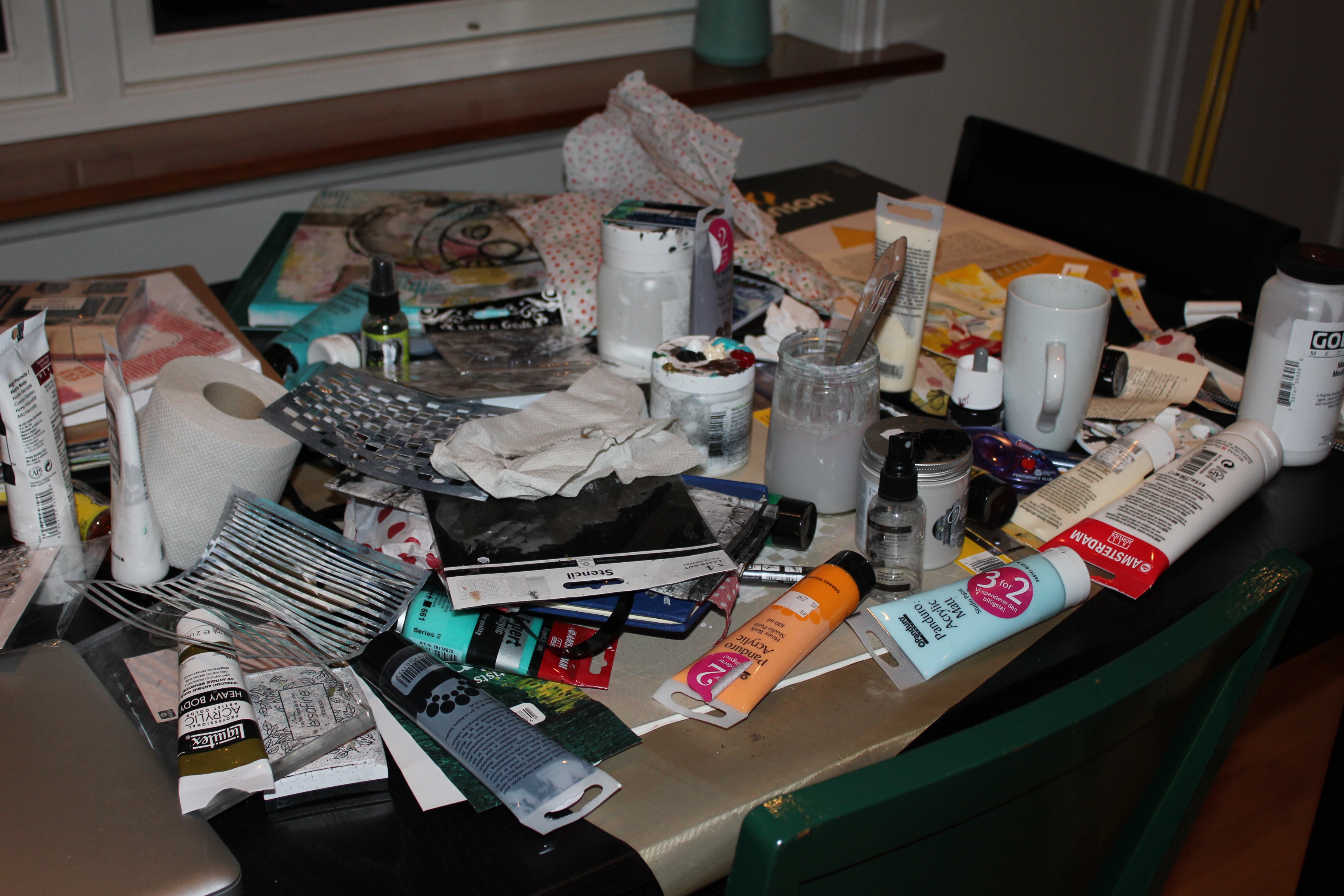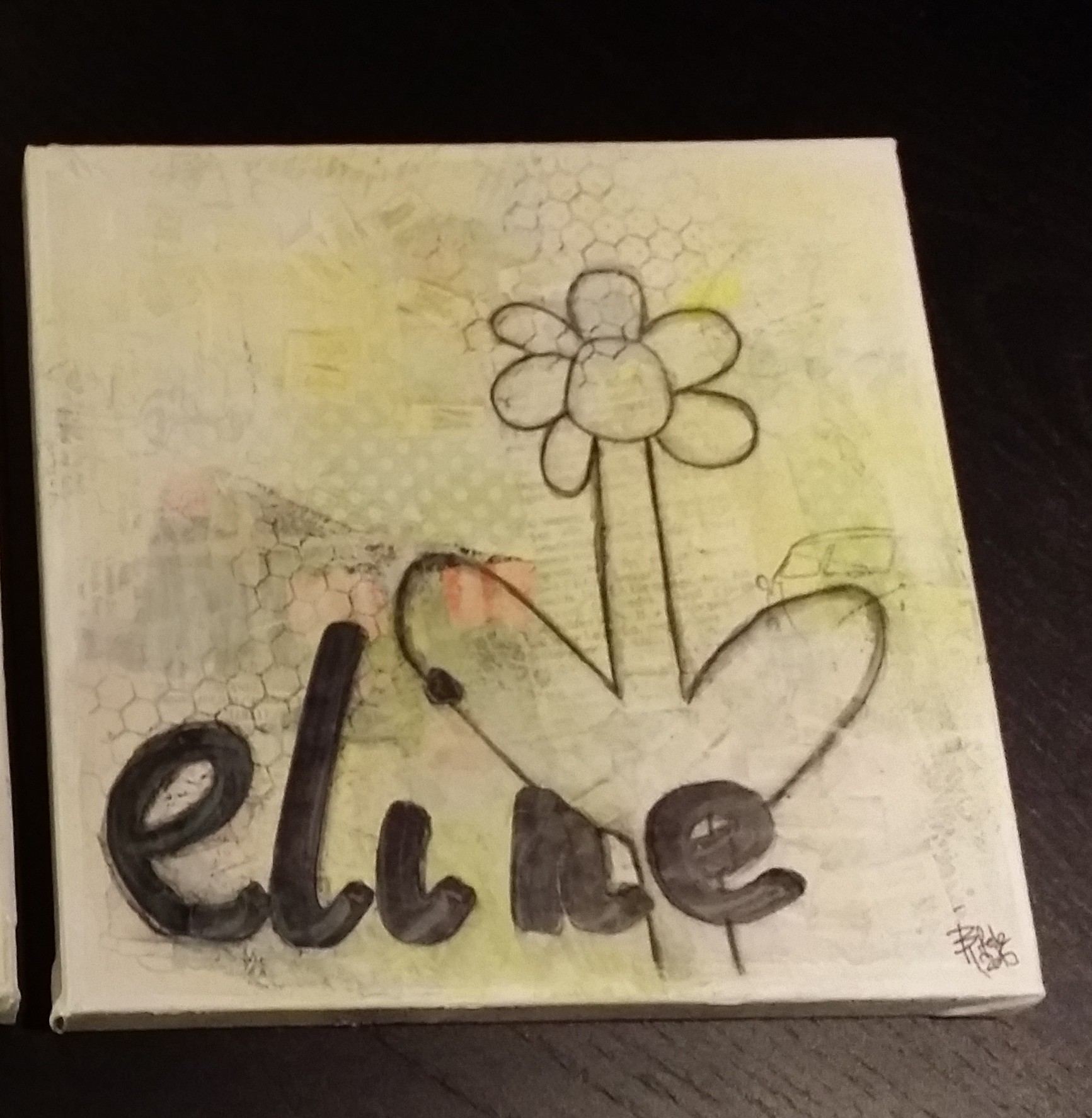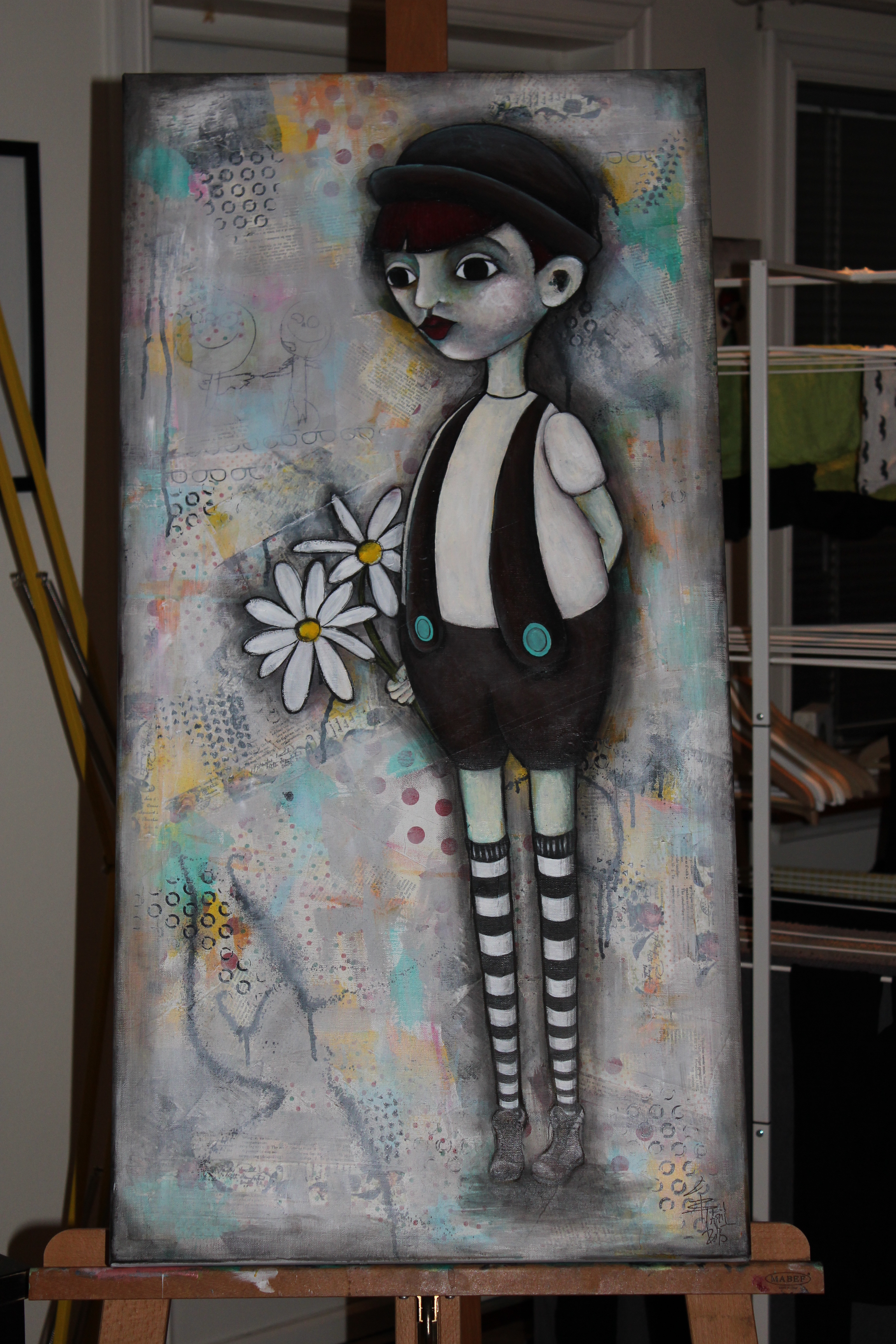 Bakgrunn under prosessen. Lag på lag med dekorark, boktekst, spraymaling, klistremerker, stempel, gesso og akrylmaling. Dette for å skape en spennende bakgrunn til doodletegningene mine.