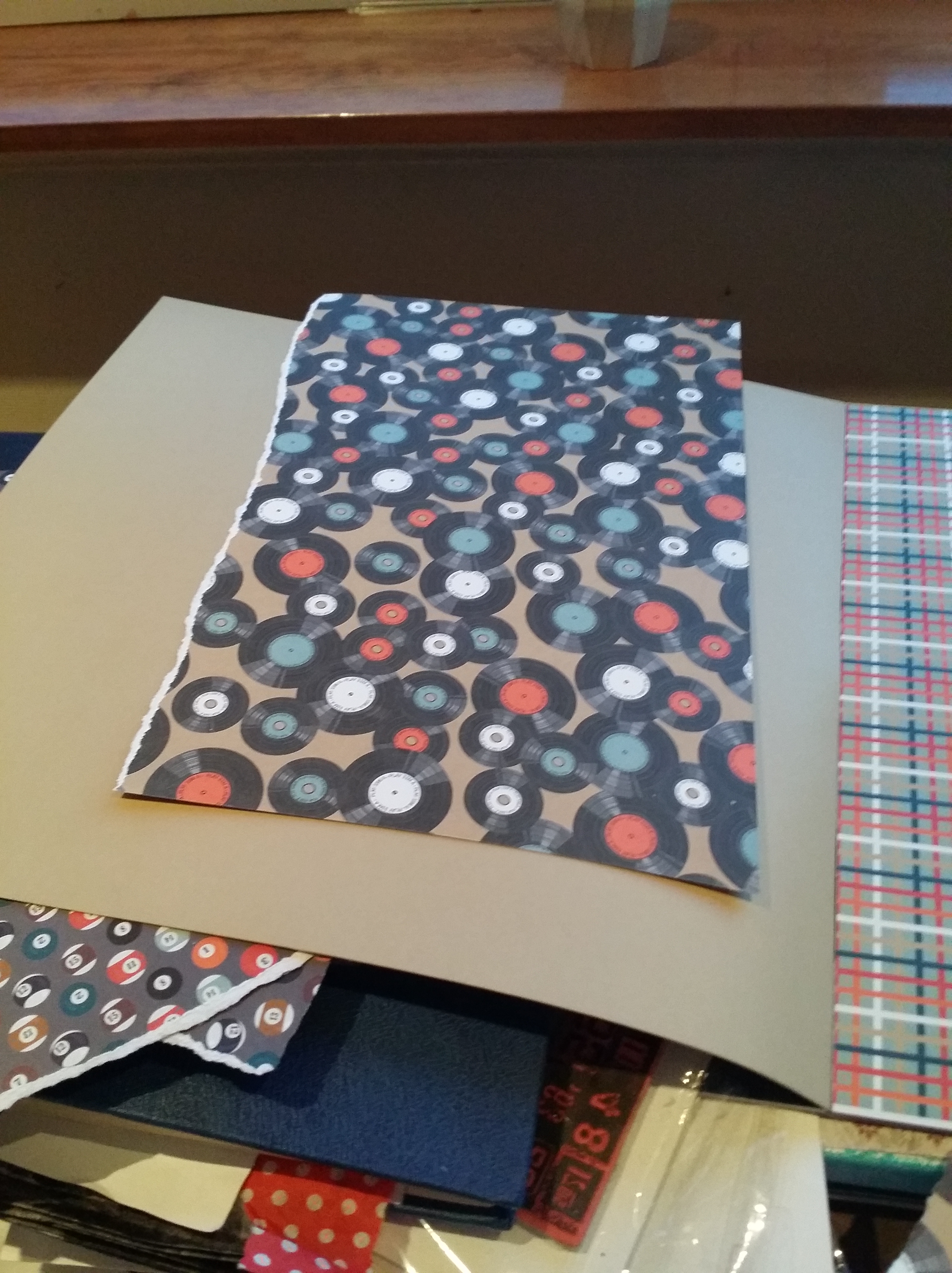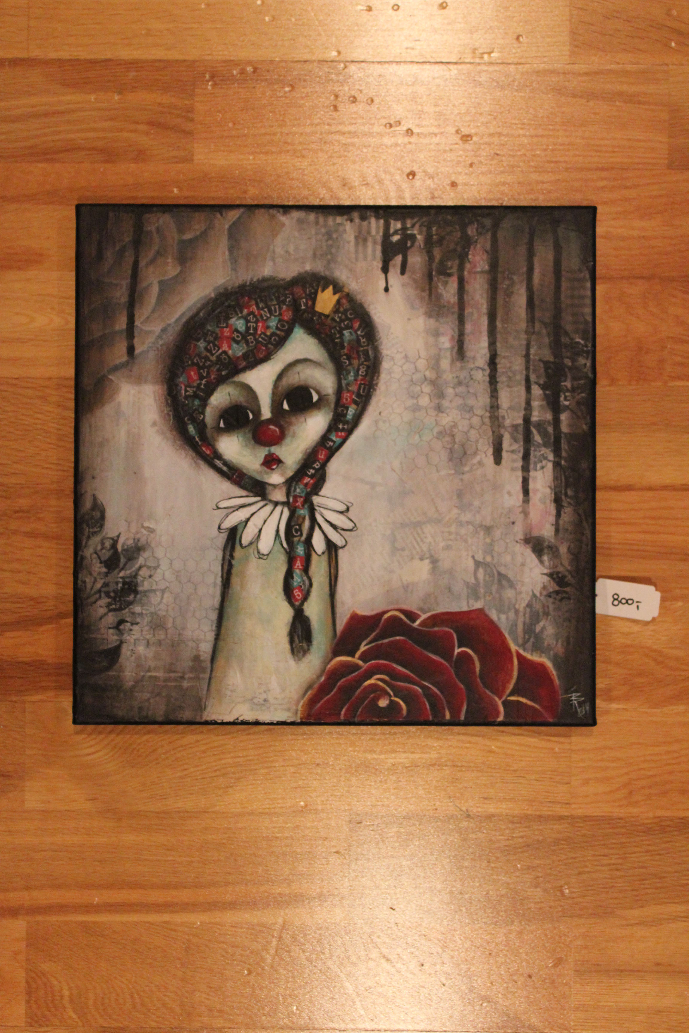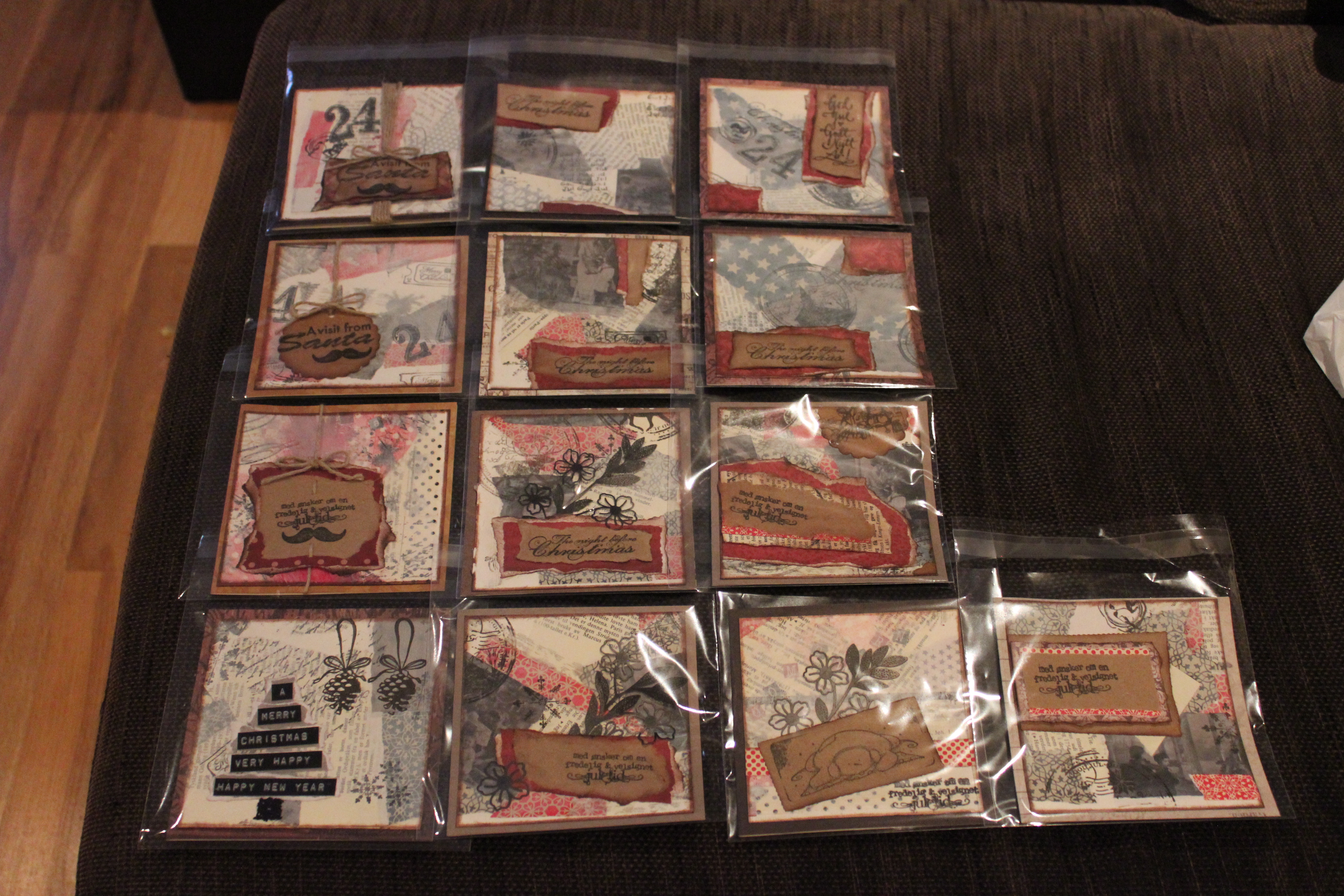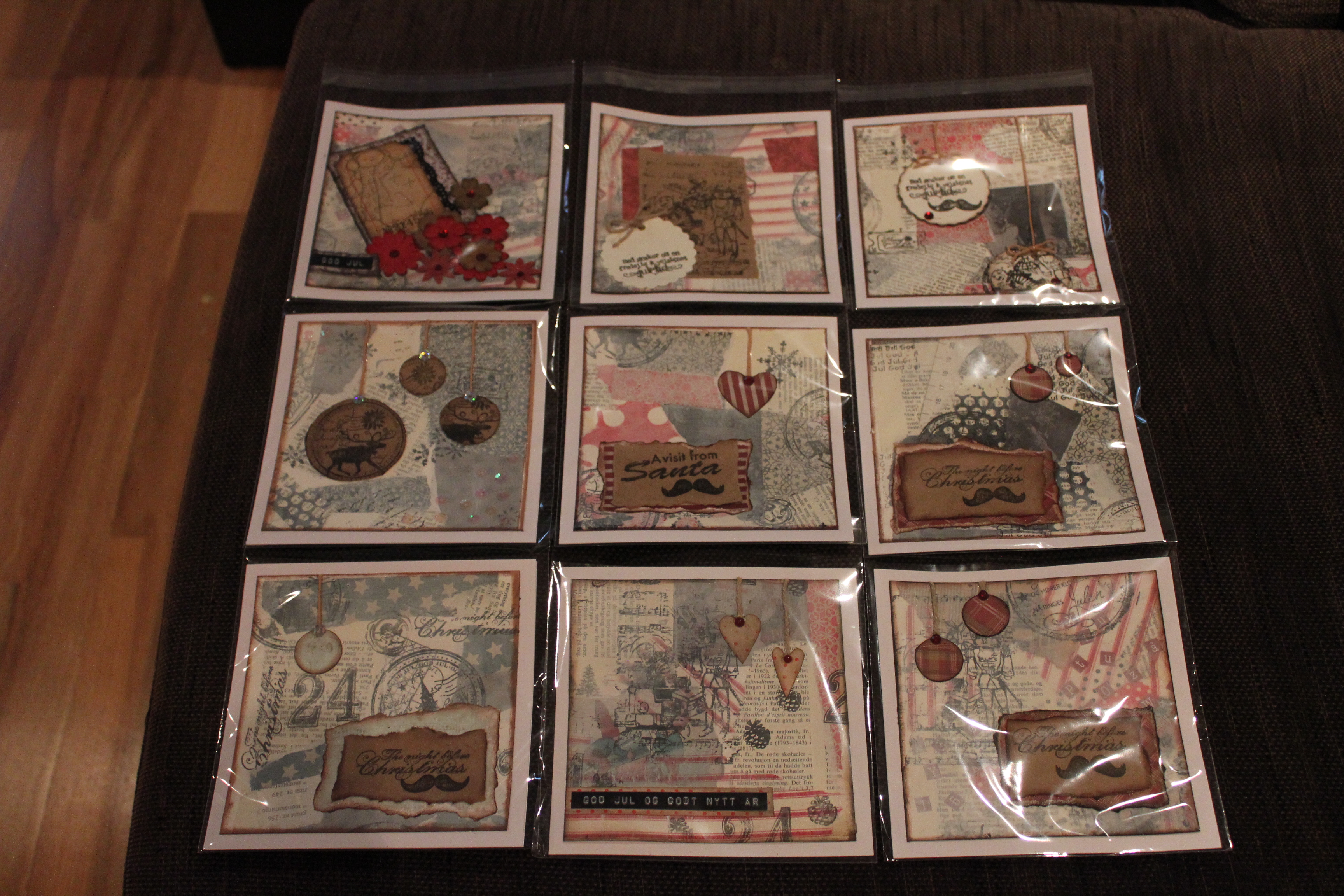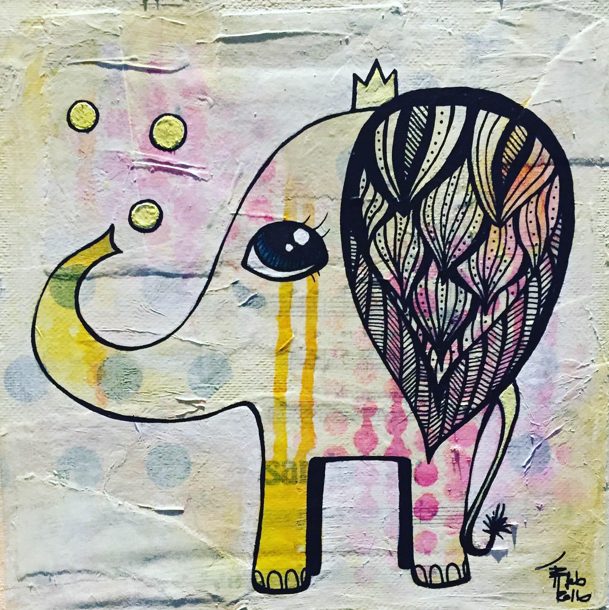 Bakgrunn under prosessen. Lag på lag med dekorark, boktekst, spraymaling, klistremerker, stempel, gesso og akrylmaling. Dette for å skape en spennende bakgrunn til doodletegningene mine.
