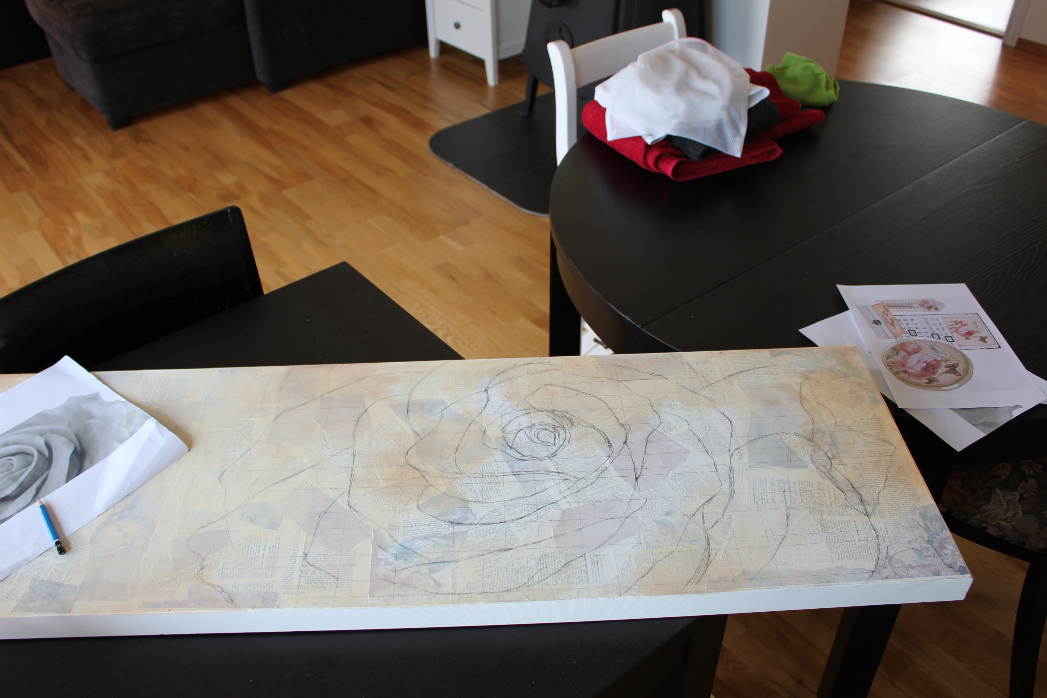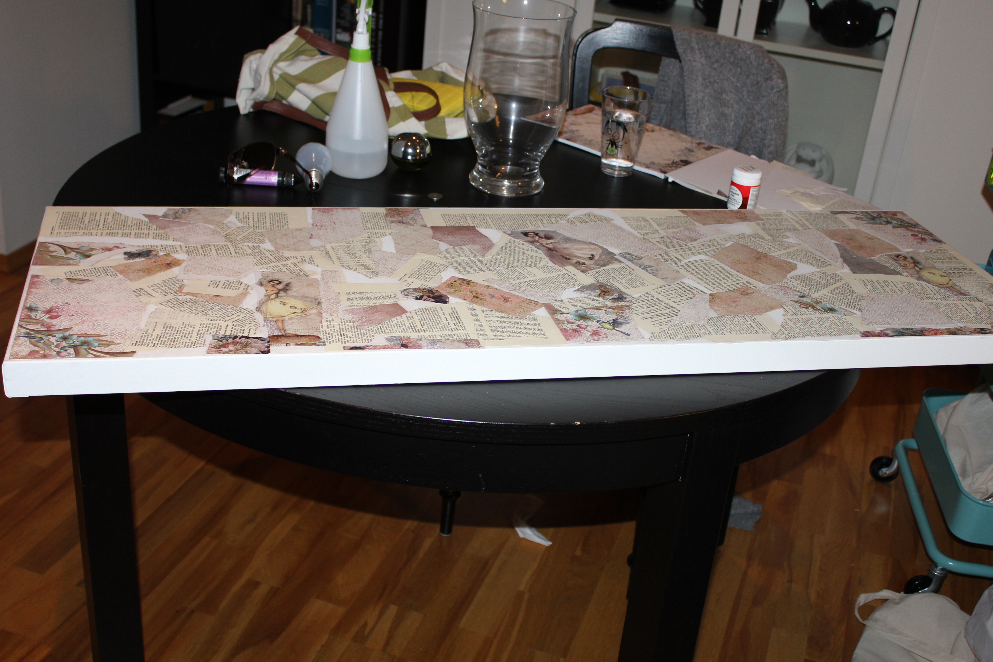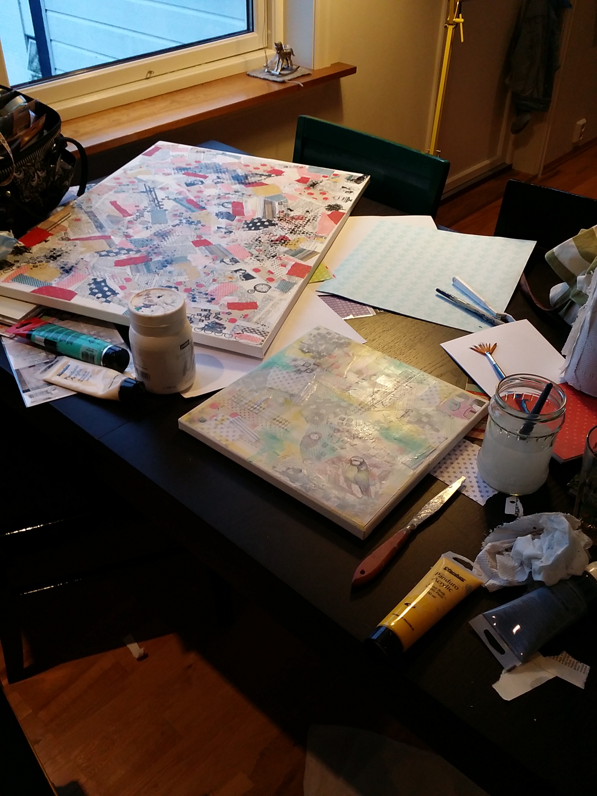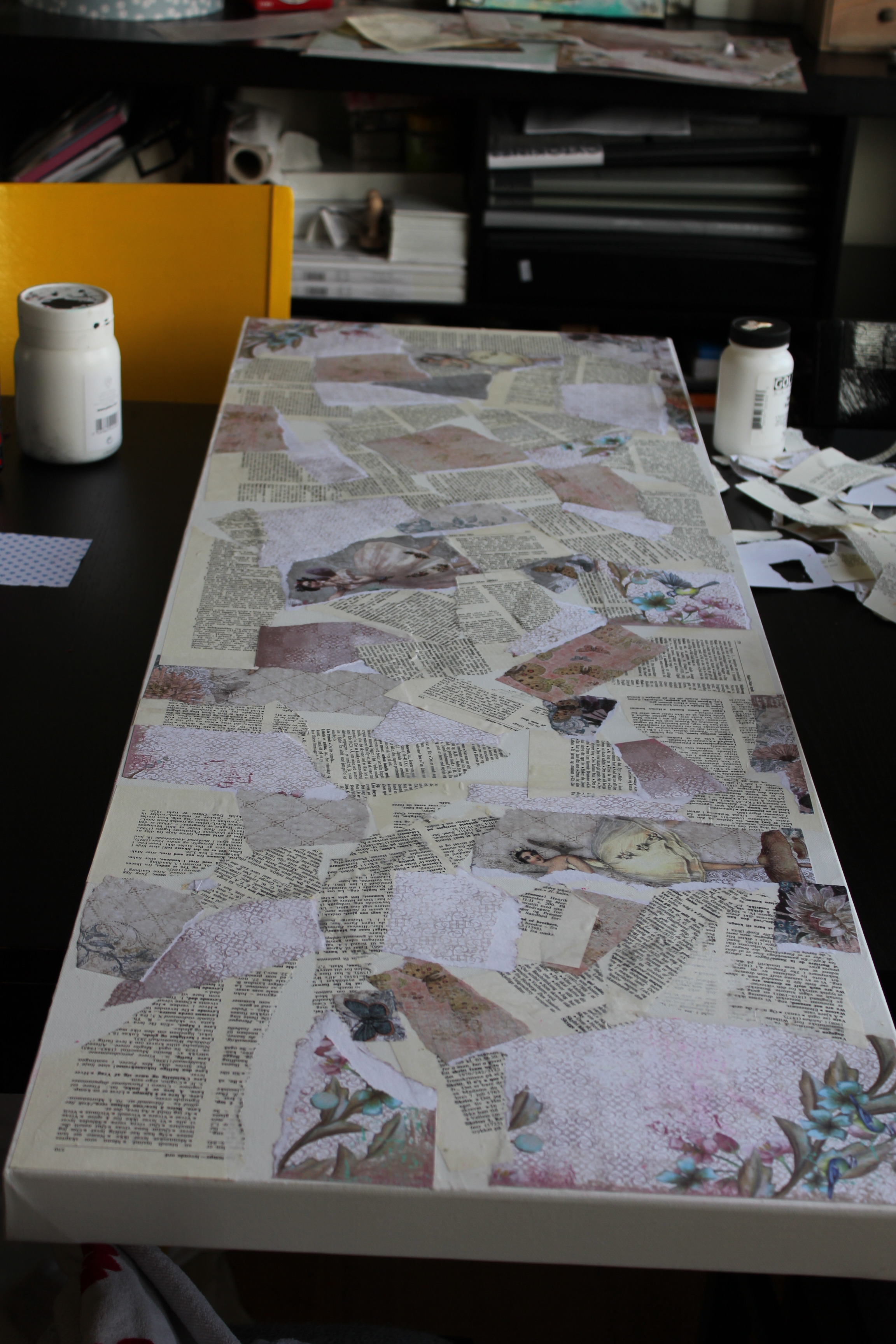 På videoen under fra instagramkontoen min er jeg igang med et nytt prosjekt. Litt usikker på hva det skal bli tilslutt, men noe blir det. Forelpig er det et 50x100cm lerret halvveis dekket med collage: