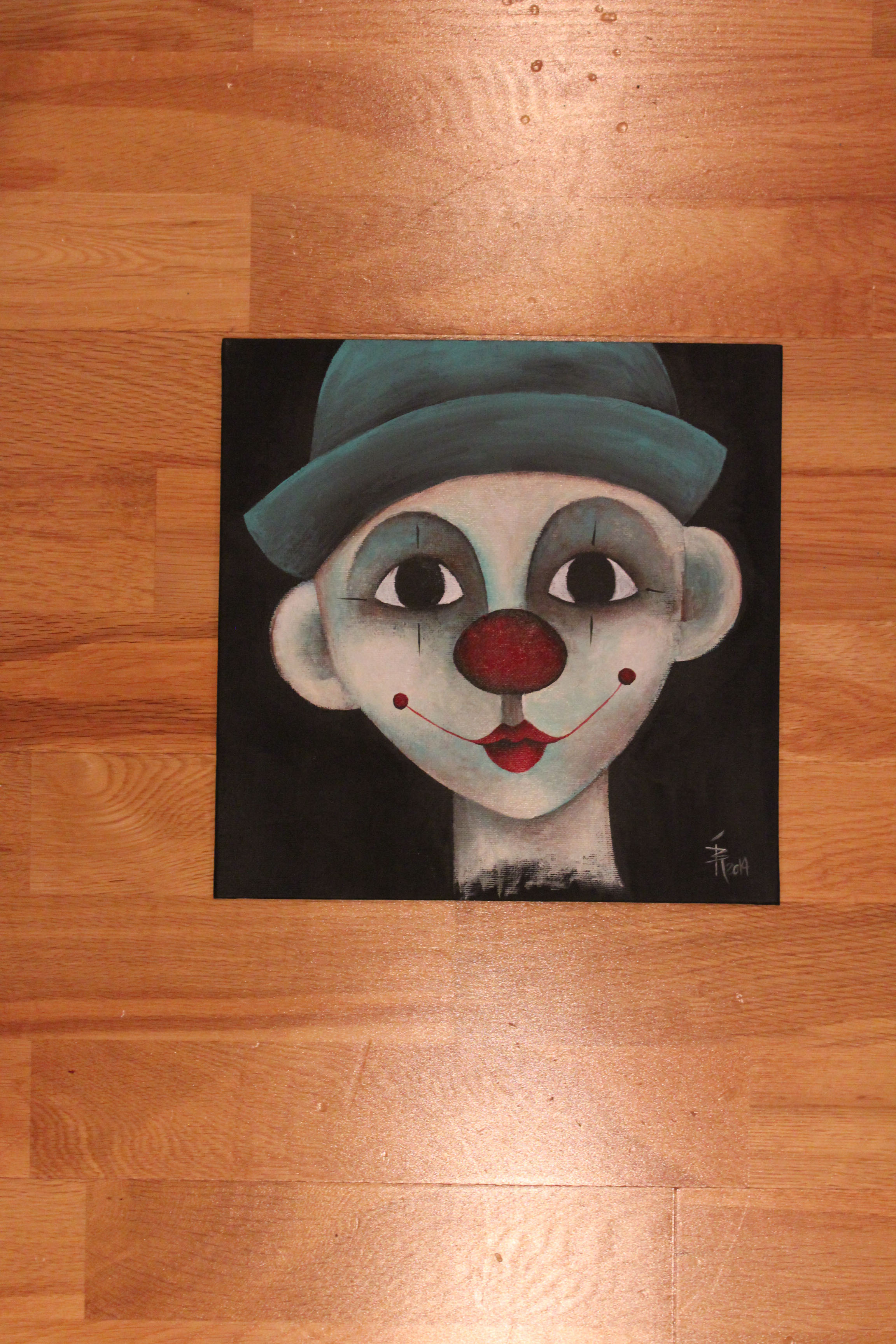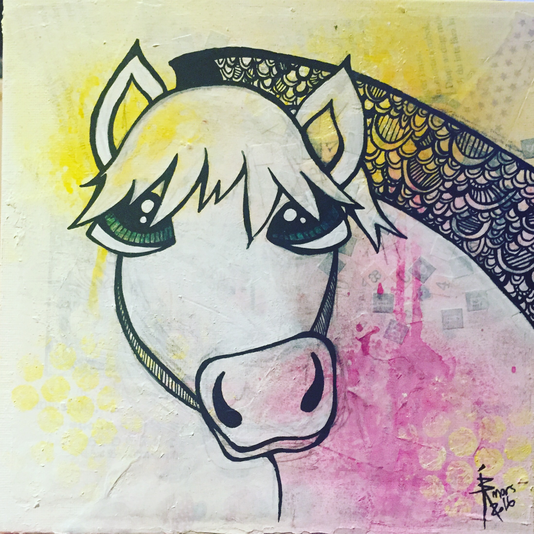Hest med lillablå øyne. Mixedmedia på lerret, 20x20cm.