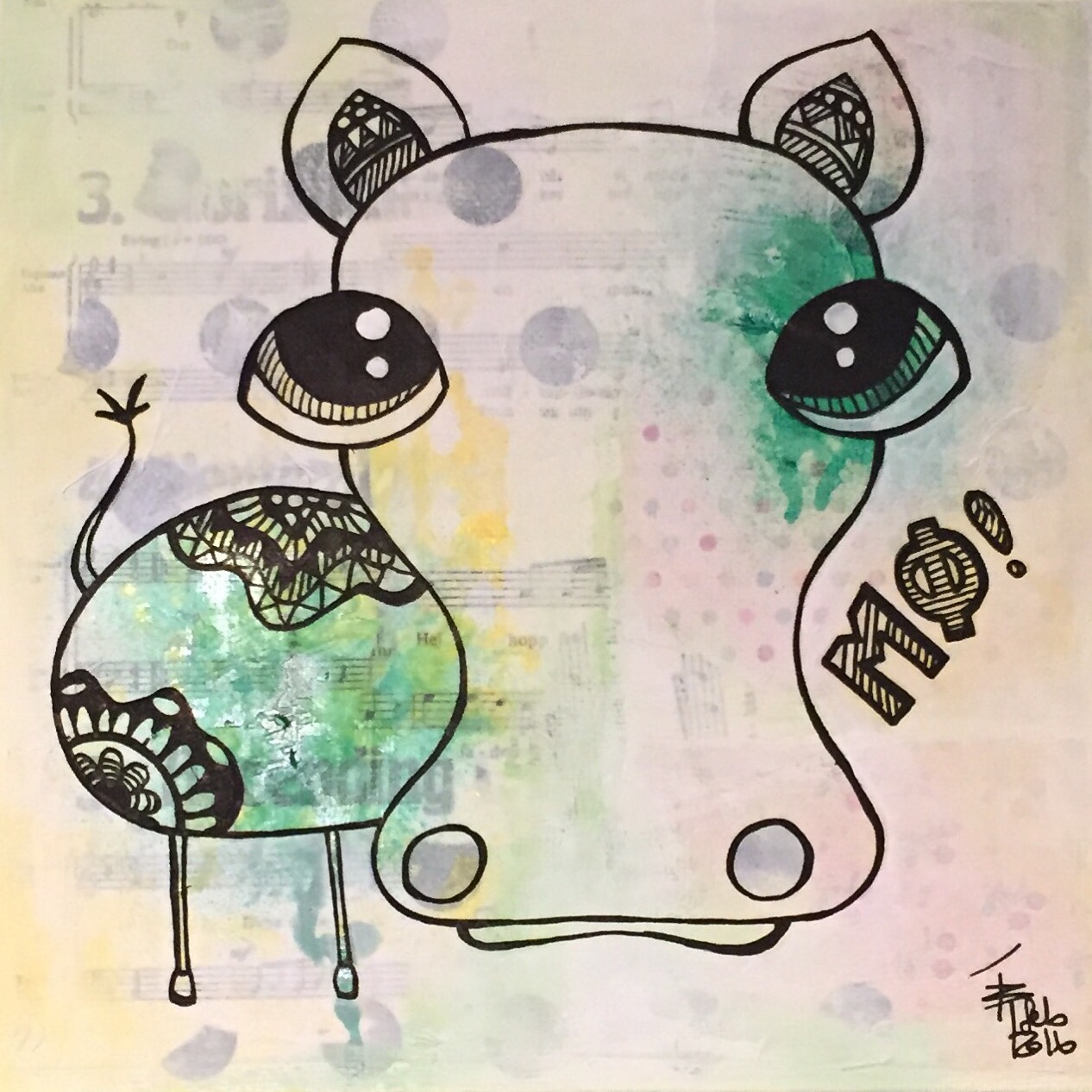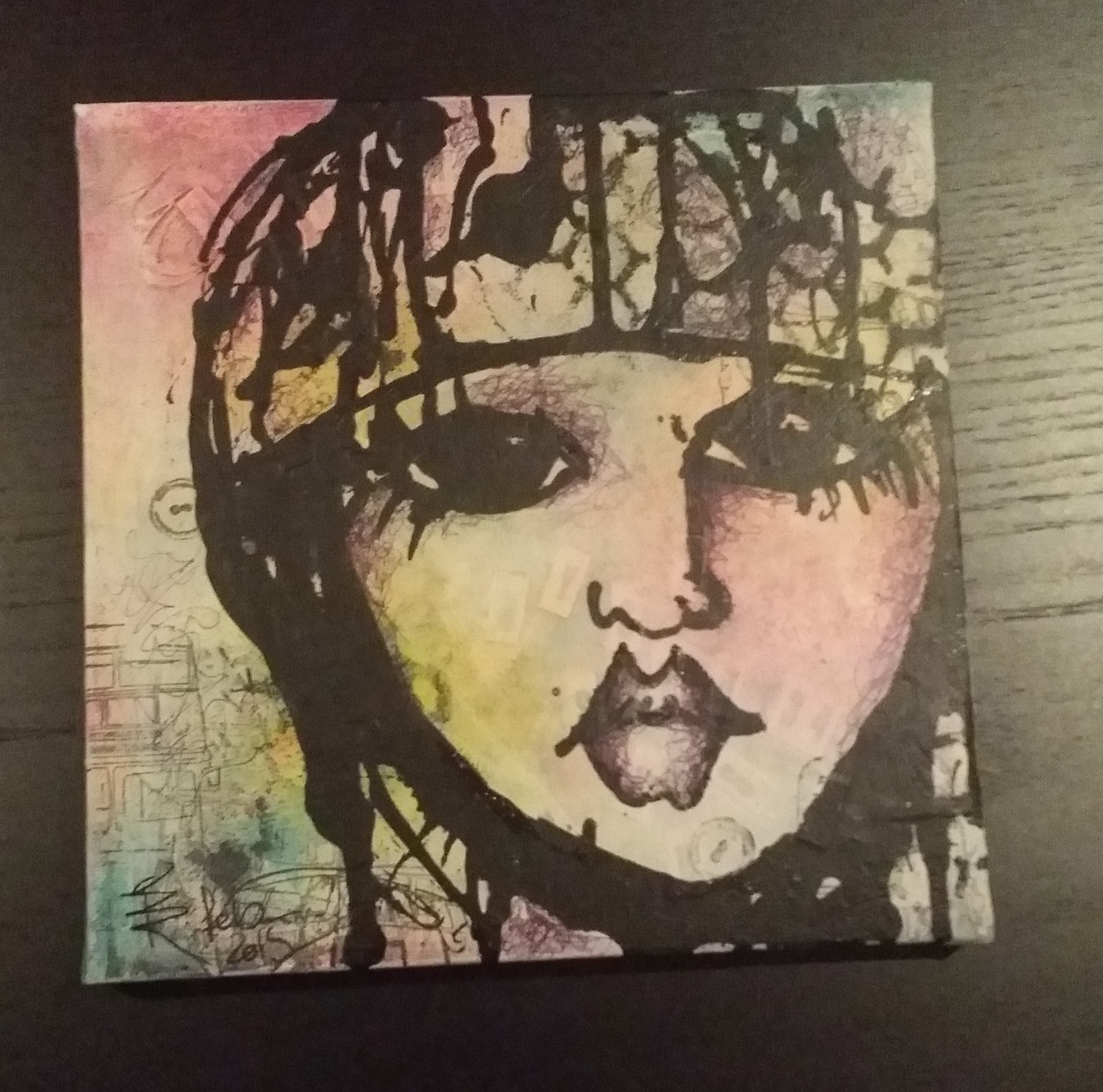 Hest med lilla øyne. Mixedmedia på lerret, 20x20cm.