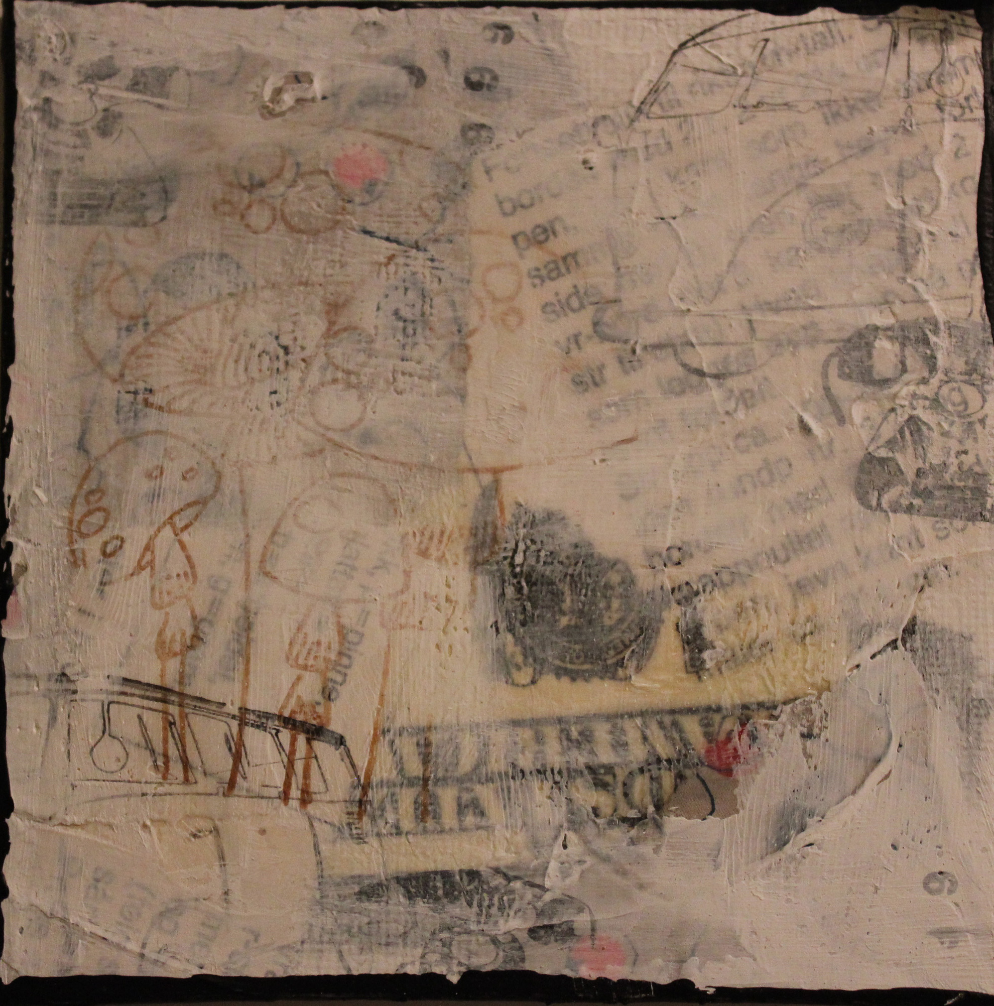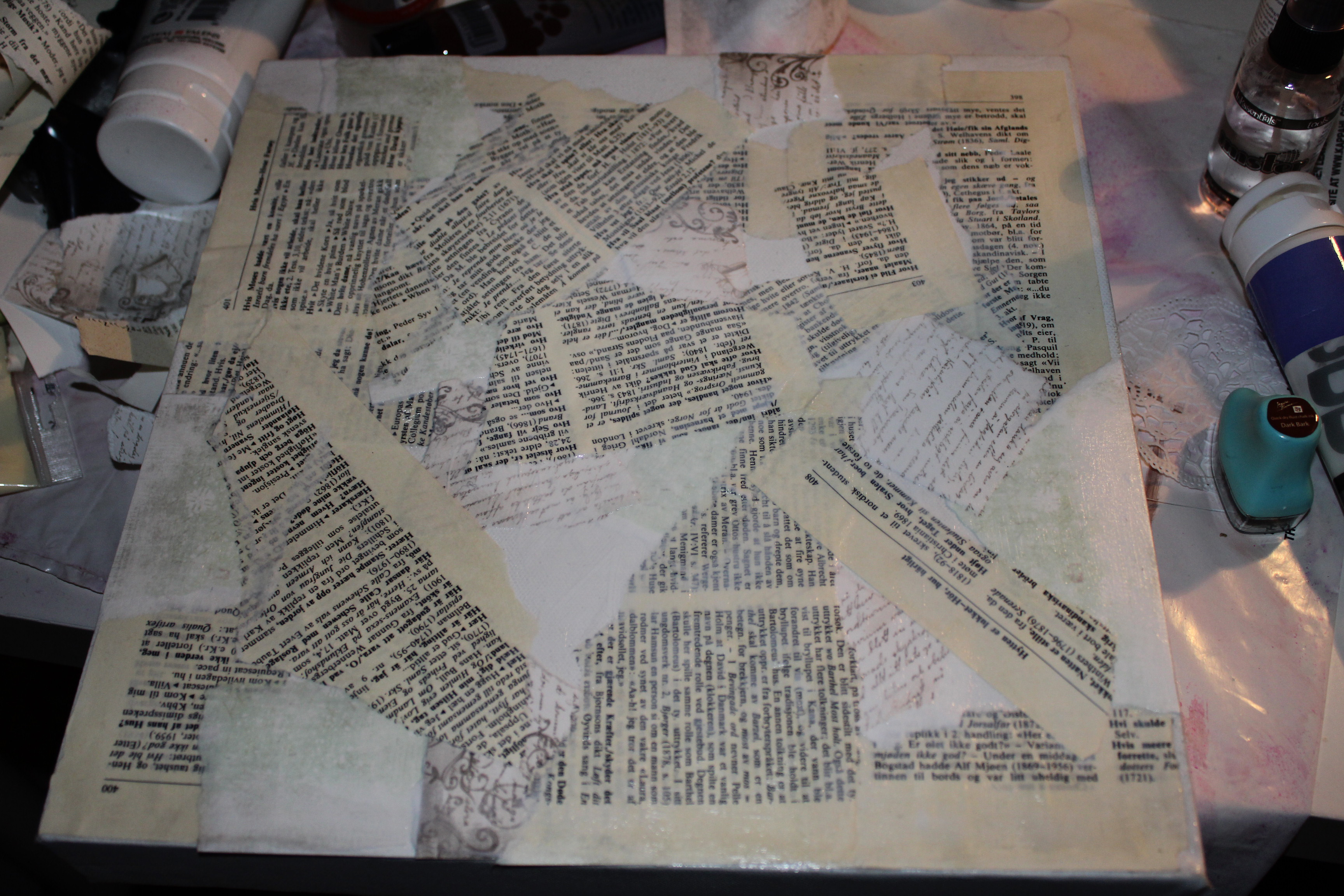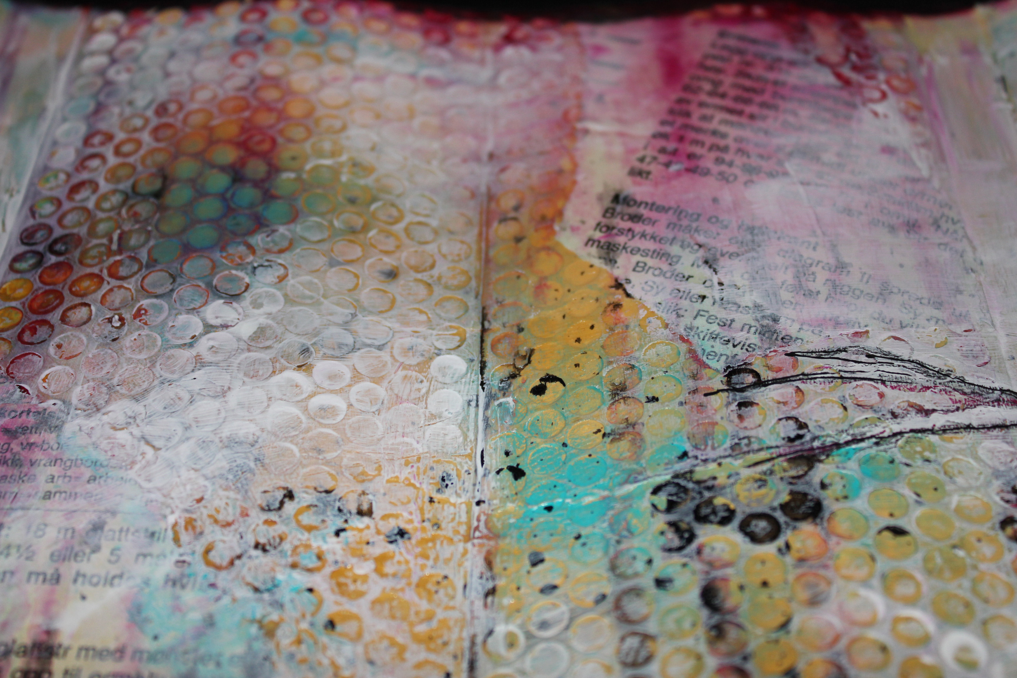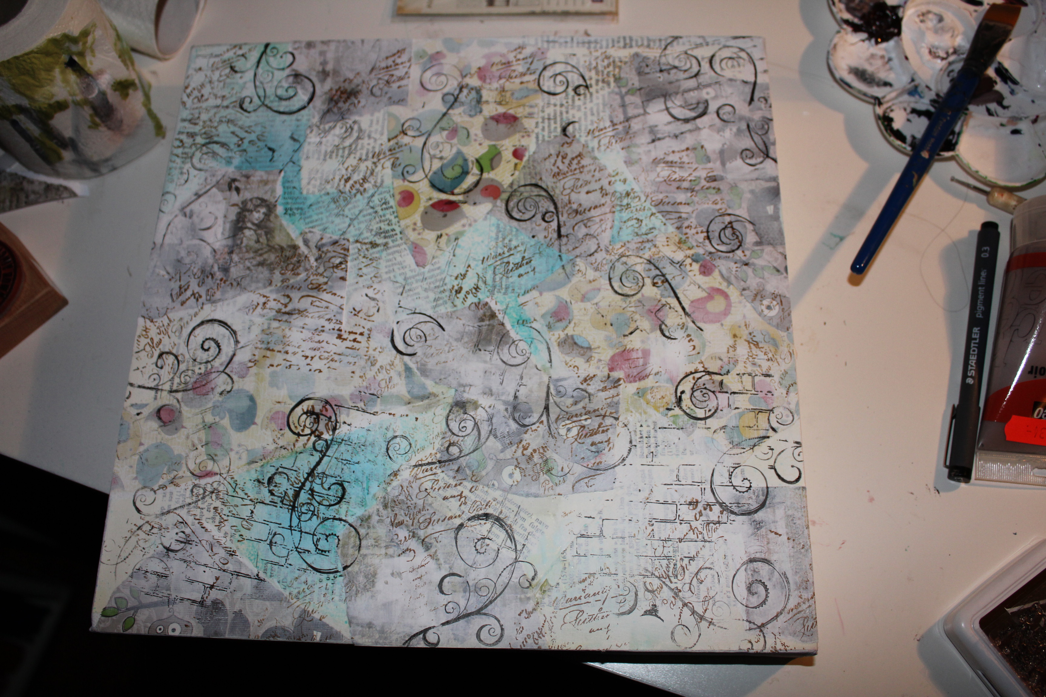 Ettersom det er mixed-media som er teknikken i mitt hjerte for tiden, er det også slik jeg går frem på disse små lerretene. Jeg lager først til en bakgrunn av ulike lag med papir, så litt gesso, stempler og enda mer gesso. Deretter velger jeg mellom pensler og akryl eller inktense fargeblyanter og blyanter. Her er noen bilder så langt: