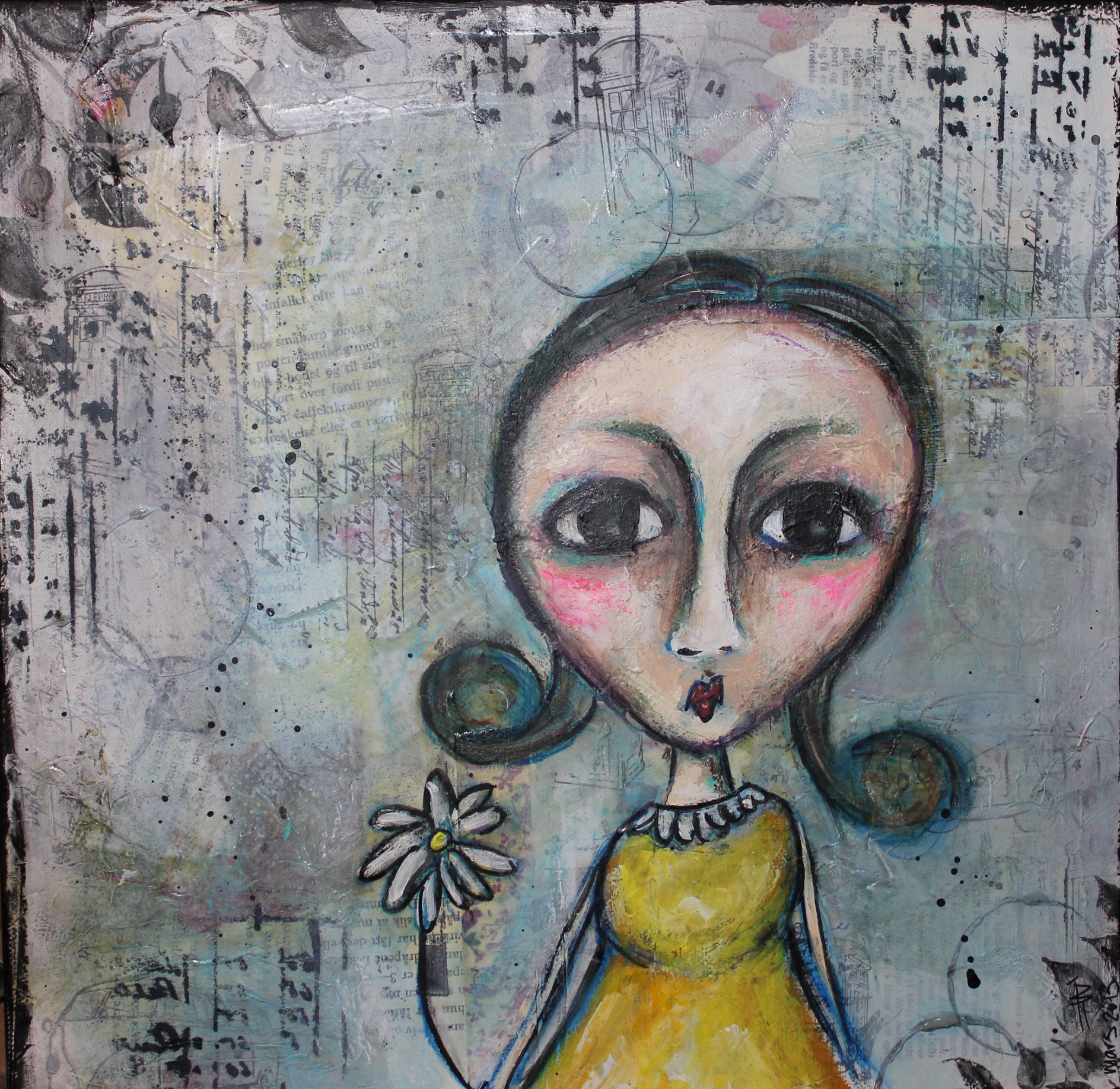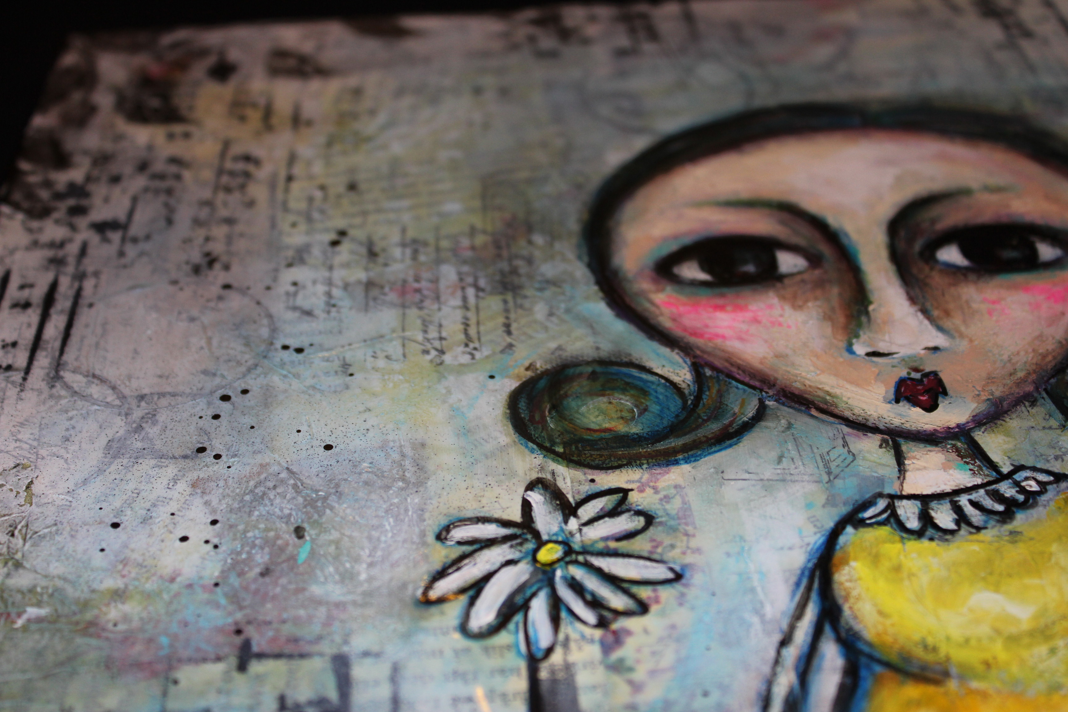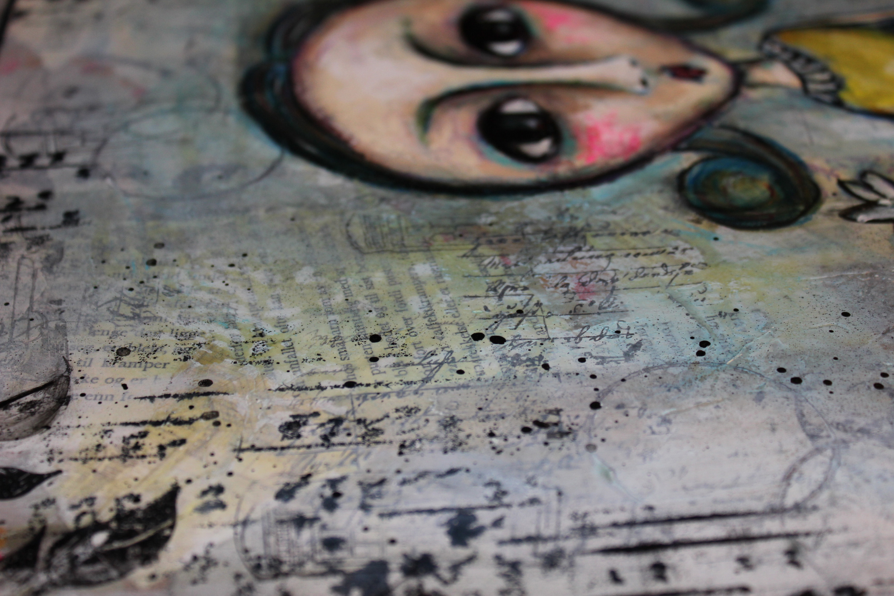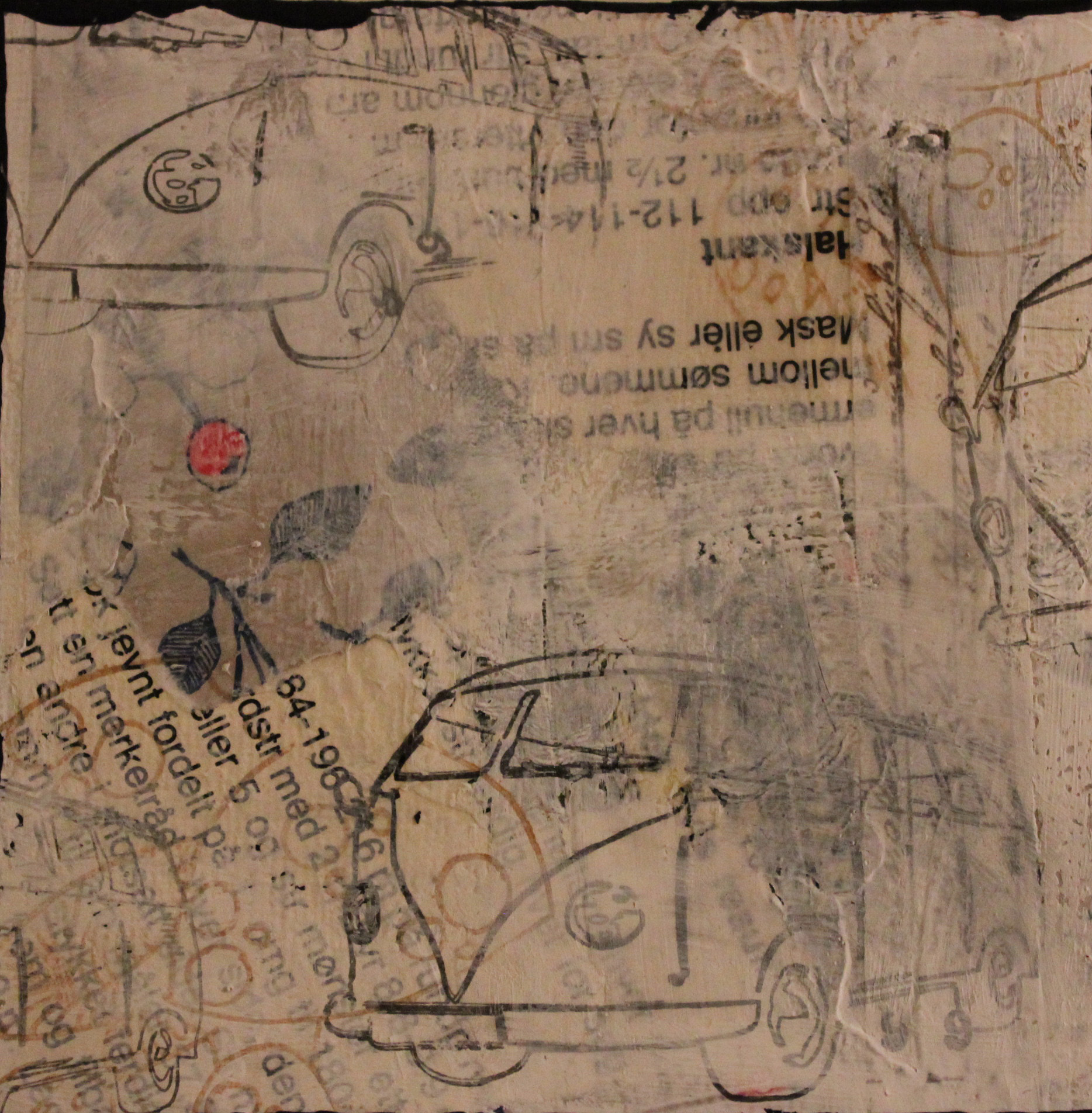 Ettersom det er mixed-media som er teknikken i mitt hjerte for tiden, er det også slik jeg går frem på disse små lerretene. Jeg lager først til en bakgrunn av ulike lag med papir, så litt gesso, stempler og enda mer gesso. Deretter velger jeg mellom pensler og akryl eller inktense fargeblyanter og blyanter. Her er noen bilder så langt: