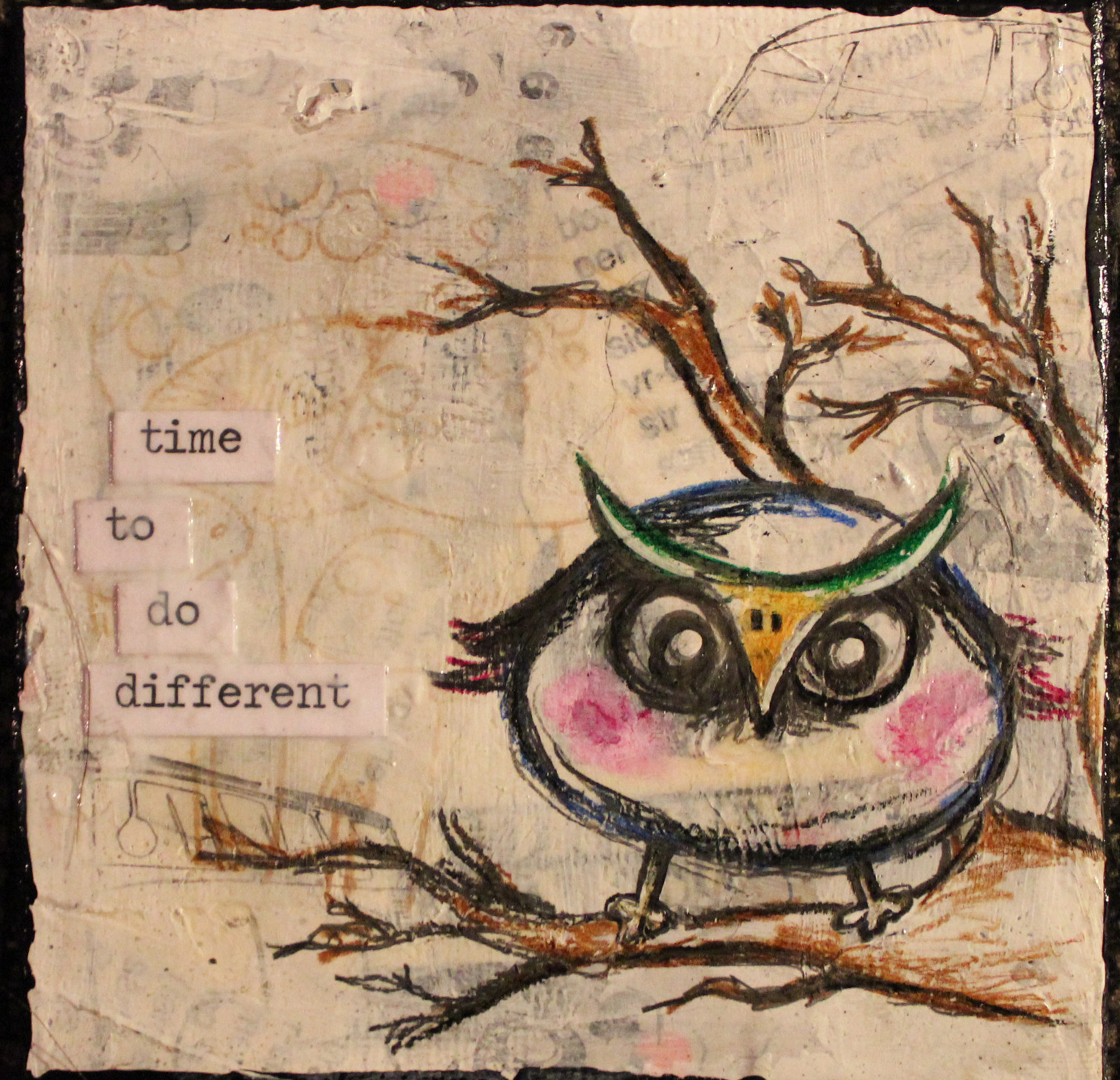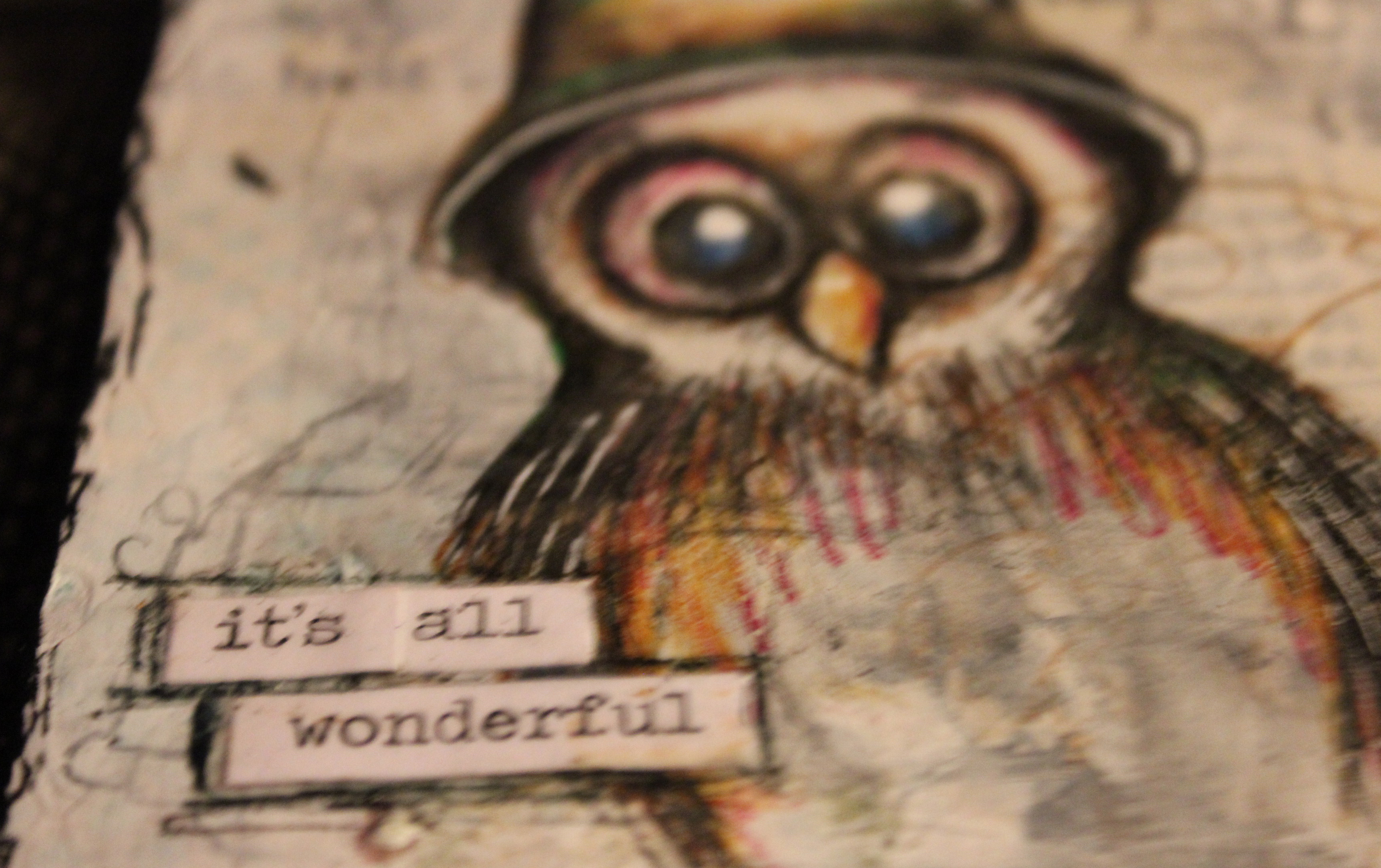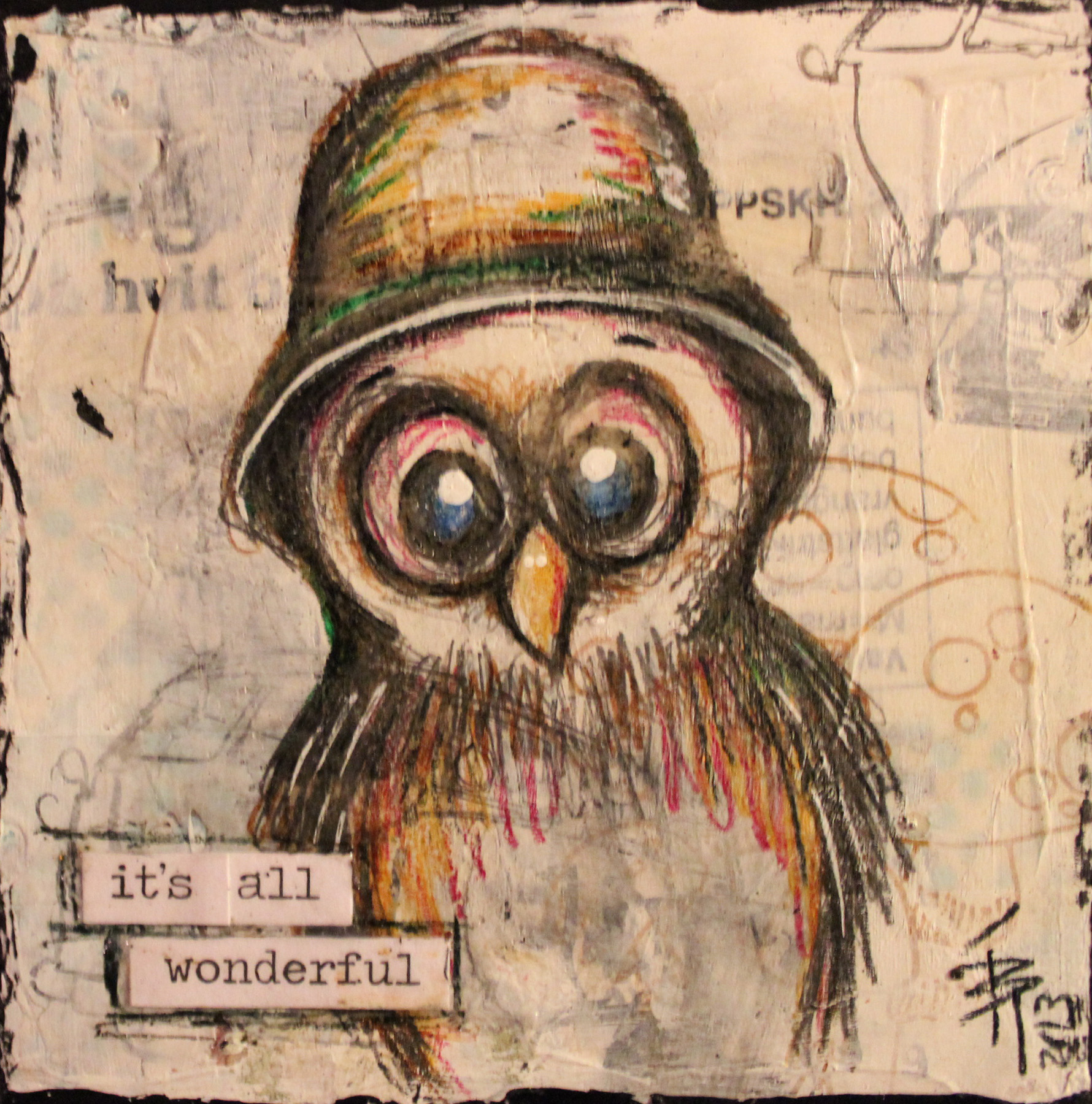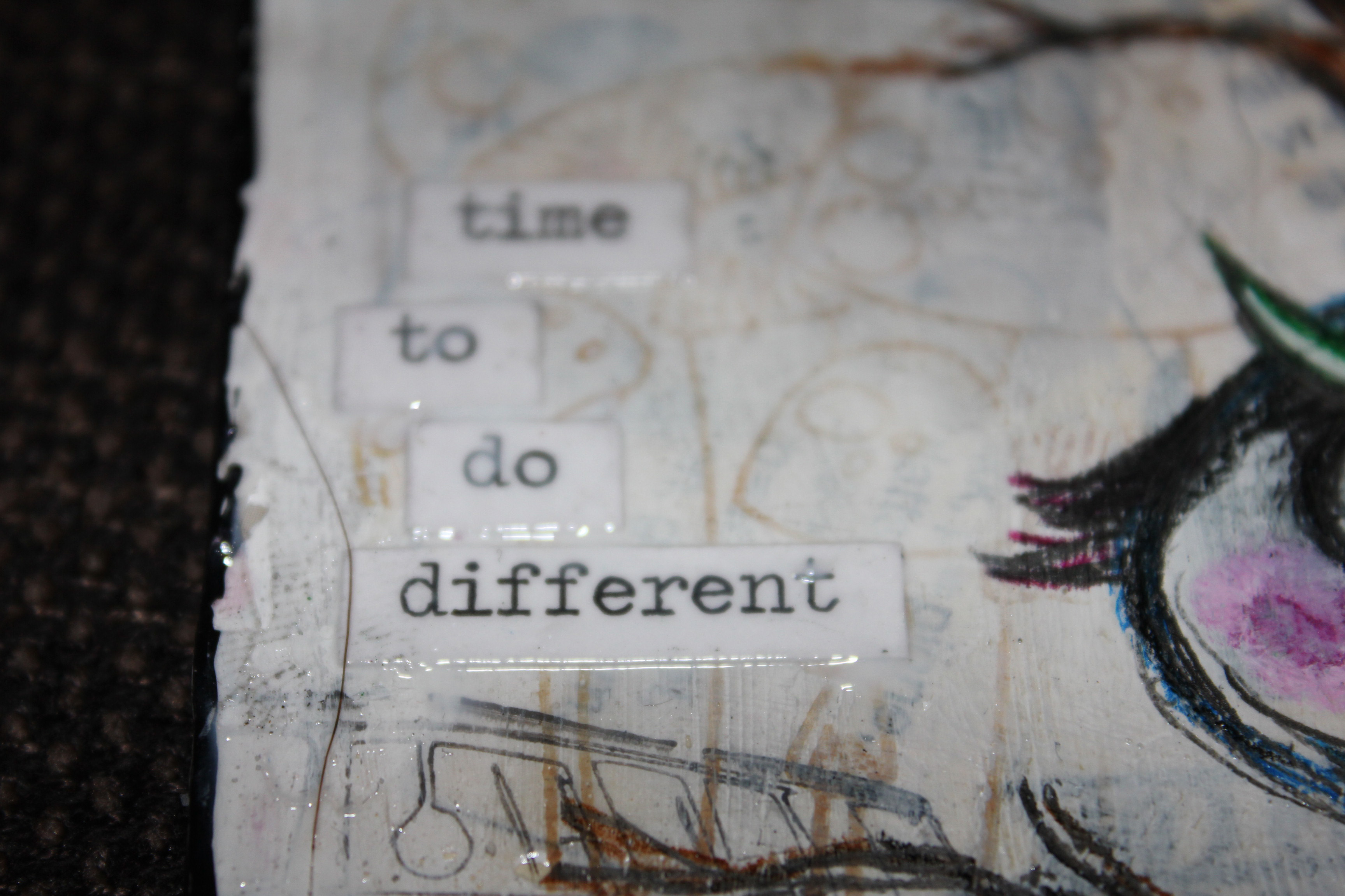 Uttrykkene på kunstverkene er ikke planlagt, men ganske så tilfeldige. Ordene kommer fra en av Tim Holtz’ idea-ology produkter: en blokk full av klistremerker av tilfeldige ord og her pleier jeg å finne et som kan passe bildet og så fortsetter jeg å se etter flere ord som kan danne et slags sitat/slagord. Så slik dukker de opp!
